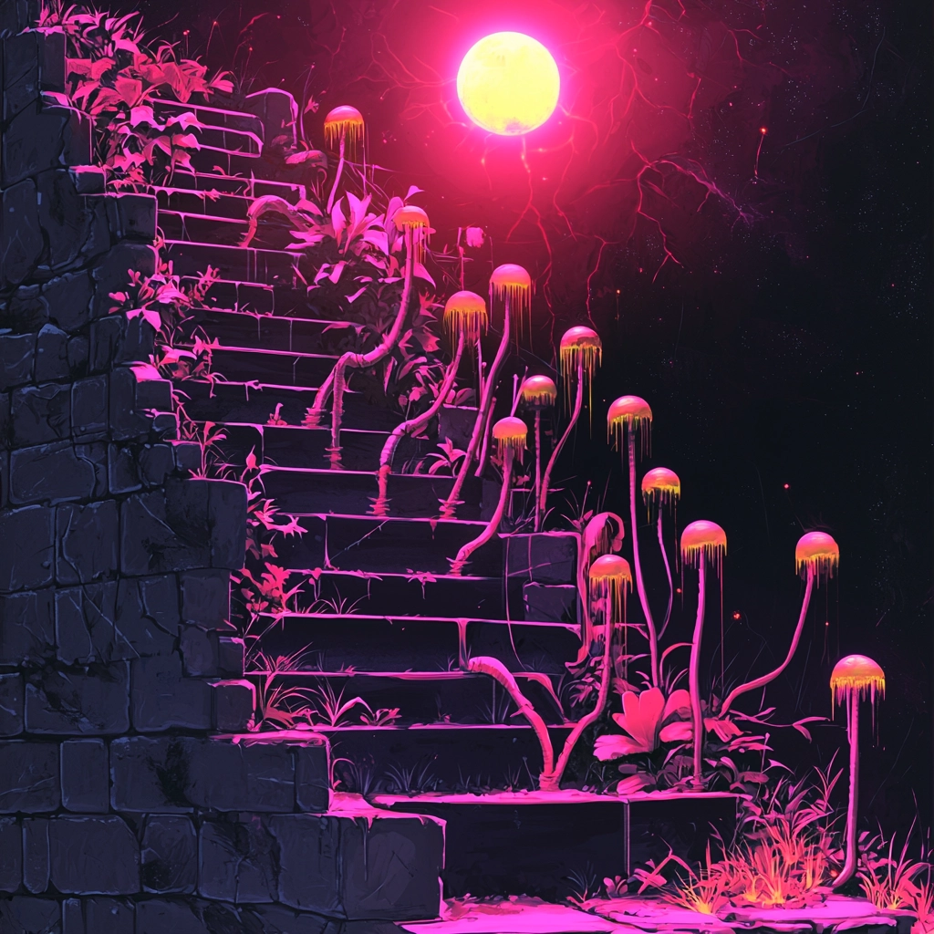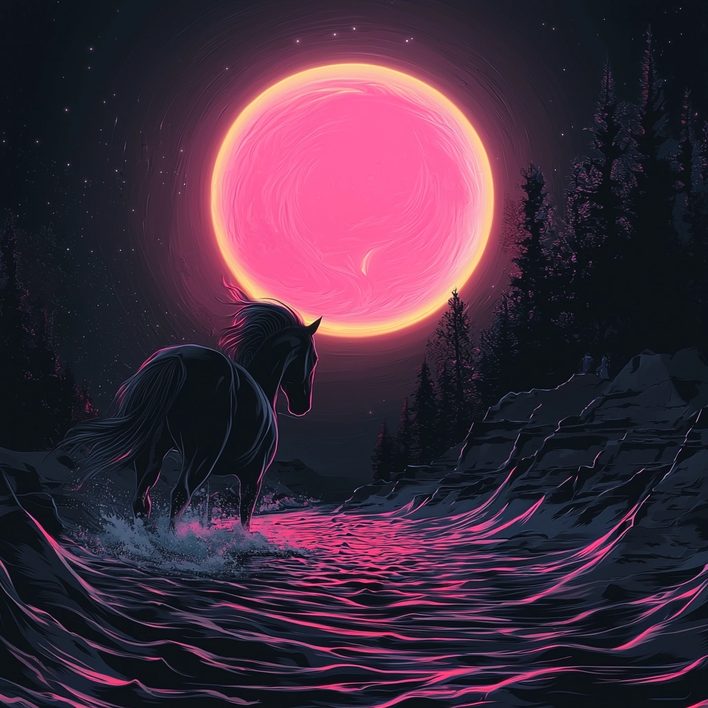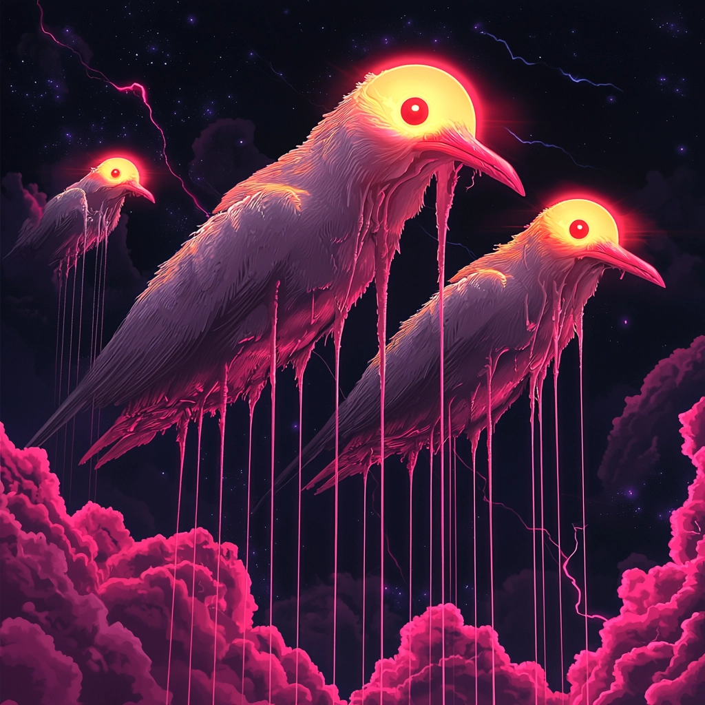 The artwork uses dynamic lighting with neon pinks contrasting sharply against deep blue backgrounds, creating an intense spatial depth. Textures emphasize fluid and flowing motions, reinforced by glowing elements and contrasting shadows.