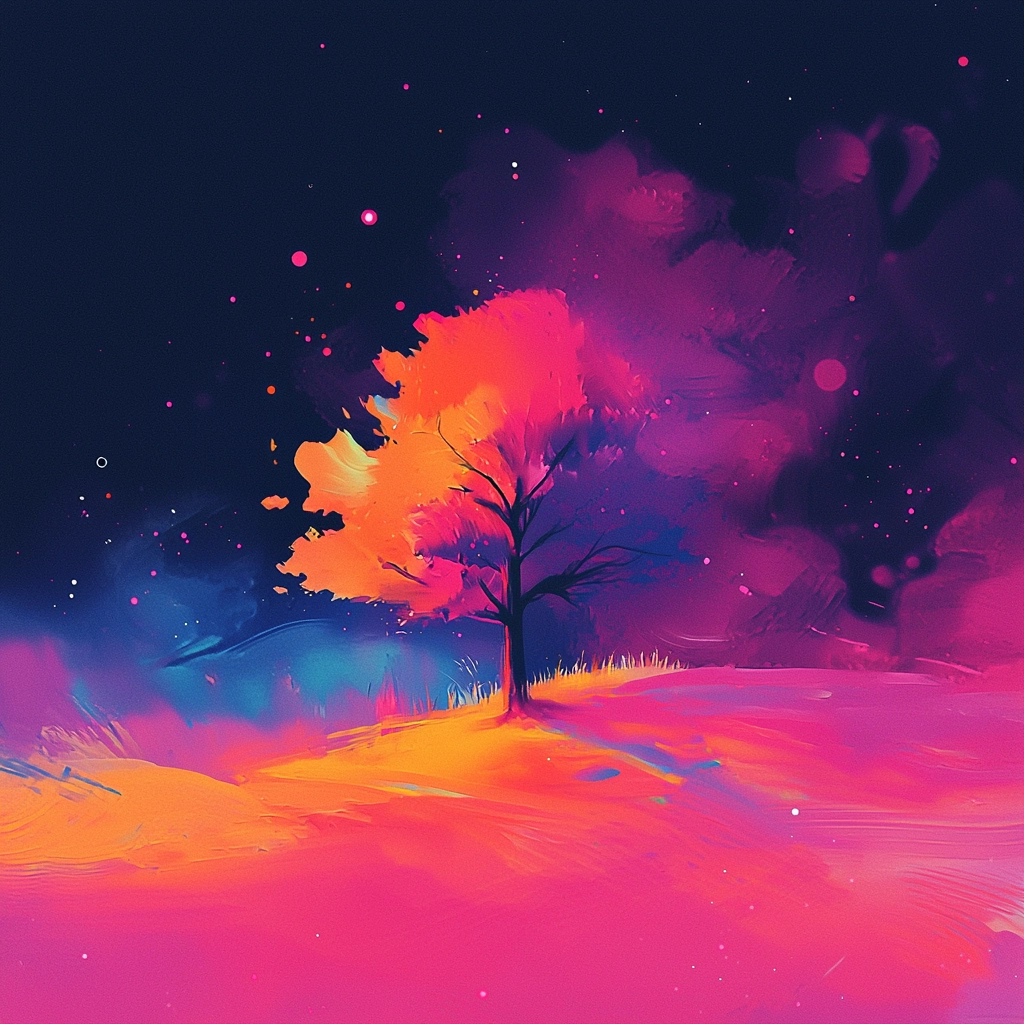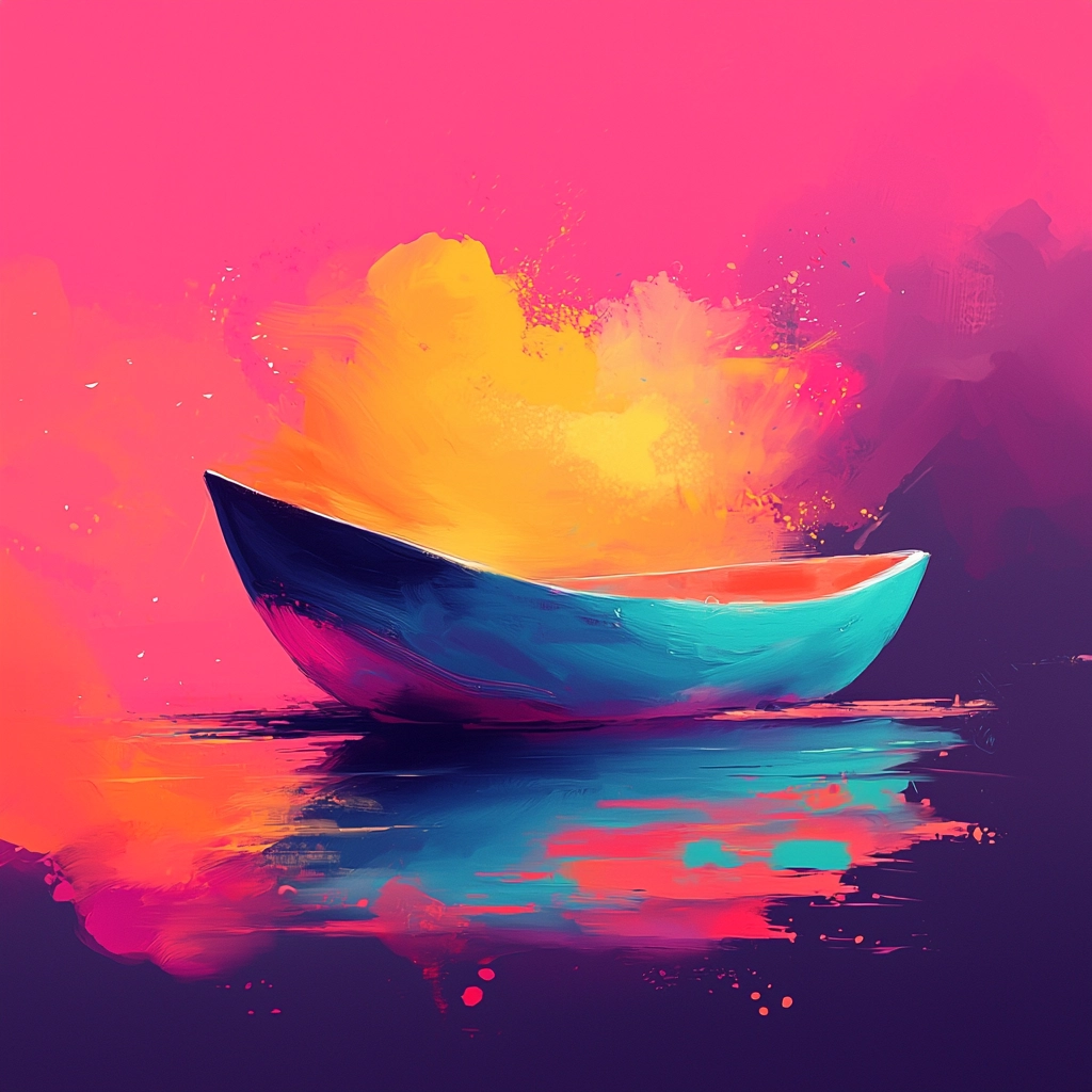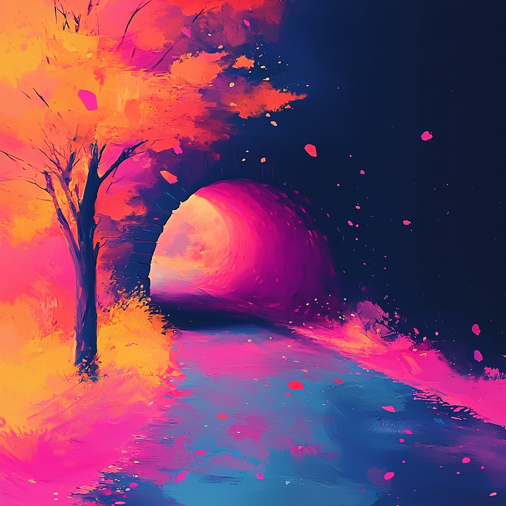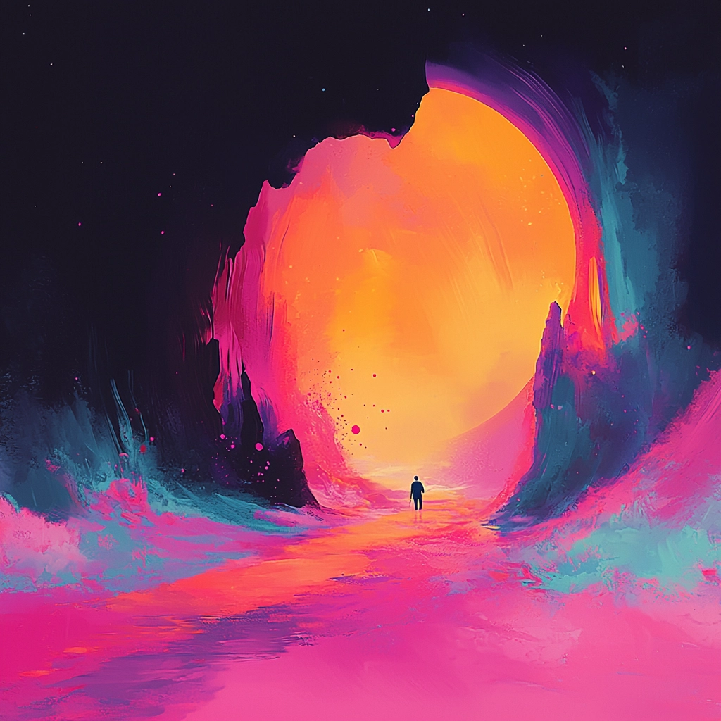 Bold lighting emphasized through intense gradient transitions and high color saturation. Textures are smooth with dynamic flow, while spatial depth is achieved through vibrant contrasts and perspective hints.