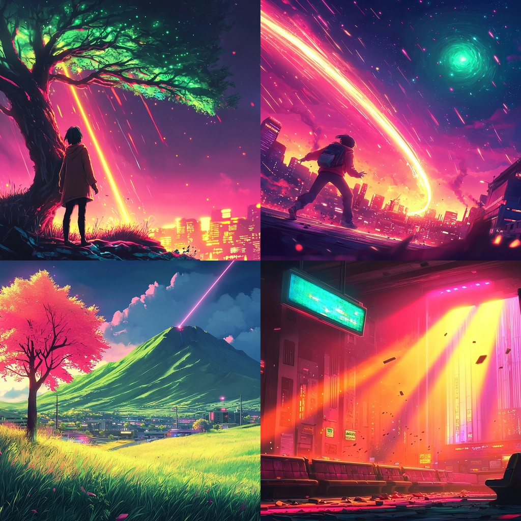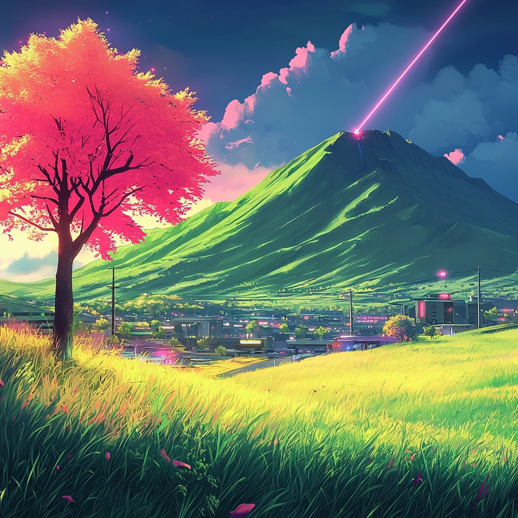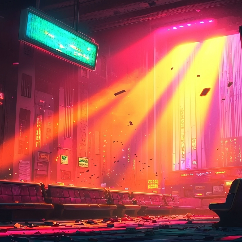 The use of vibrant neon lighting creates a dynamic interplay between dark and bright areas, enhancing depth and a sense of vastness. Gradual color transitions and fine textures are emphasized, lending a smooth but striking visual appeal.