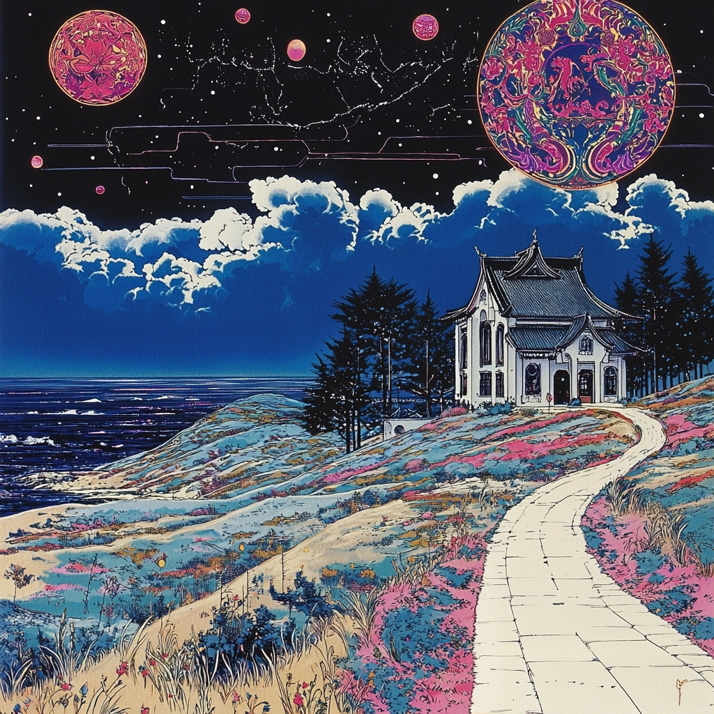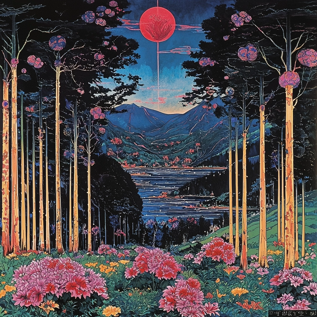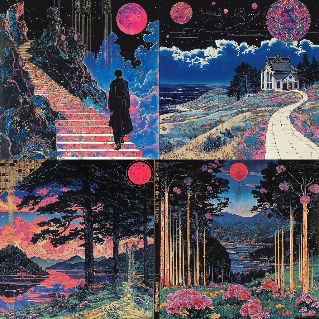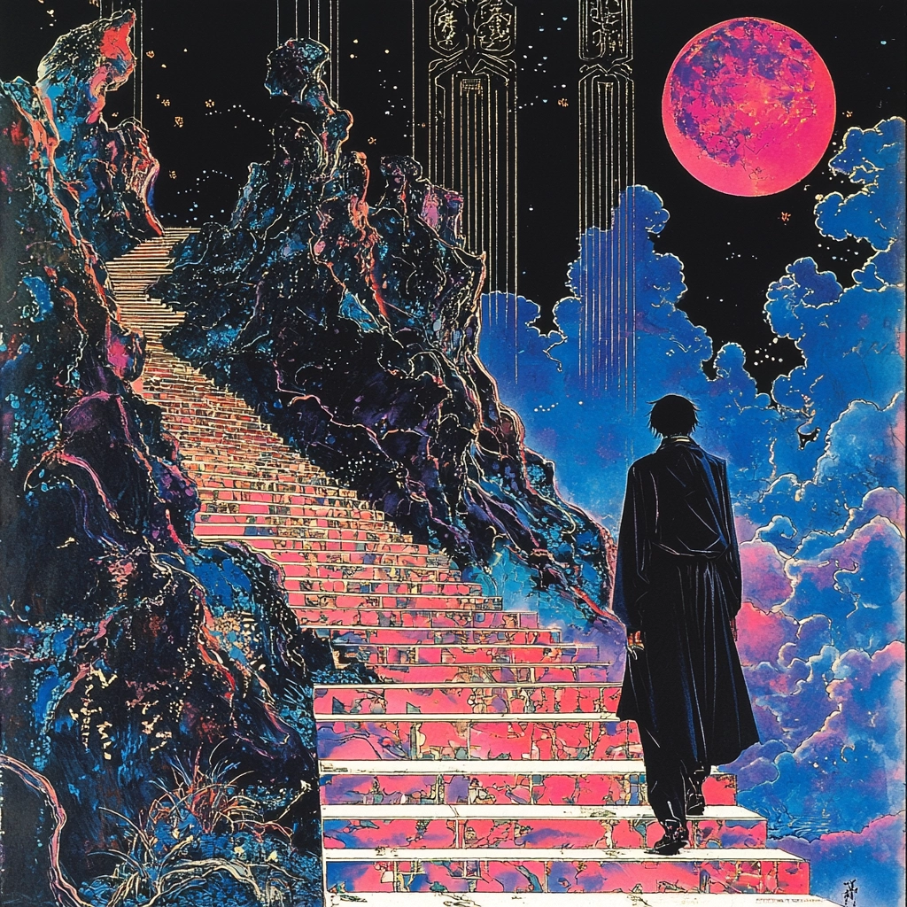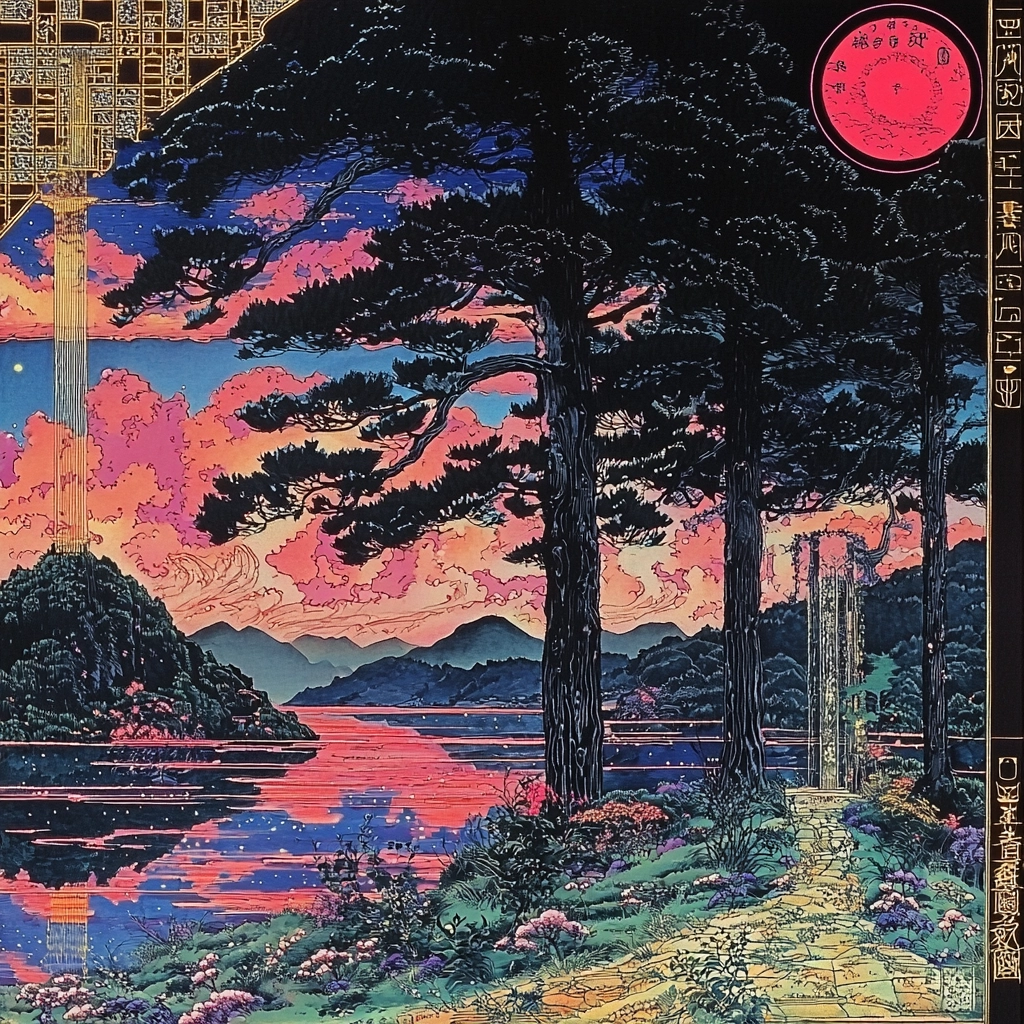 Strong neon-like gradients create vivid contrasts against deep black, accentuating objects with luminous contours. The spatial arrangement of light and dark shapes offers a dramatic visual journey with textured detailing.