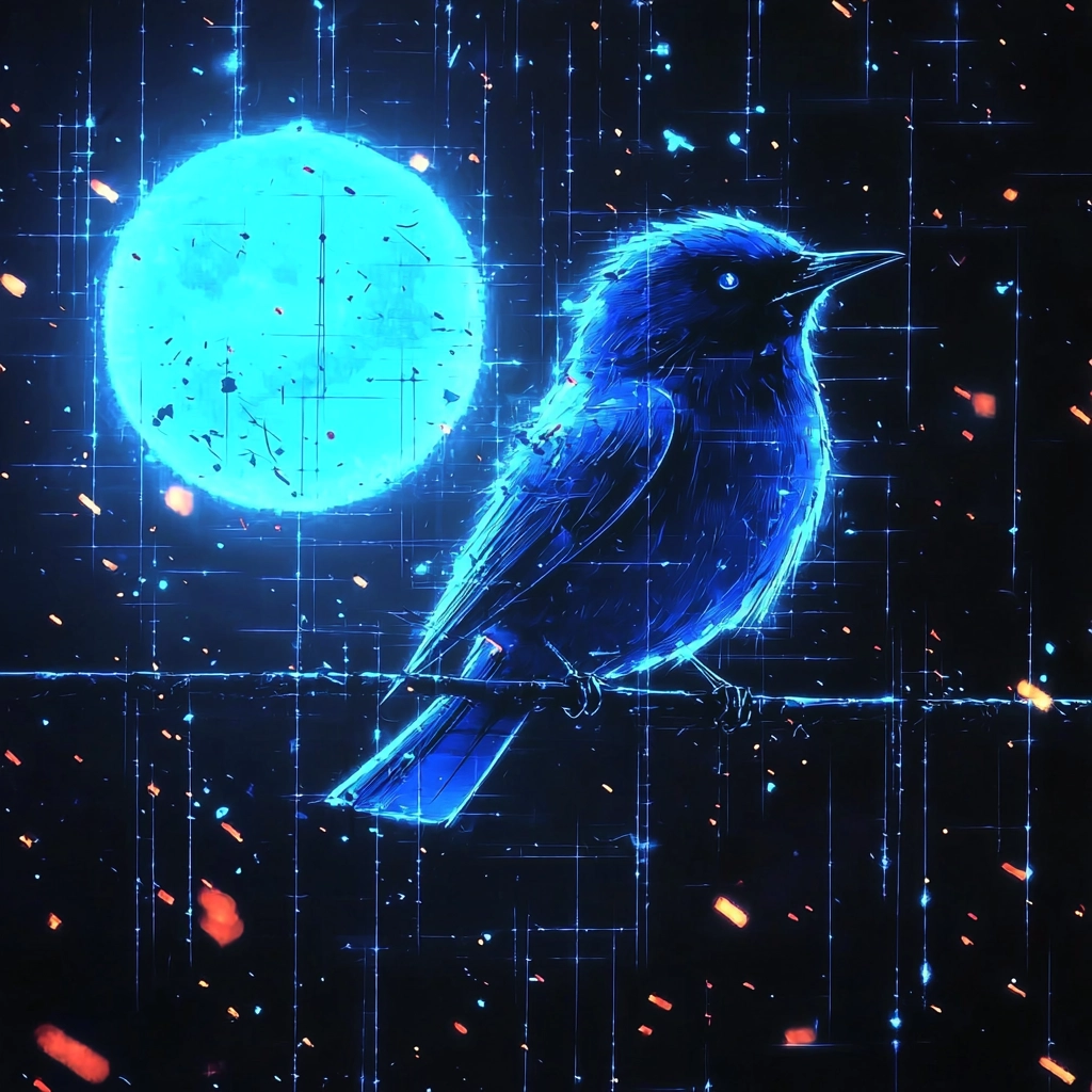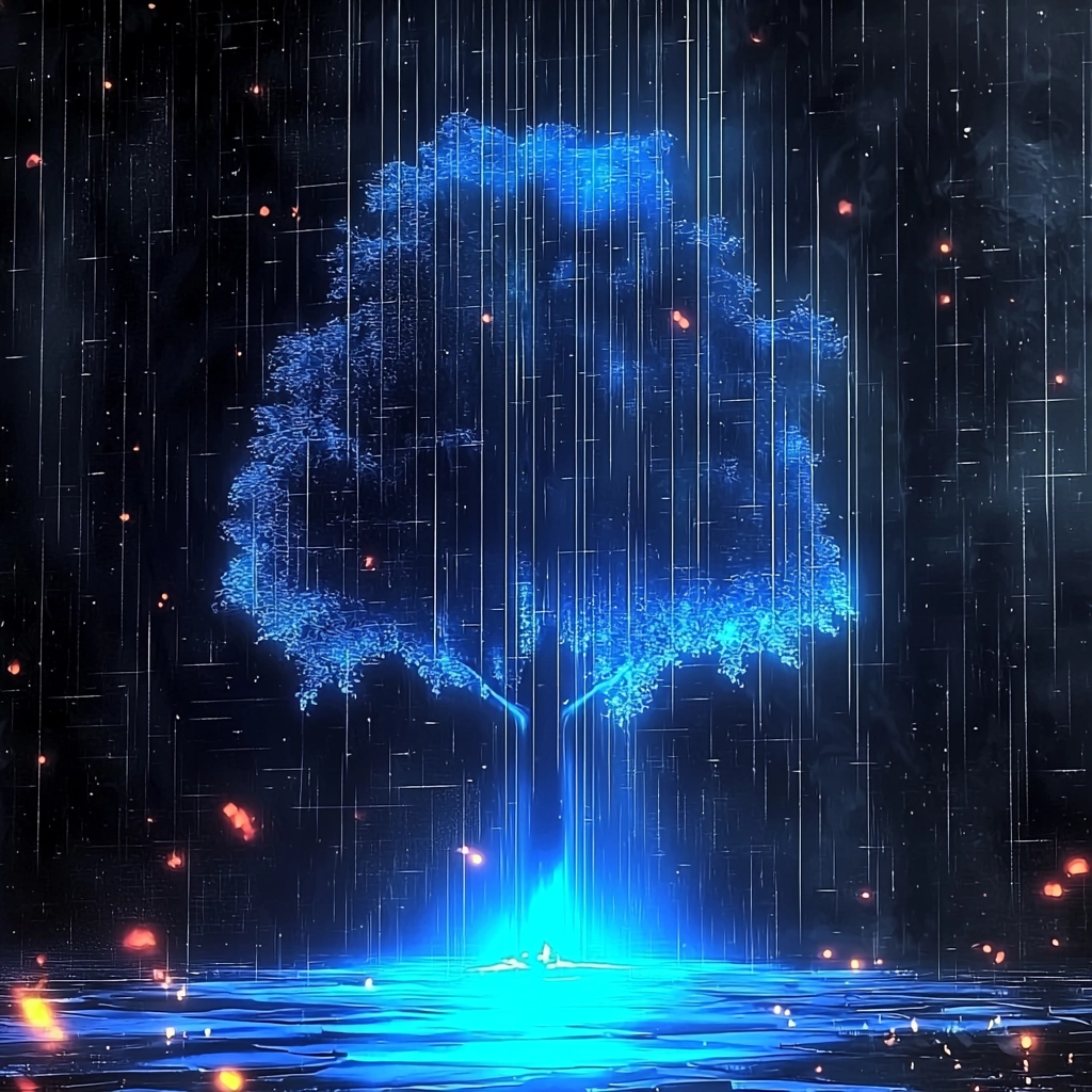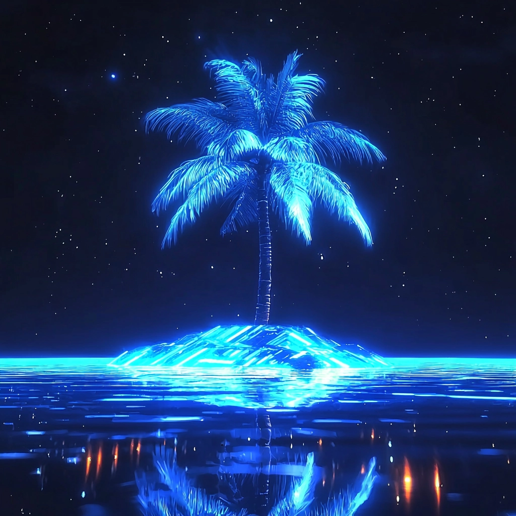 The lighting effects manifest as intensely glowing blue against deep black, causing a sense of depth and vibrancy. Yellow highlights enhance the luminous quality, while the sharp contrast emphasizes textures, adding a crispness and illumination to the forms.