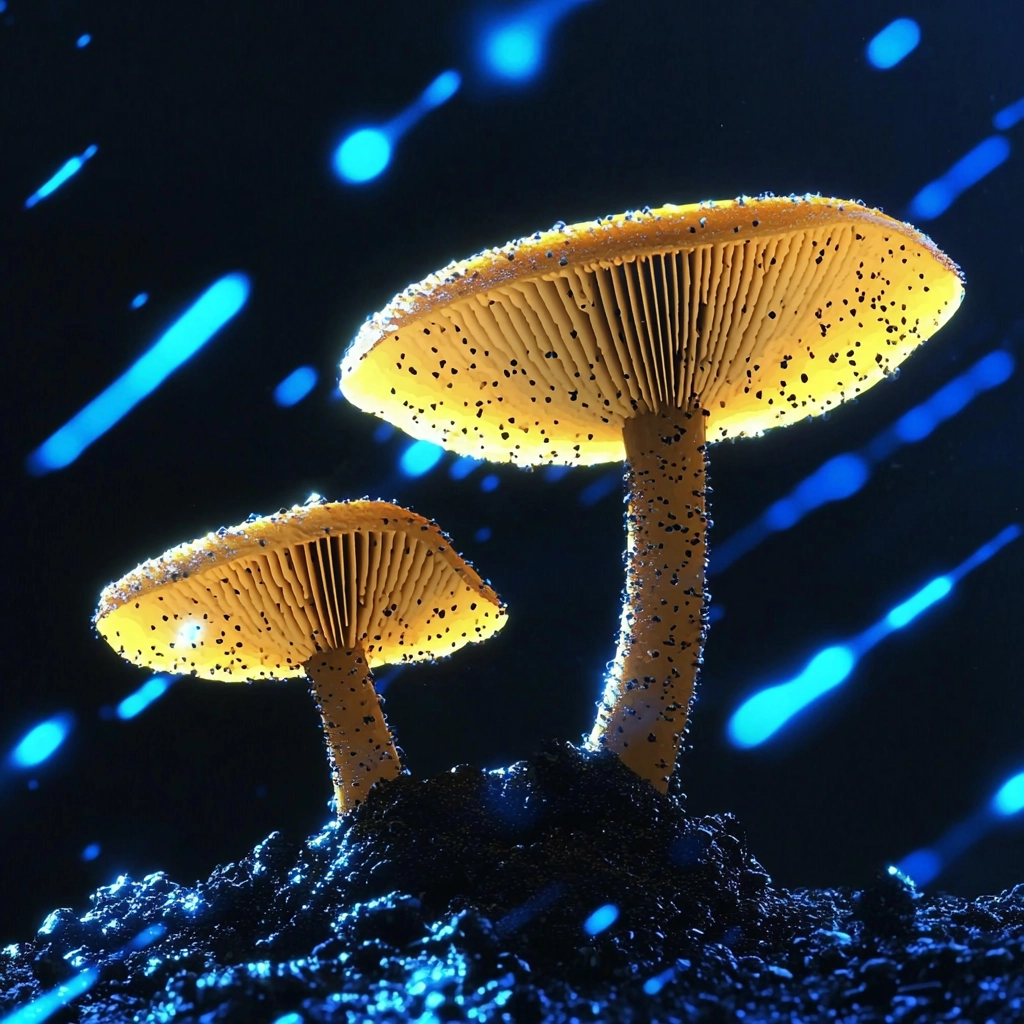 Intense blue glow contrasts sharply with vibrant yellow highlights, creating a striking visual effect with dark backgrounds.