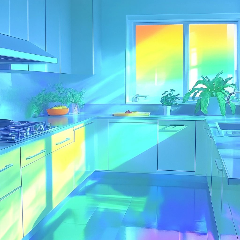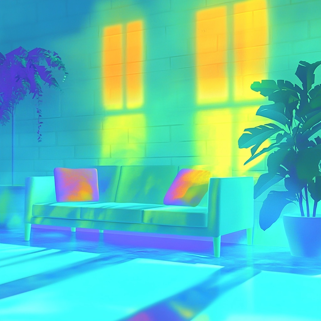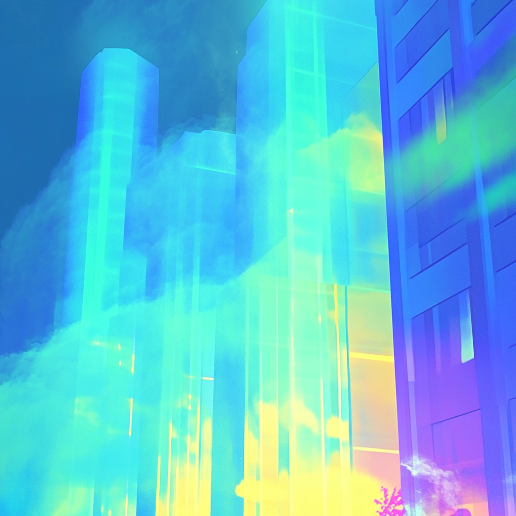 Lighting effects emphasize sharp neon hues and produce intense color gradients, creating distinct sections within the space. Fluorescent textures add a tactile quality and enhance spatial depth, giving a sense of layered perspectives.