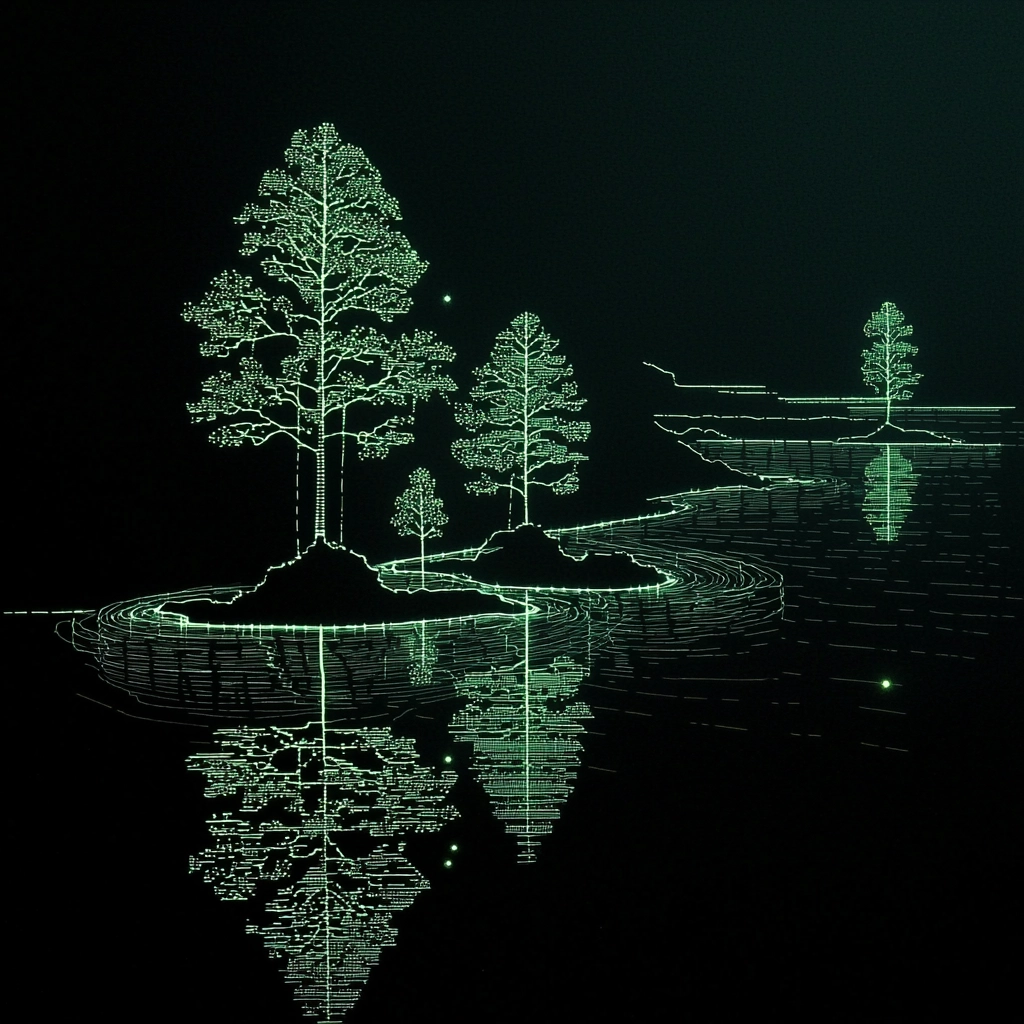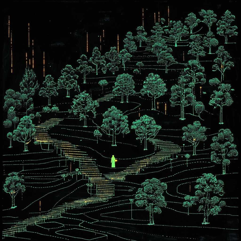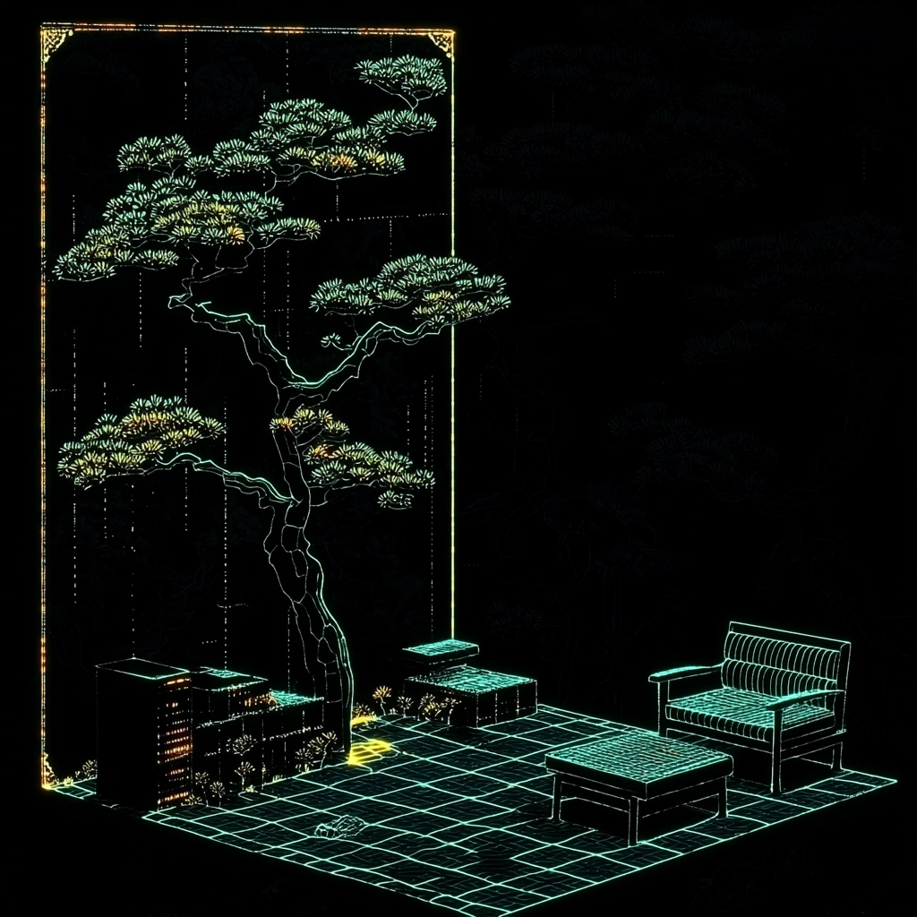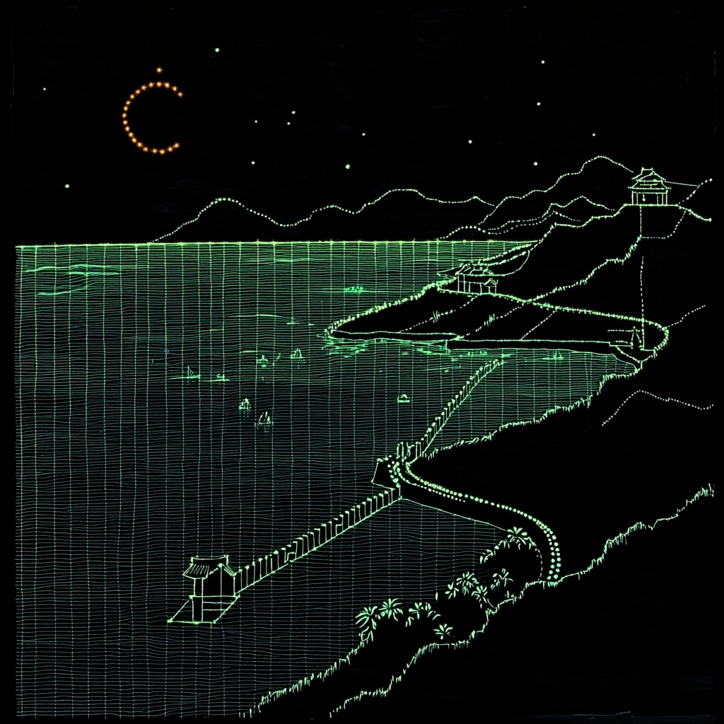 The glowing cyan contours are precise and controlled, creating a striking contrast with the blackness, utilizing negative space effectively. The textures appear smooth with clear linear detailing.