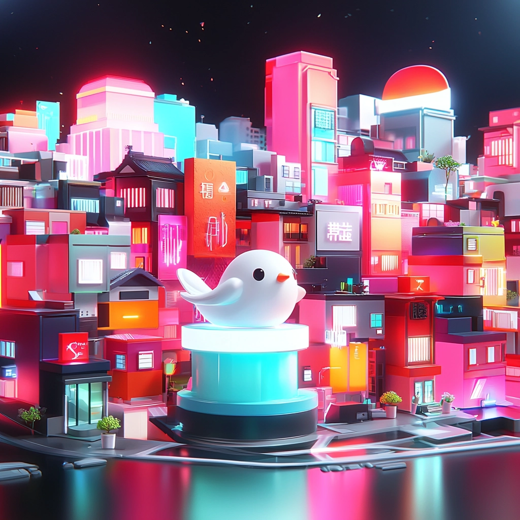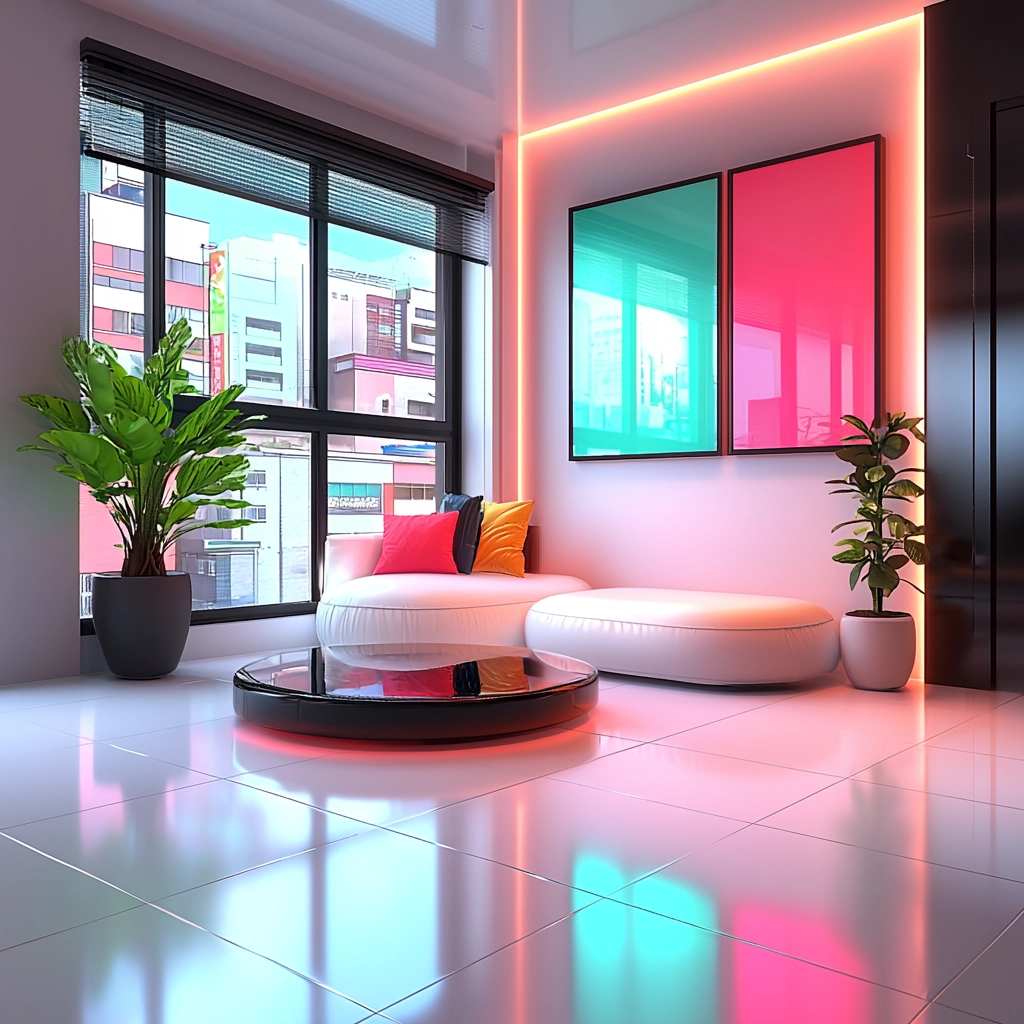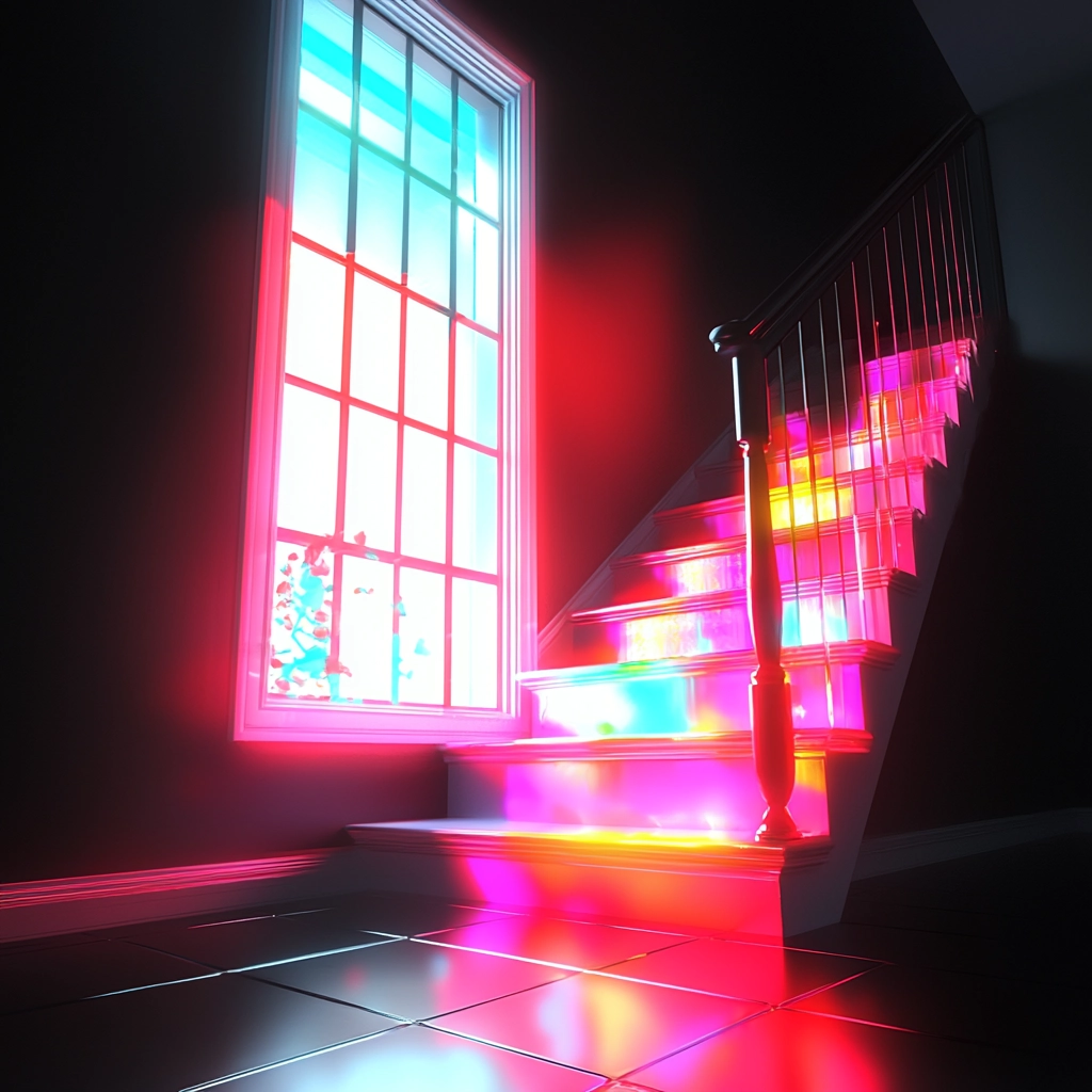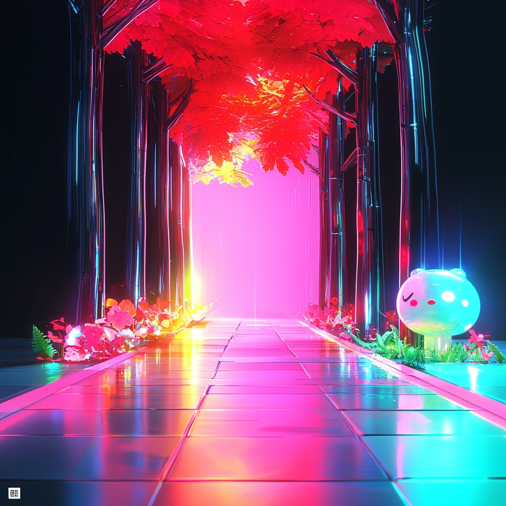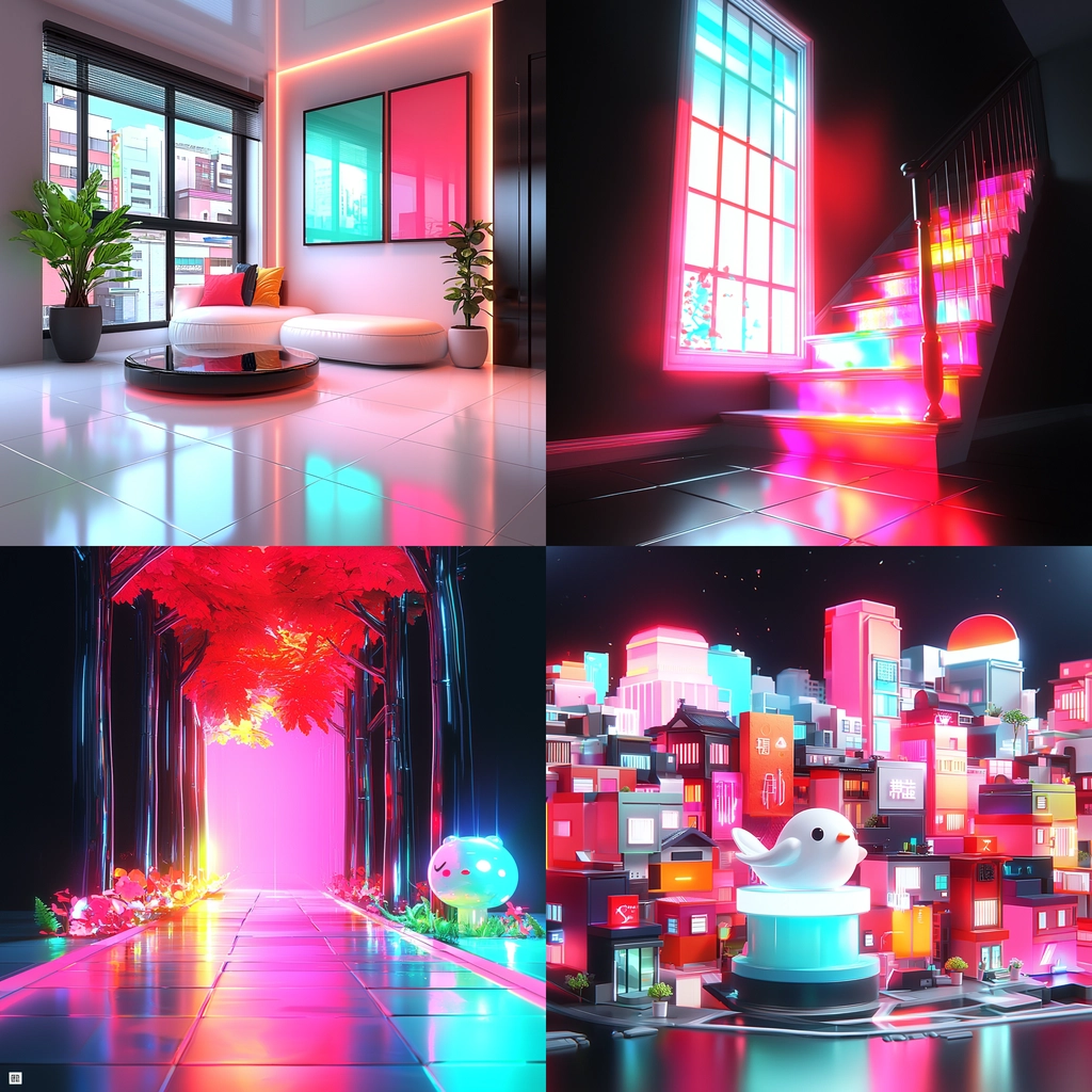 The lighting generates a glowing effect with intense brightness and varied hues. The colors are highly saturated, creating a striking visual impact. The spatial arrangement gives depth, while textures appear smooth and polished, enhancing the luminous qualities.