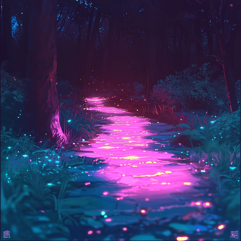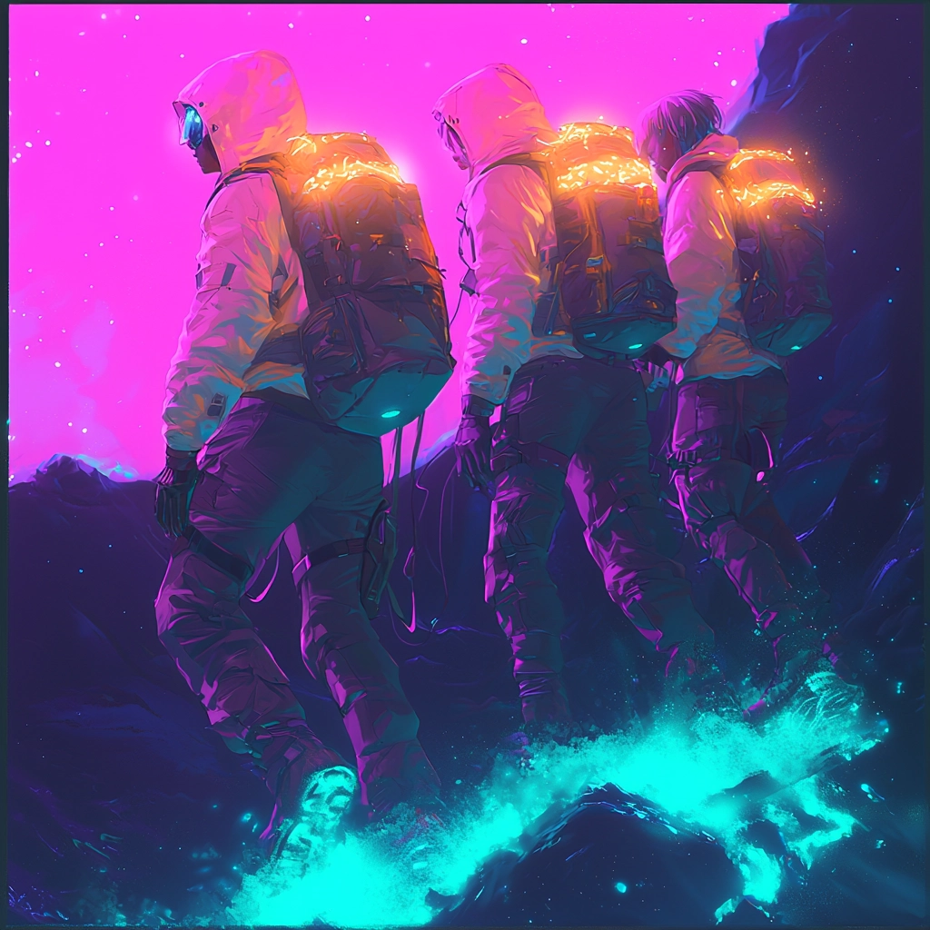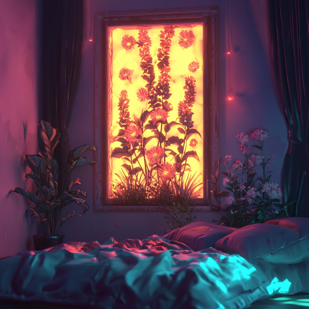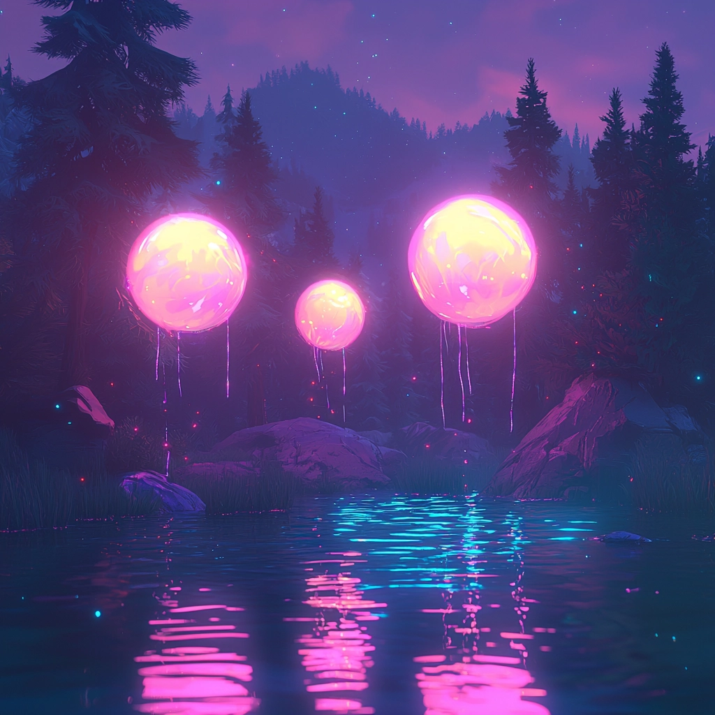Utilizes strong lighting effects that highlight contrasting vibrant neon colors, creating a vivid spatial depth. The textures are smooth and almost fluid, conveying a sense of movement and energy across the frames.