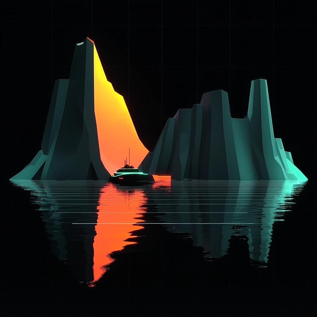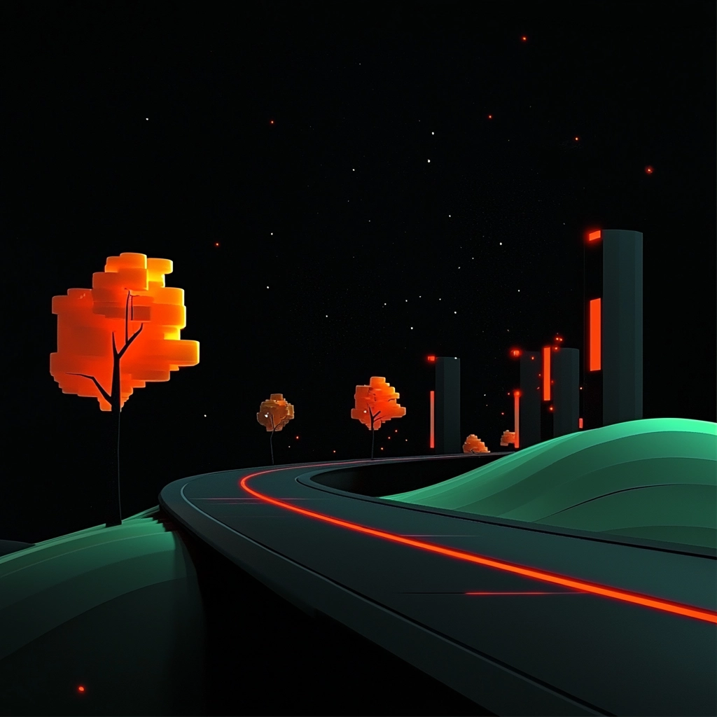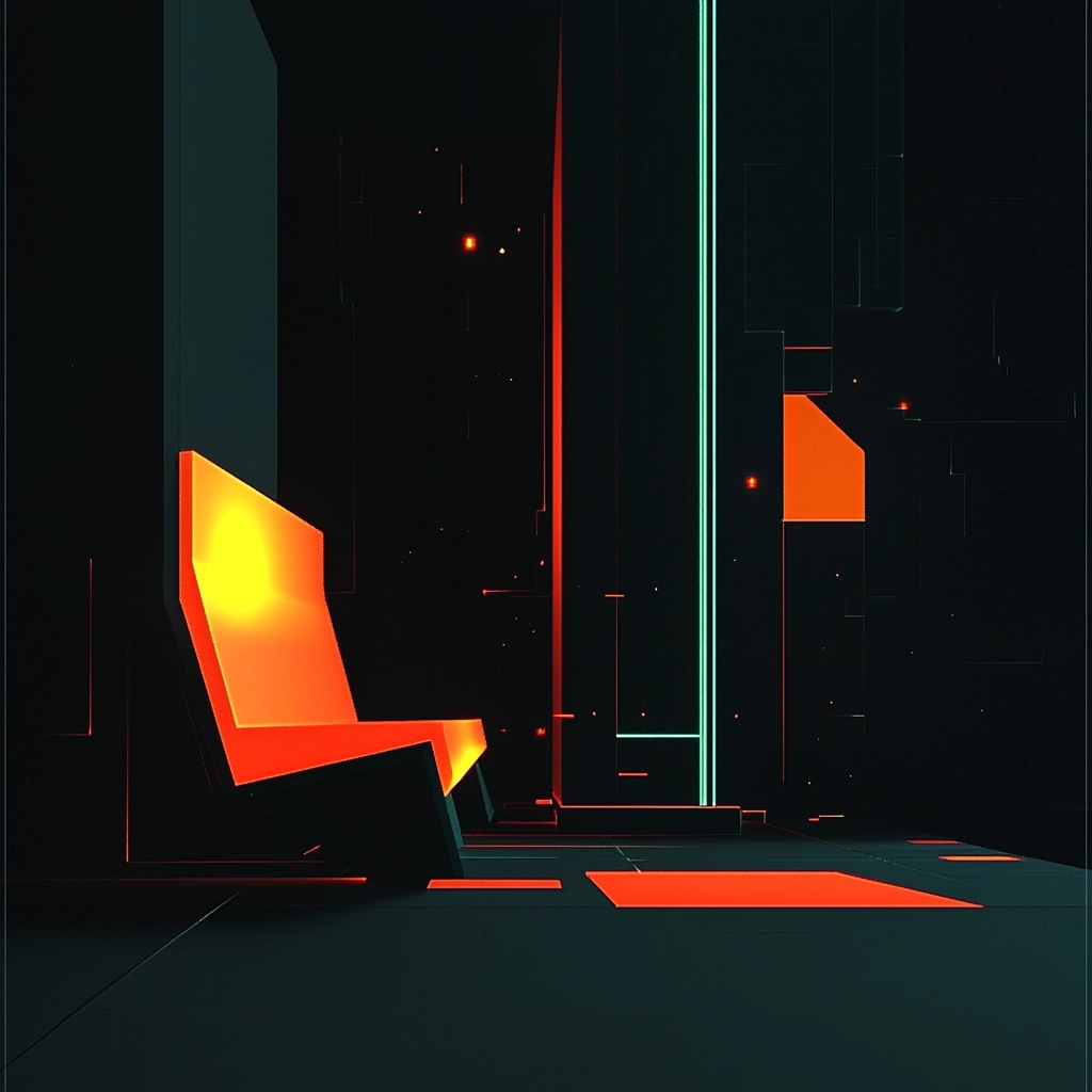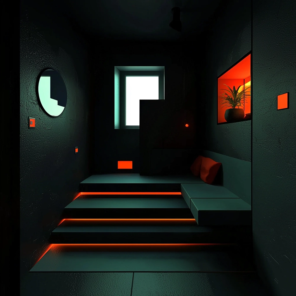 Intense lighting highlights the neon elements against deep black, with sharp contrasts enhancing the luminous effect. Flat spaces add a smooth texture, while minimalistic design amplifies color impact and defines spatial simplicity.