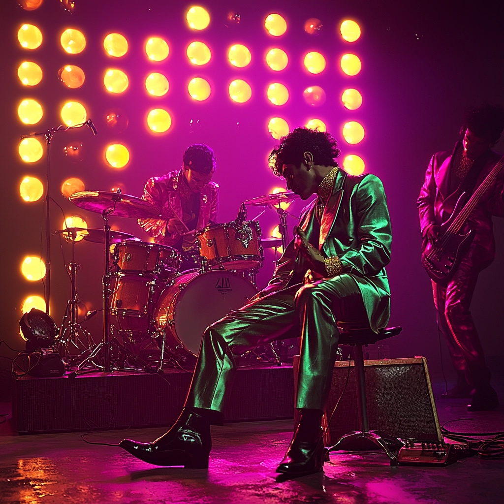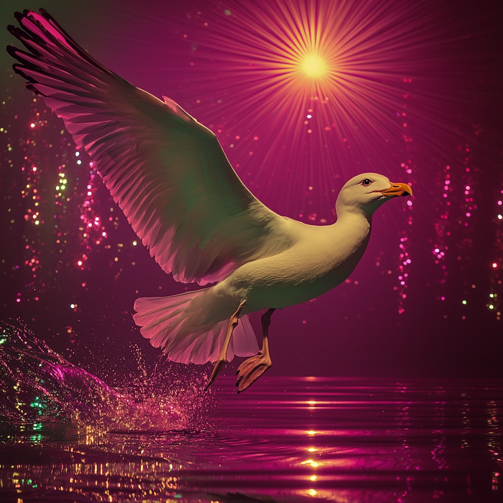 Vivid purples and greens dominate, punctuated by intense lighting effects.