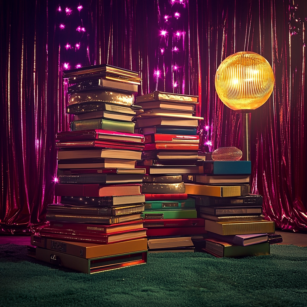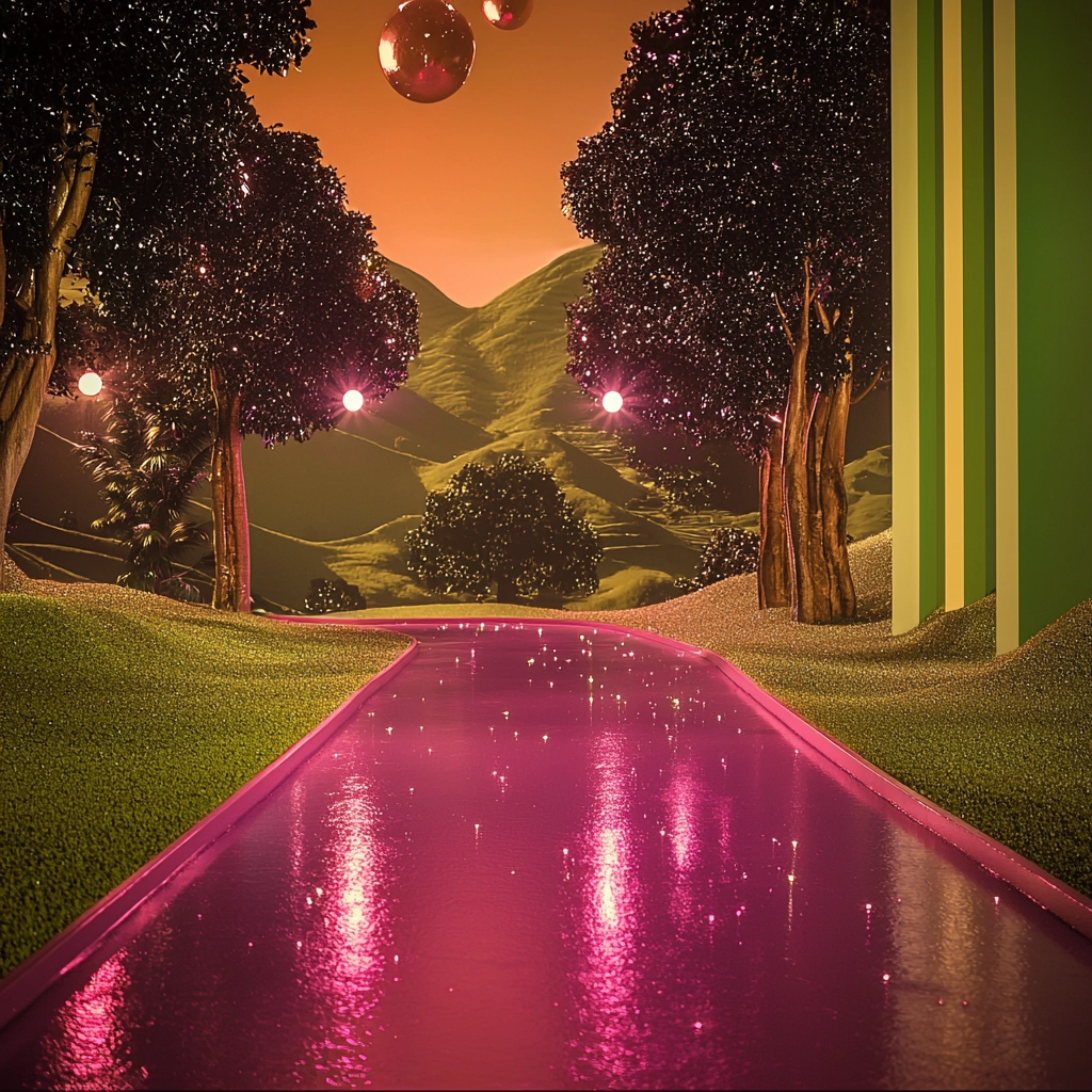 The use of lighting highlights the reflective surfaces, giving a sense of three-dimensional space. Colors are vibrant and heavily saturated, accentuating textures with a glossy finish, creating a dynamic interplay between light and shadow.