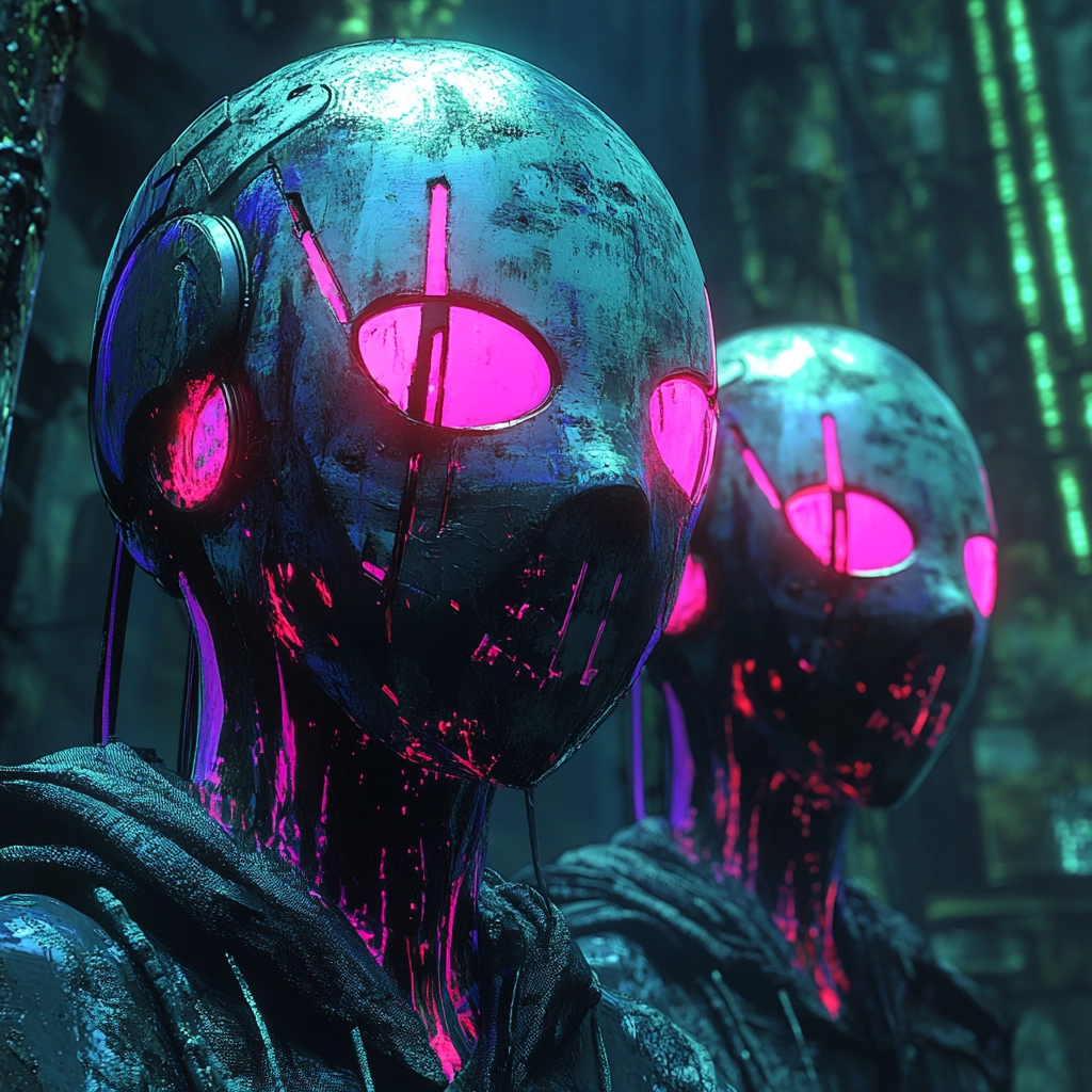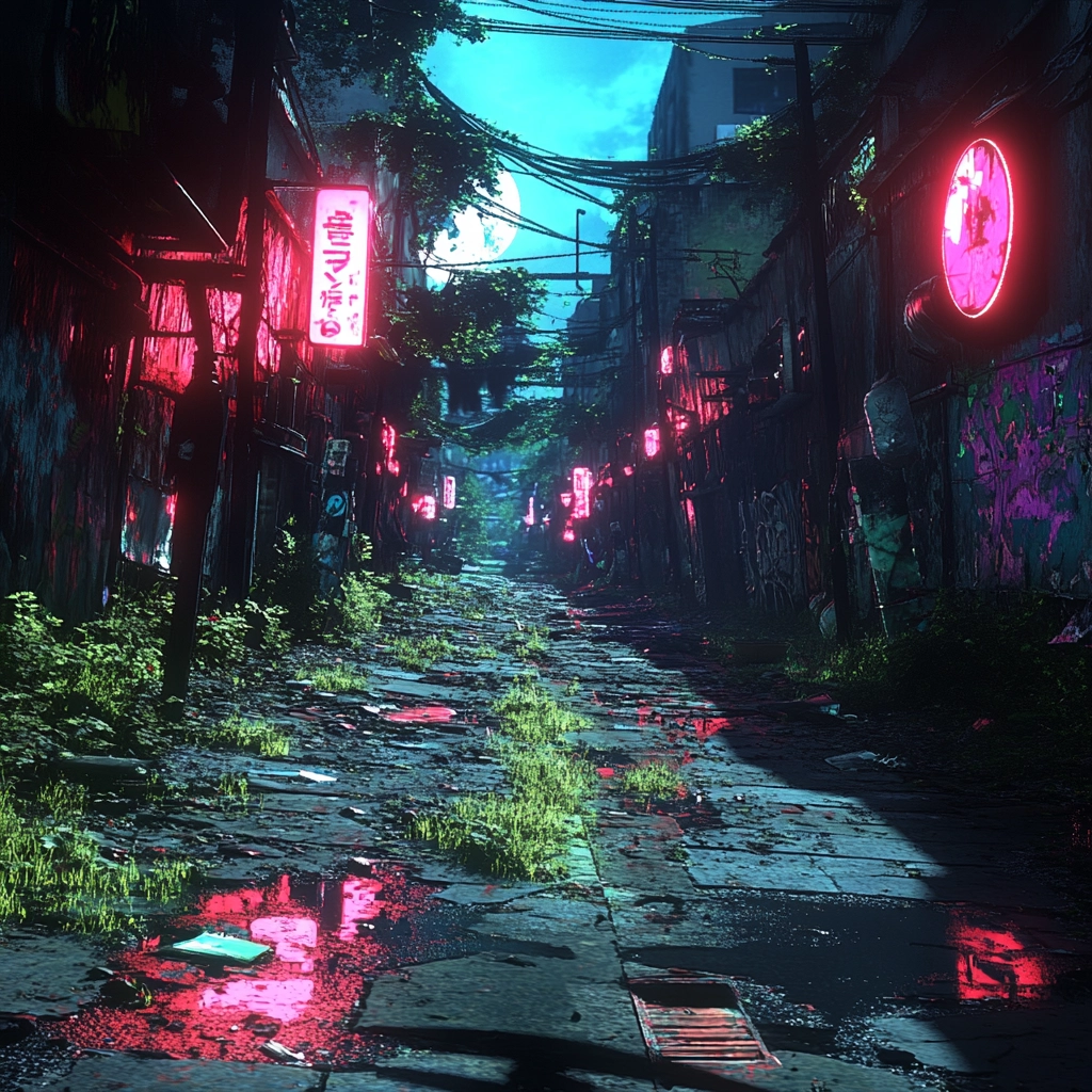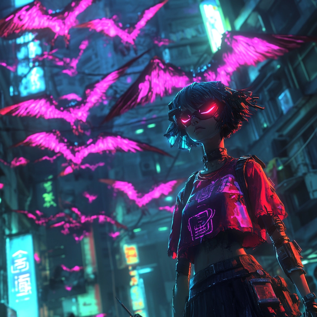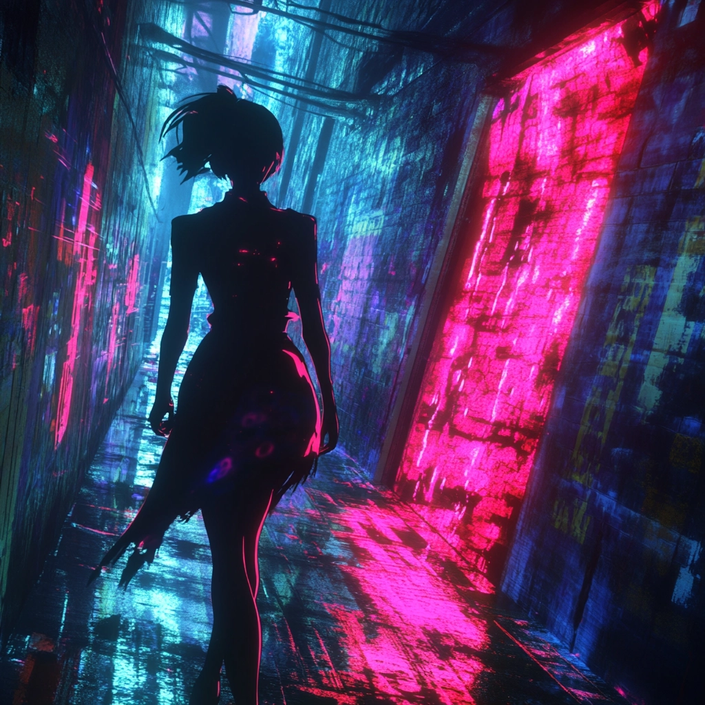 An interplay of vibrant neon and shadowy darkness defines the scene.
