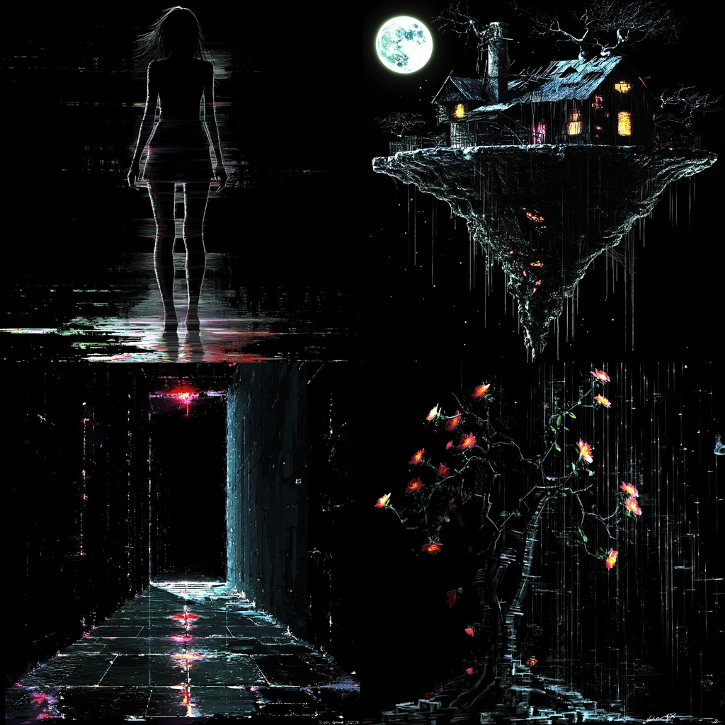 Contrasting darkness with punctuated neon highlights in surreal scenarios.