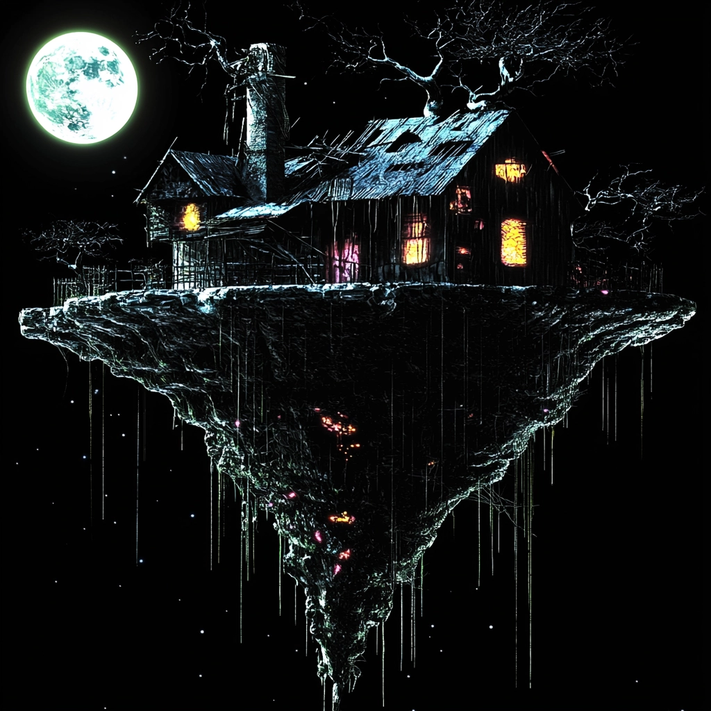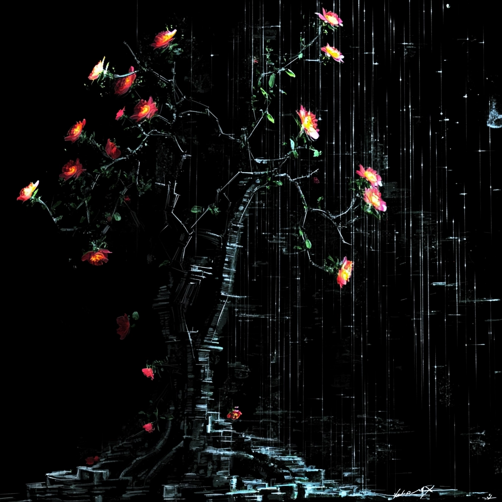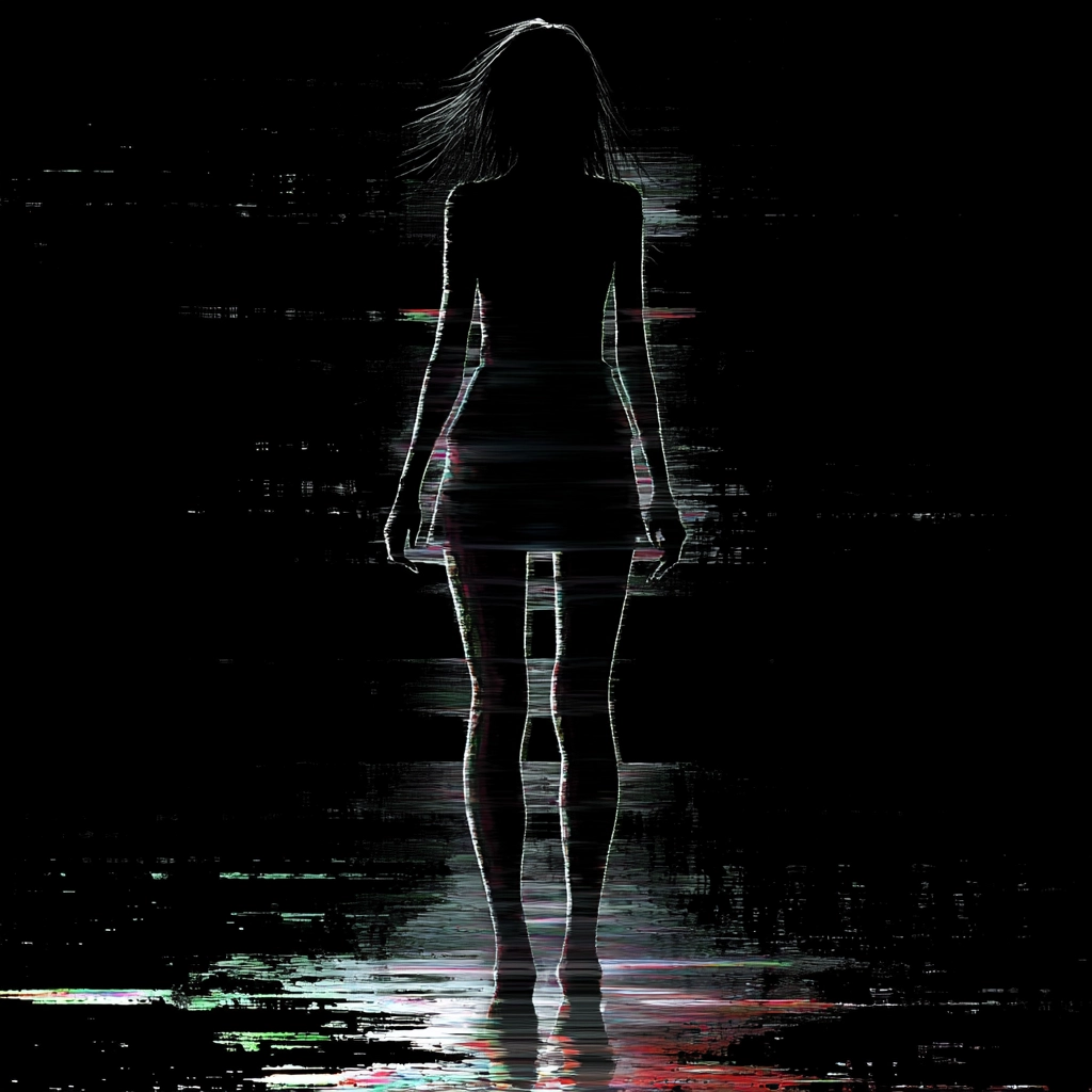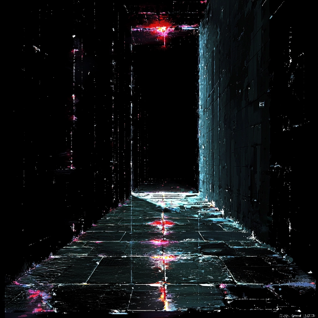 The lighting creates a stark contrast between dark backgrounds and brightly colored highlights, enhancing a dramatic atmosphere. The colors are vibrant yet sparse, imparting an unexpected depth. The texture is smooth but with digital noise, adding a sense of fragmentation.