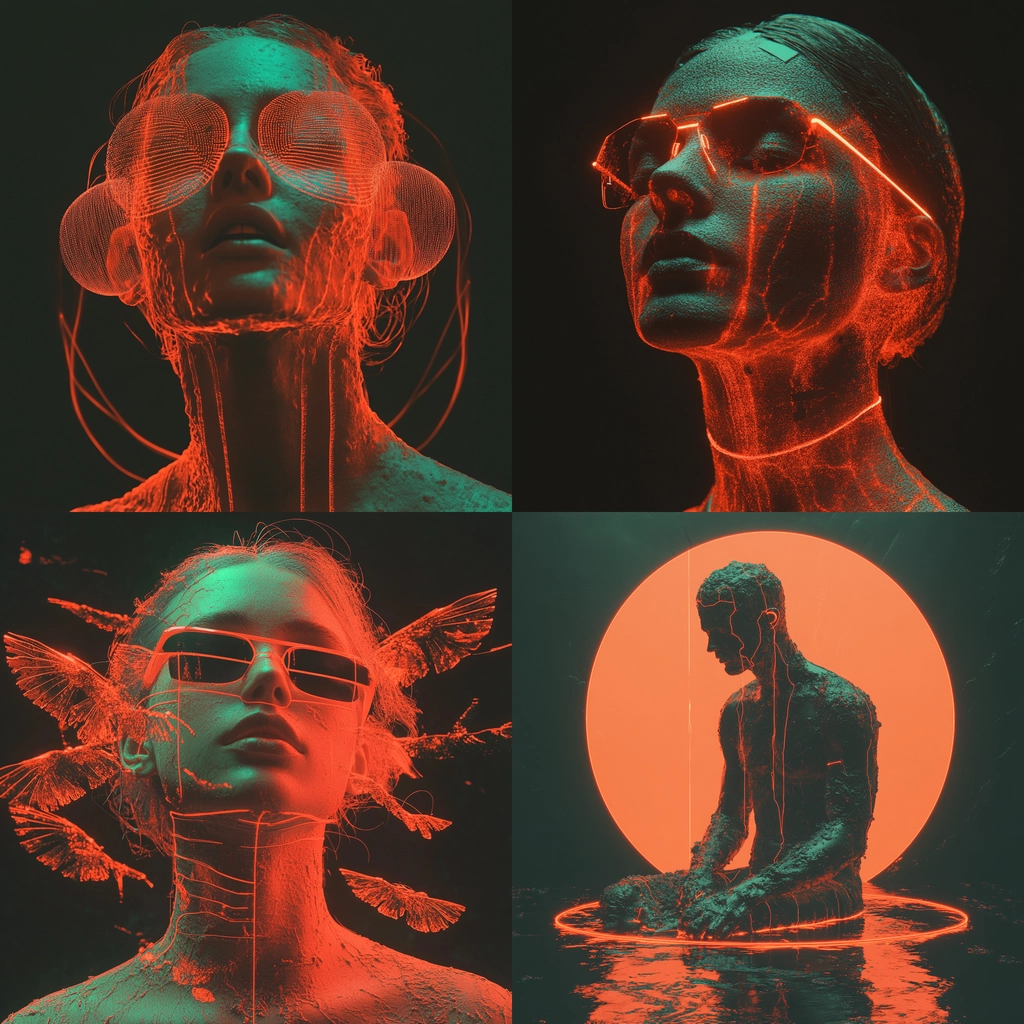 Use of glowing neon lines contrasts sharply with the deep black backdrop, outlining forms with intricate precision. The texture varies from smooth surfaces to rough, natural elements, creating a dynamic interplay of light and shadow. Spatially, the compositions have a deep, immersive quality.