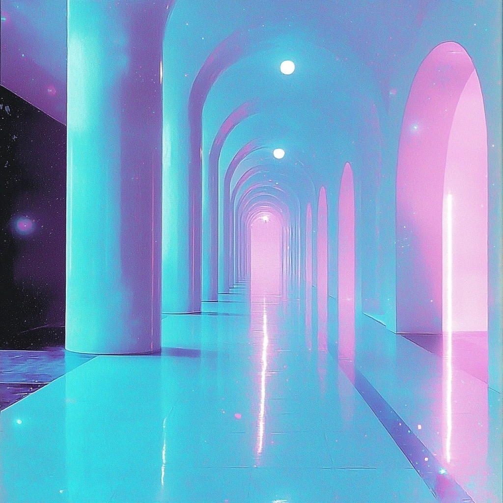 The lighting is sharp, highlighting contrast between the vibrant cyan and pink, creating a radiant glow effect. The digital precision adds a smooth texture, with a sense of depth achieved through overlays and perspective lines.