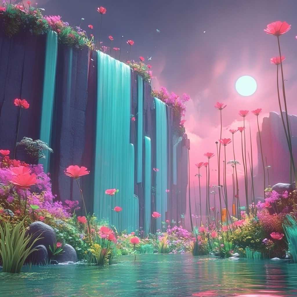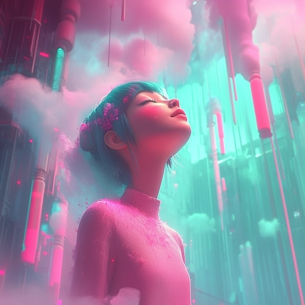 Vibrant neon colors blend with soft pastels, creating a futuristic ambiance through surreal compositions.