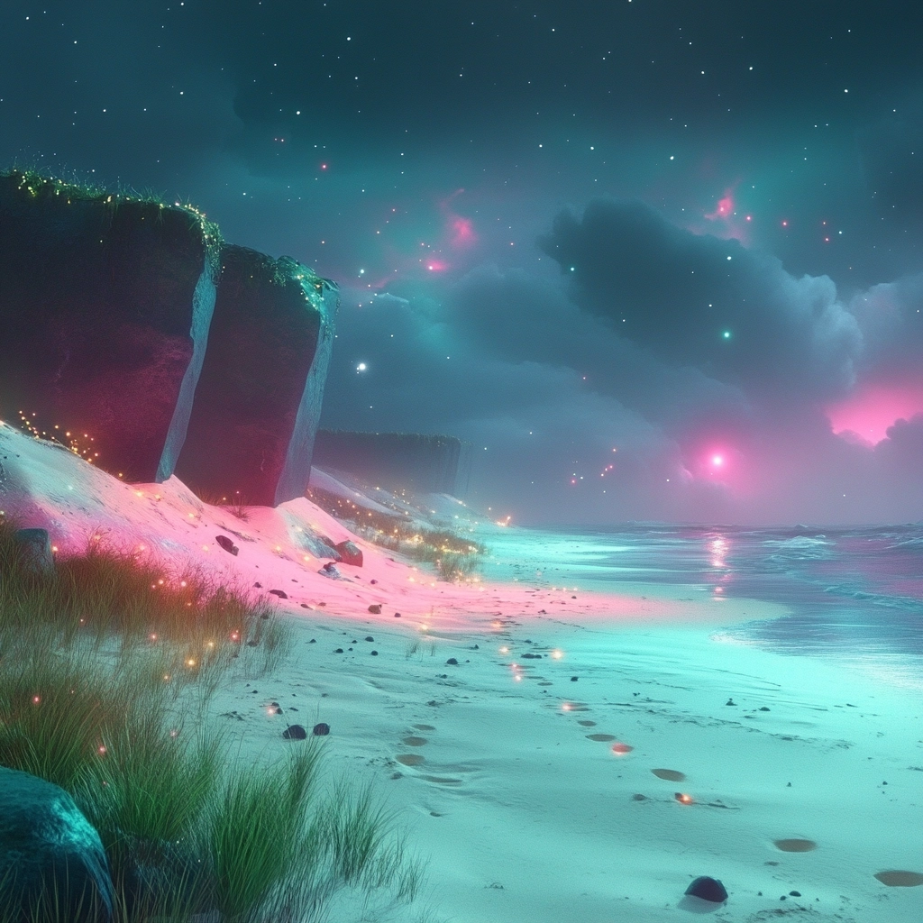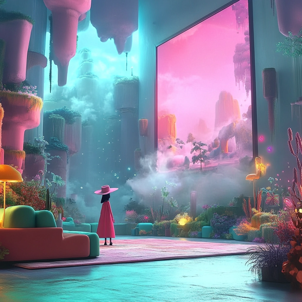 Dynamic lighting effects are achieved through neon glows, illuminating soft pastel hues with a futuristic twist. Textures vary from smooth, digital surfaces to more tactile, organic patterns, enhancing spatial depth and whimsical compositions.