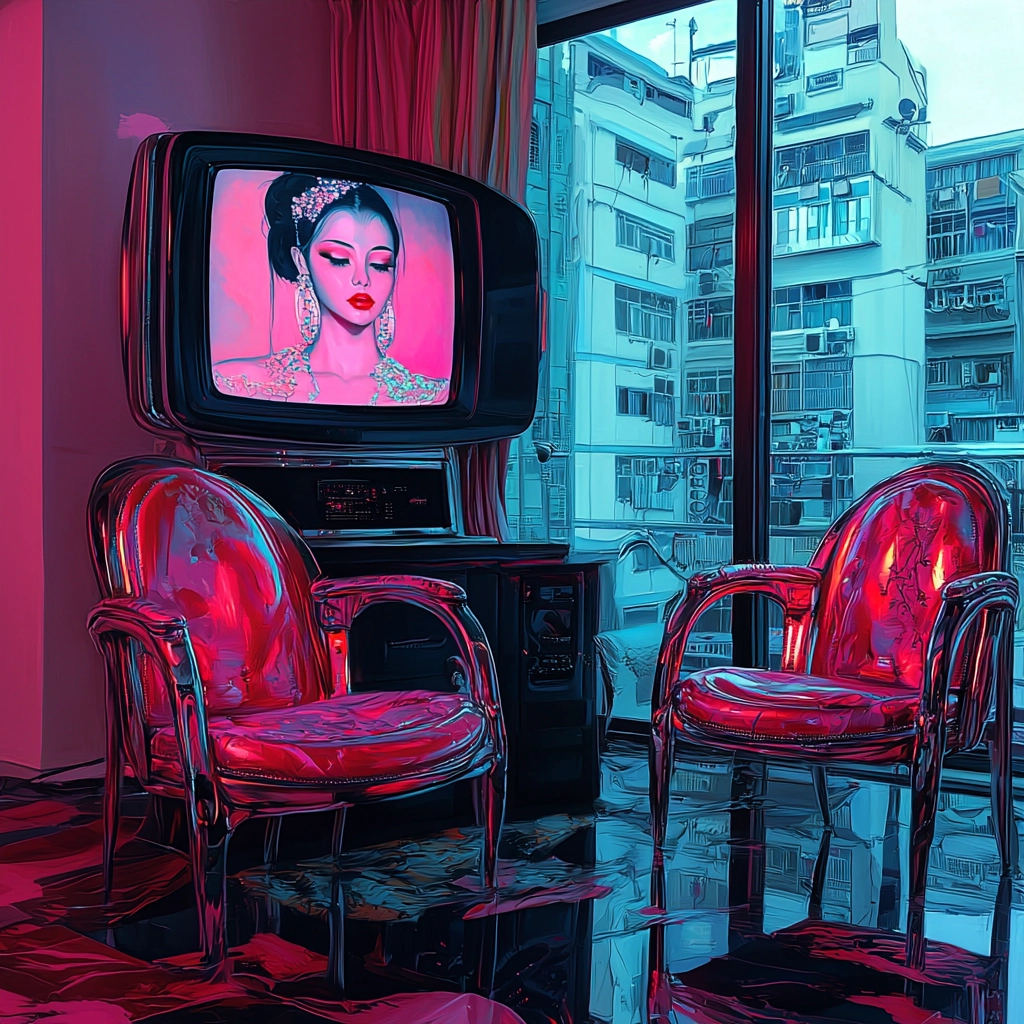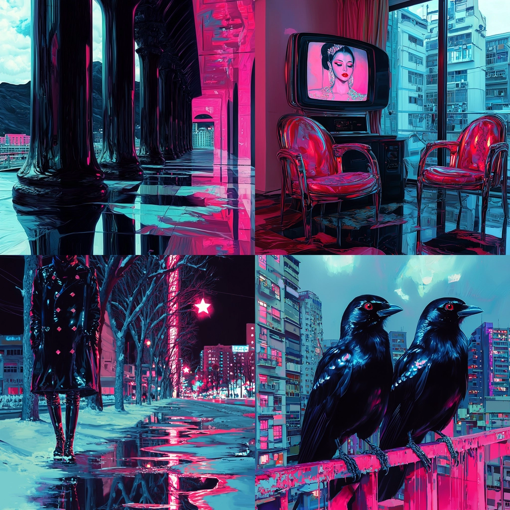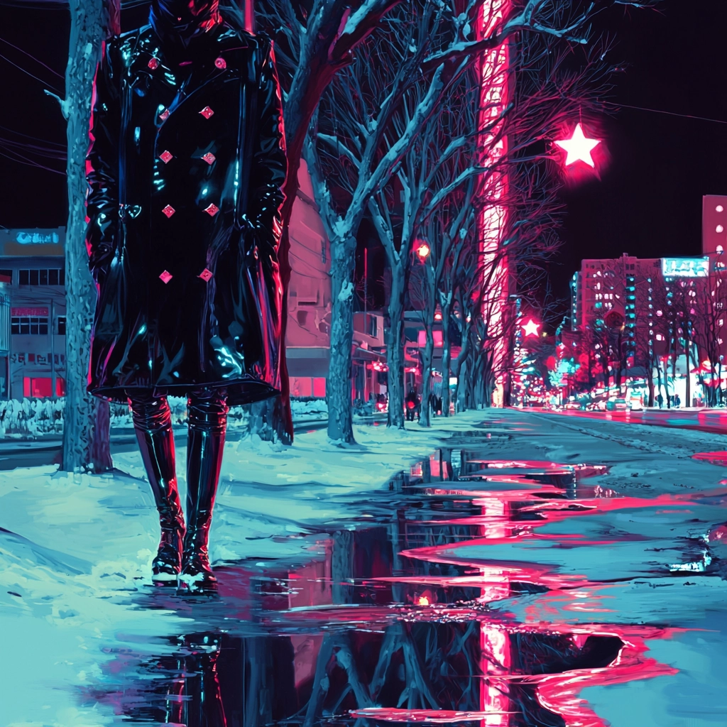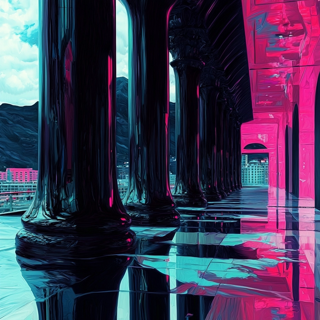 Rich neon lighting highlights key elements, casting dynamic reflections across polished surfaces. Textures range from glossy to matte, creating a striking spatial interplay between depth and surface shine.