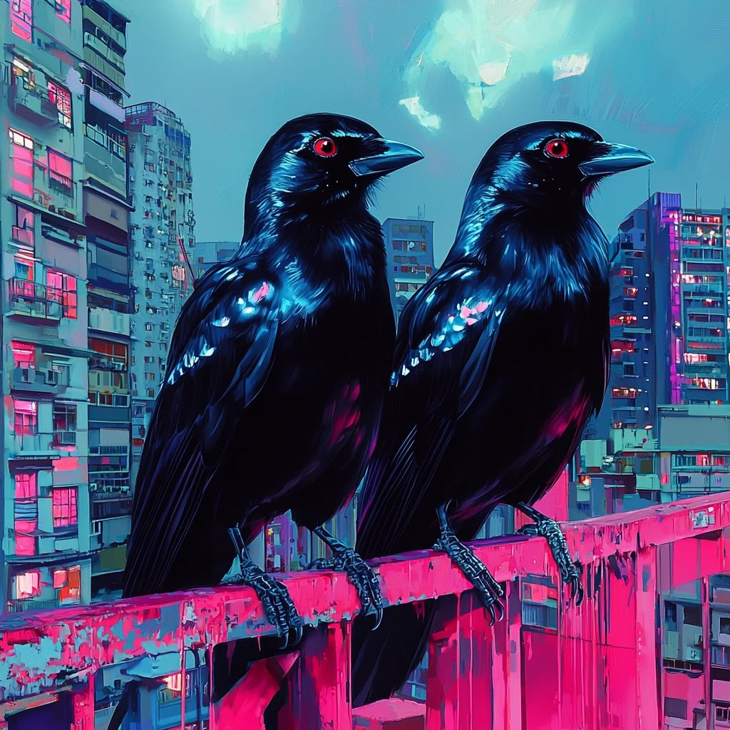 Dynamic use of vibrant neon contrasts in urban settings with reflective surfaces.