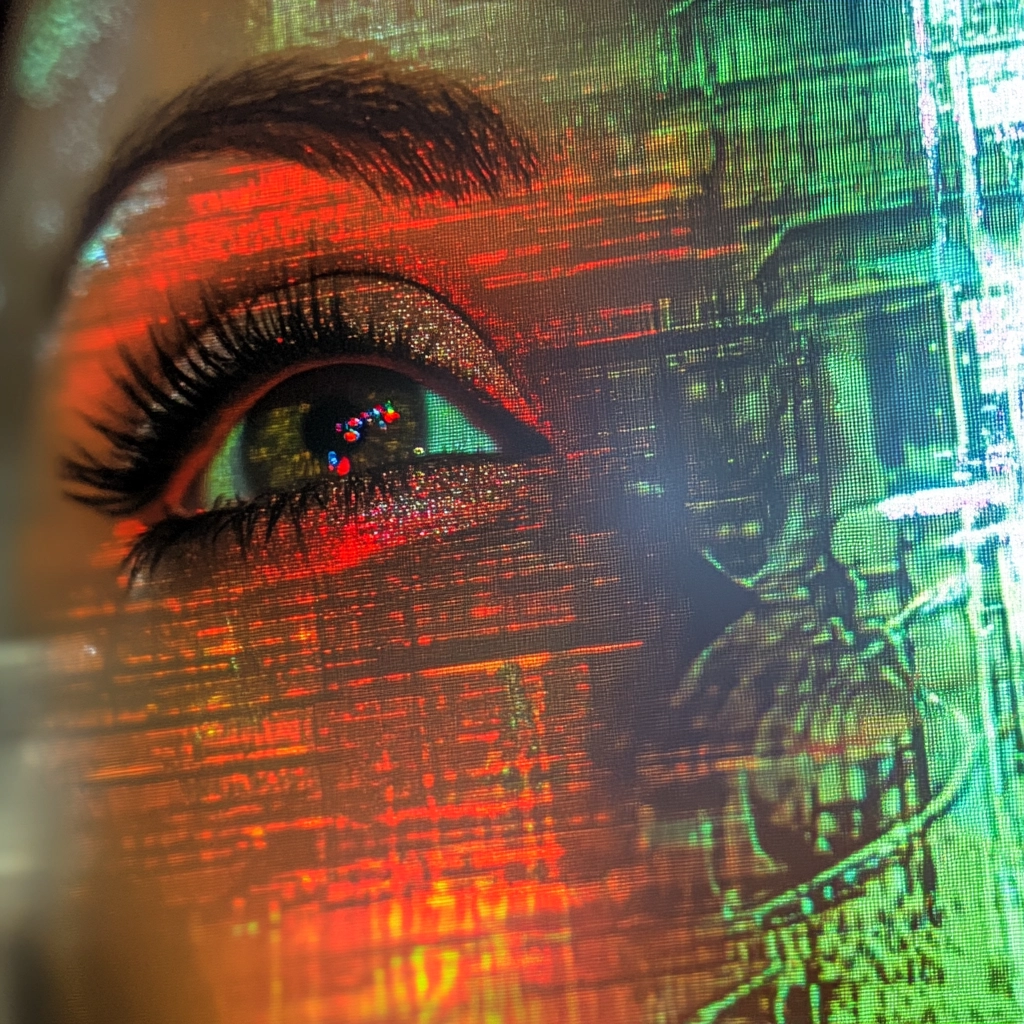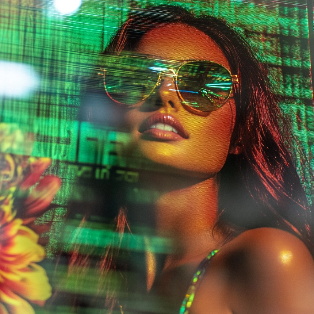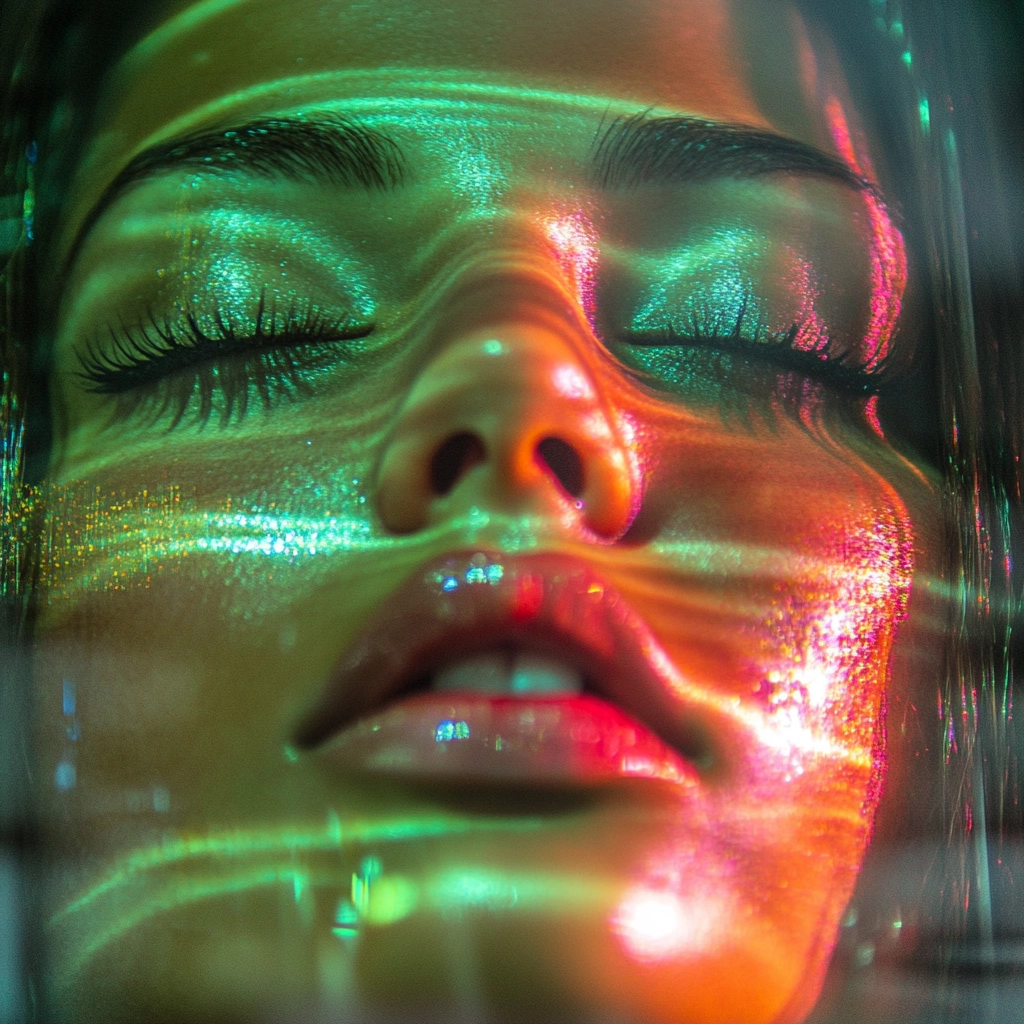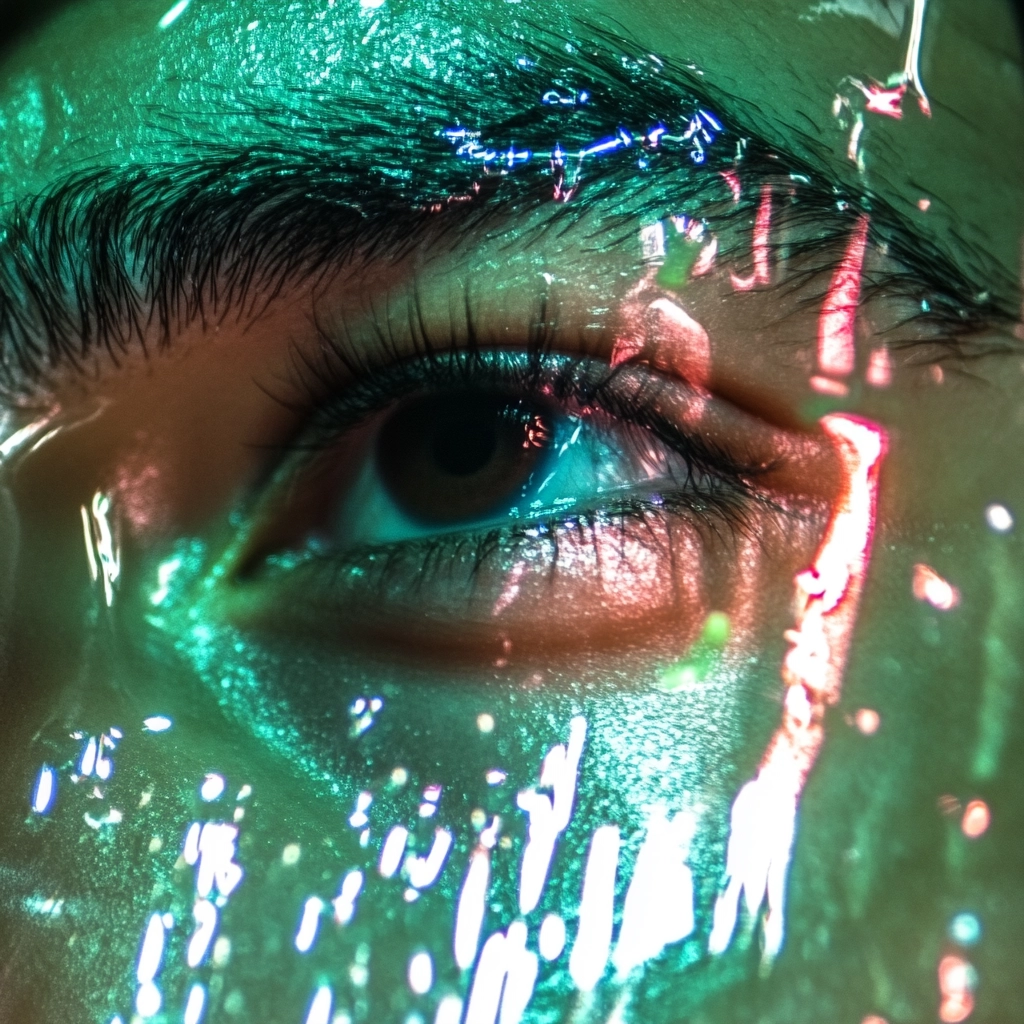 Dynamic interaction of vivid colors and light on human features, overlaying digital patterns.