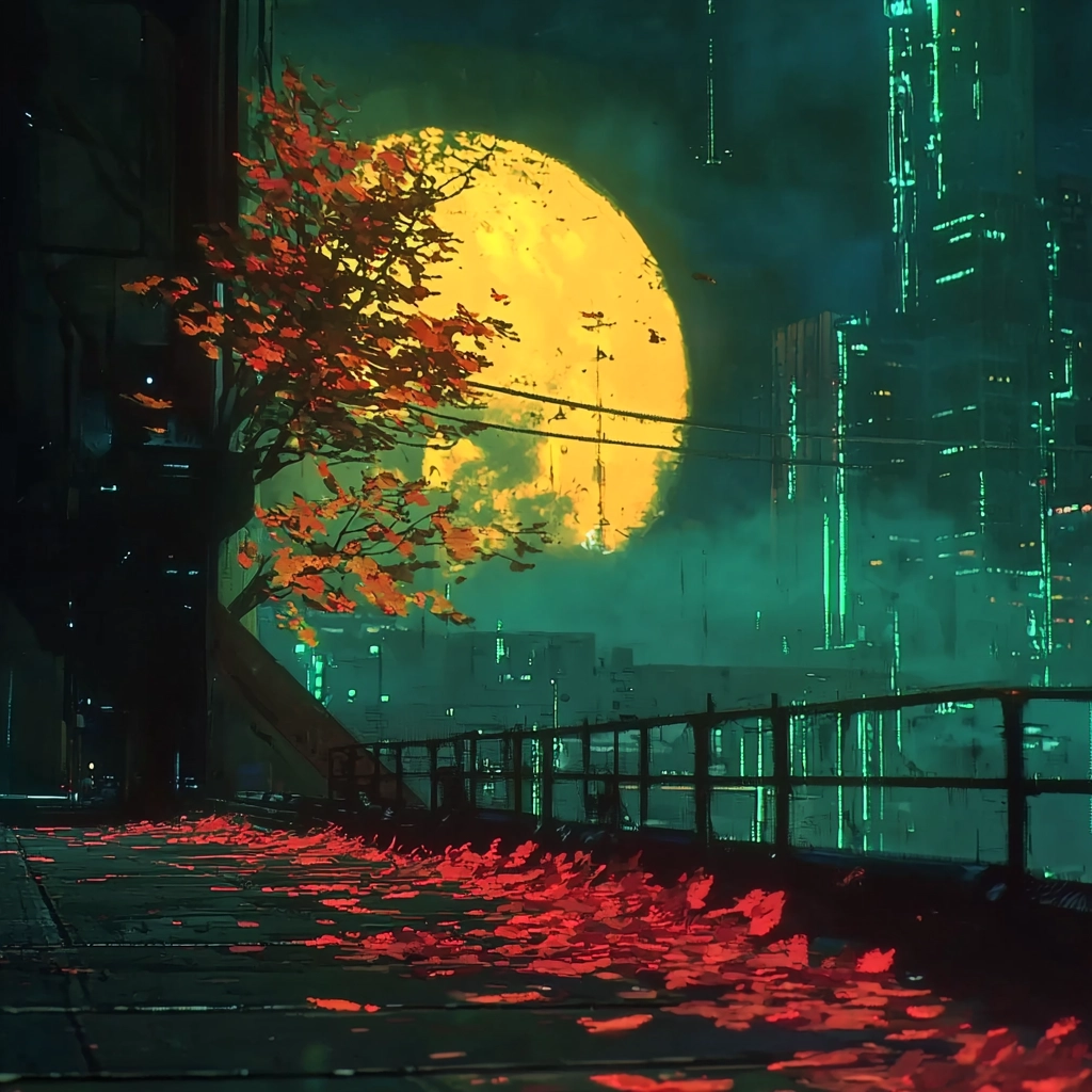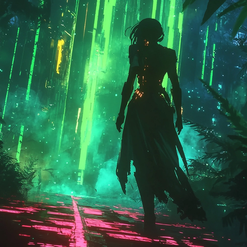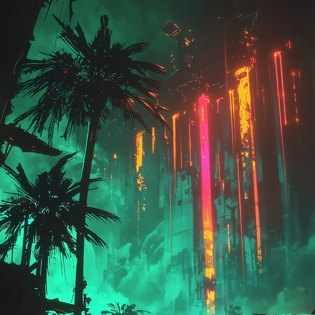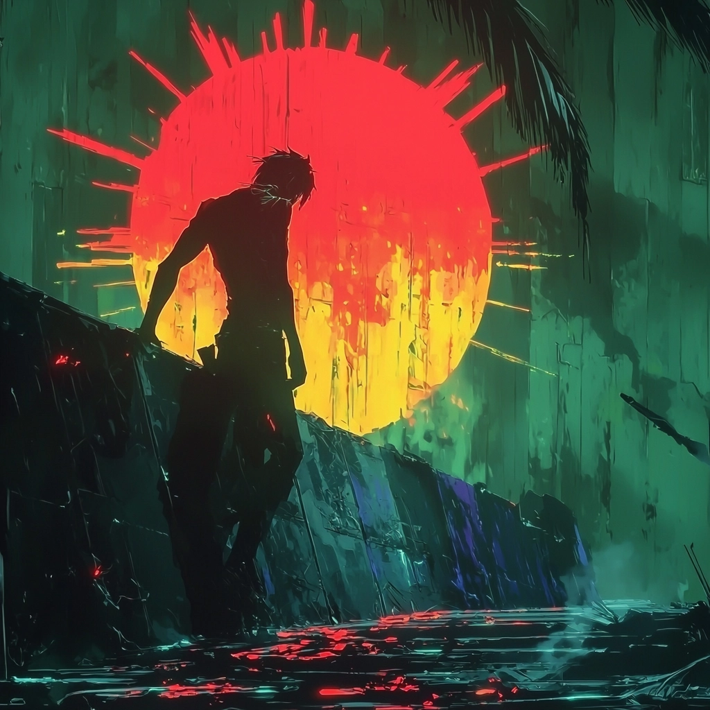 Vivid lighting contrasts with silhouetted figures in urban settings.