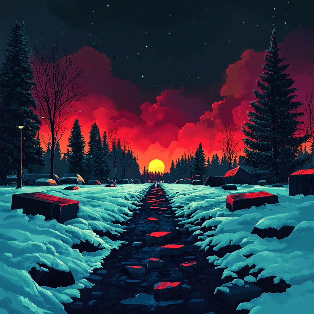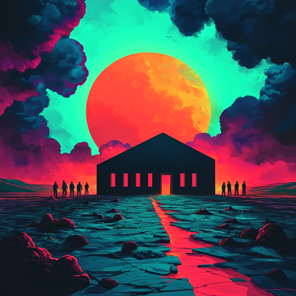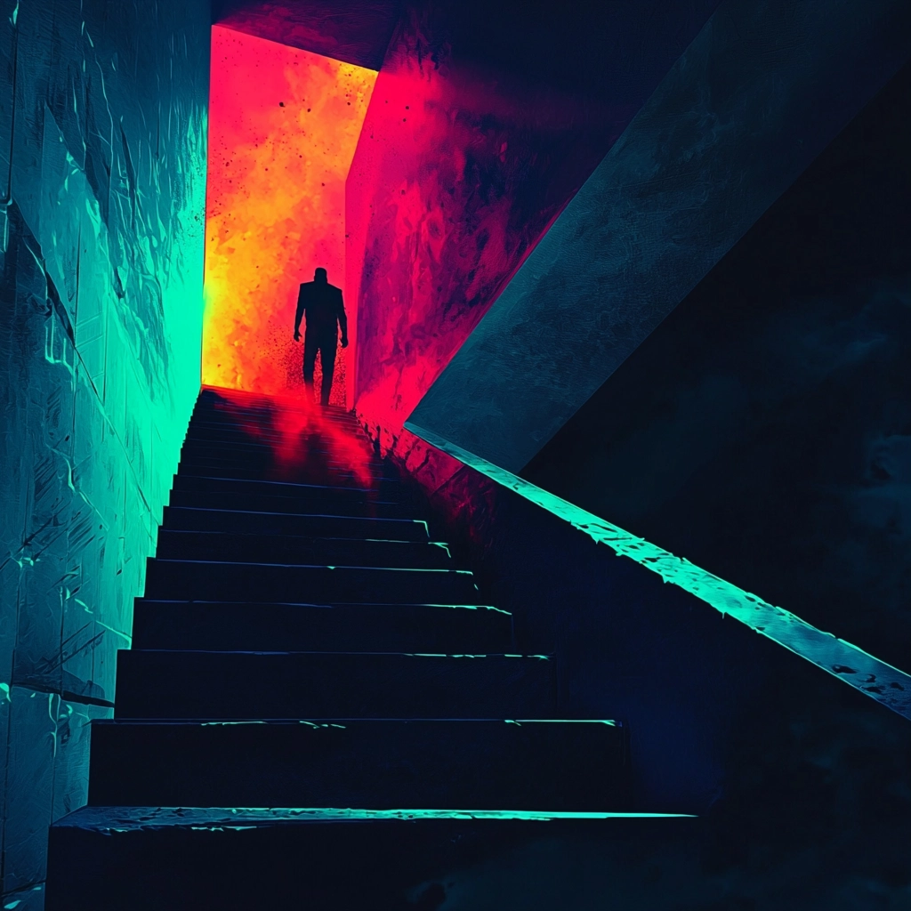 Vivid neon hues contrast with deep shadows, creating striking compositions.