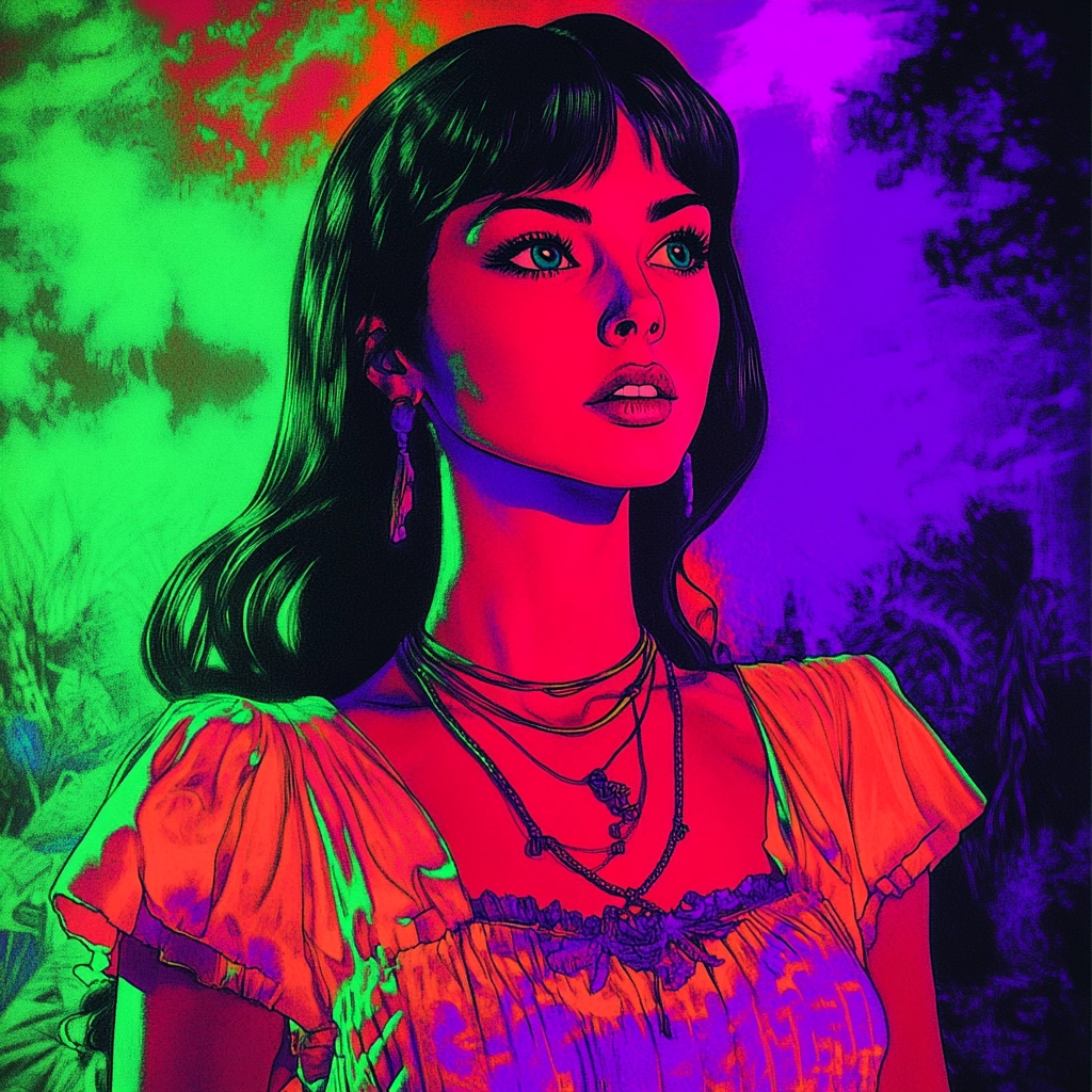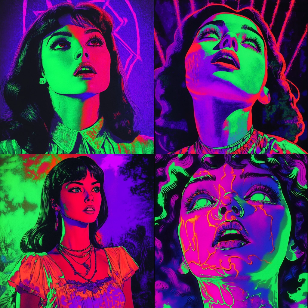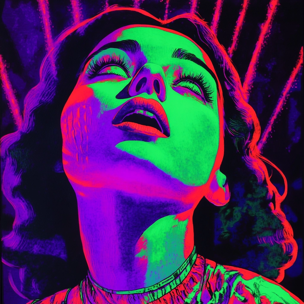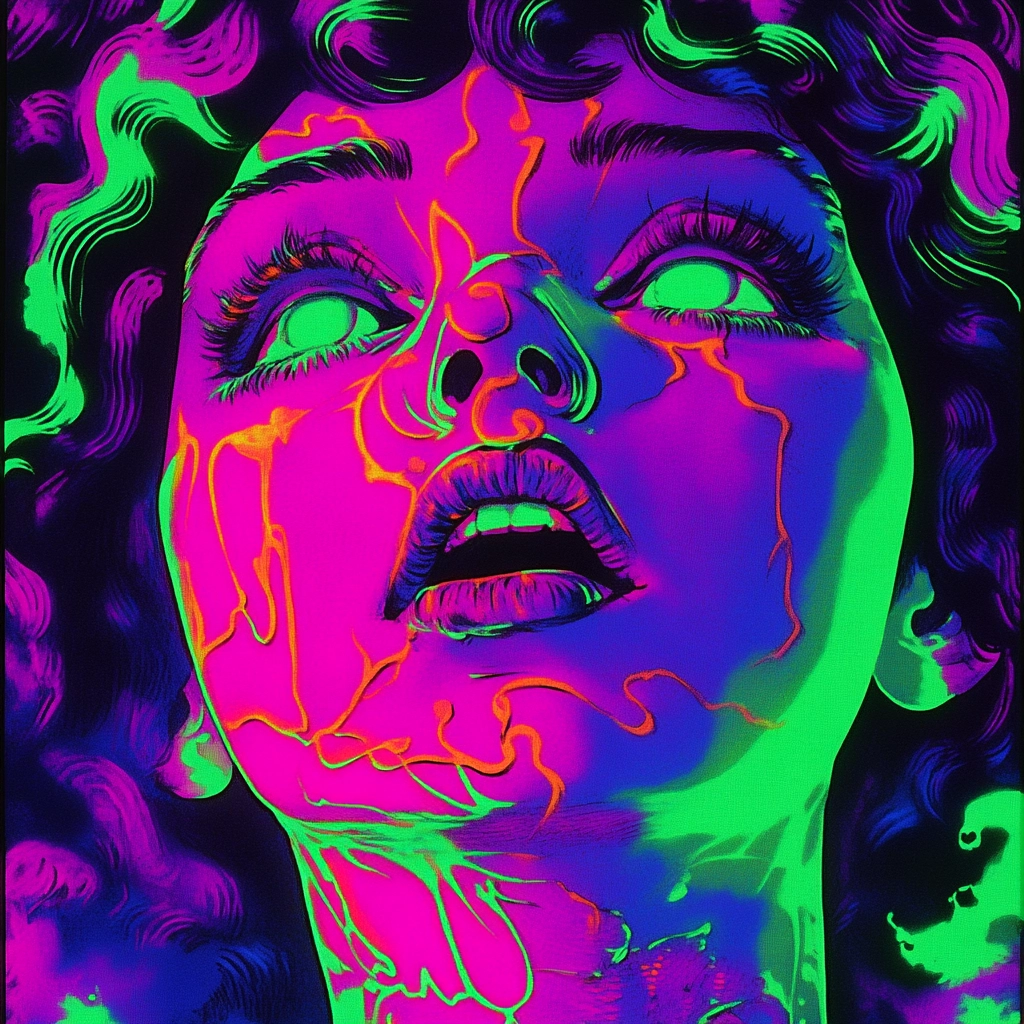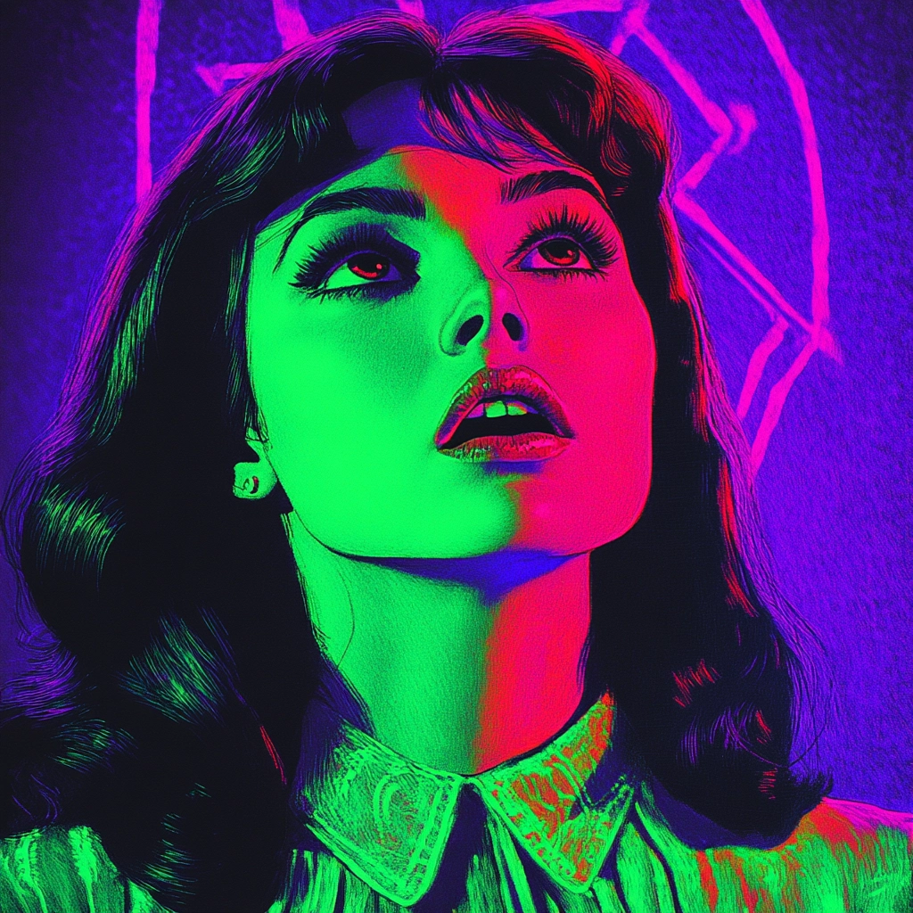 Bright neon lighting creates vivid contrasts, highlighting the intricate details of the visual elements. Rich green, purple, and red shades contribute to a layered texture, offering a sense of depth. The light's intensity and placement provide a focus on the contours and curves of the elements.