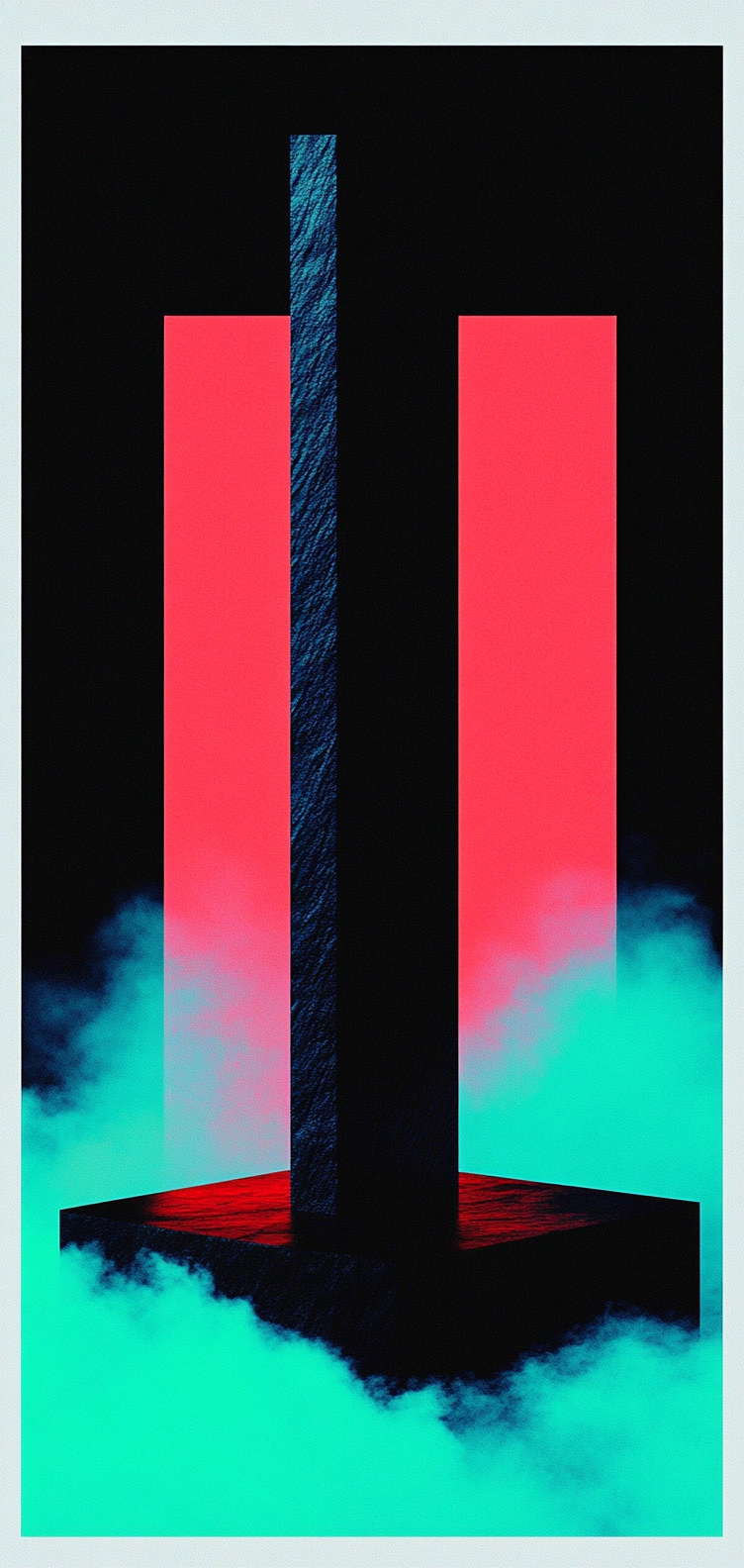Bold lighting effects with vibrant red and green hues create intense contrasts against deep black backgrounds. The spatial arrangement highlights geometric forms and perspective, while textures are sharp and clean.