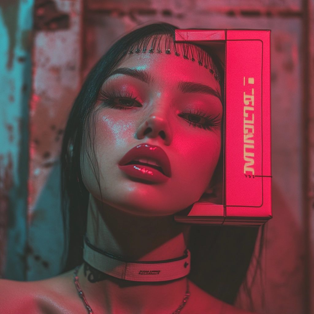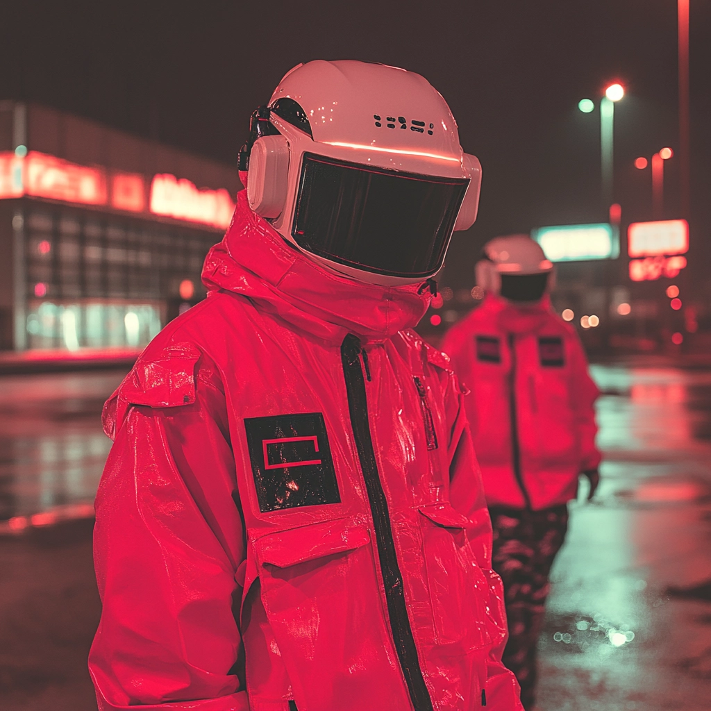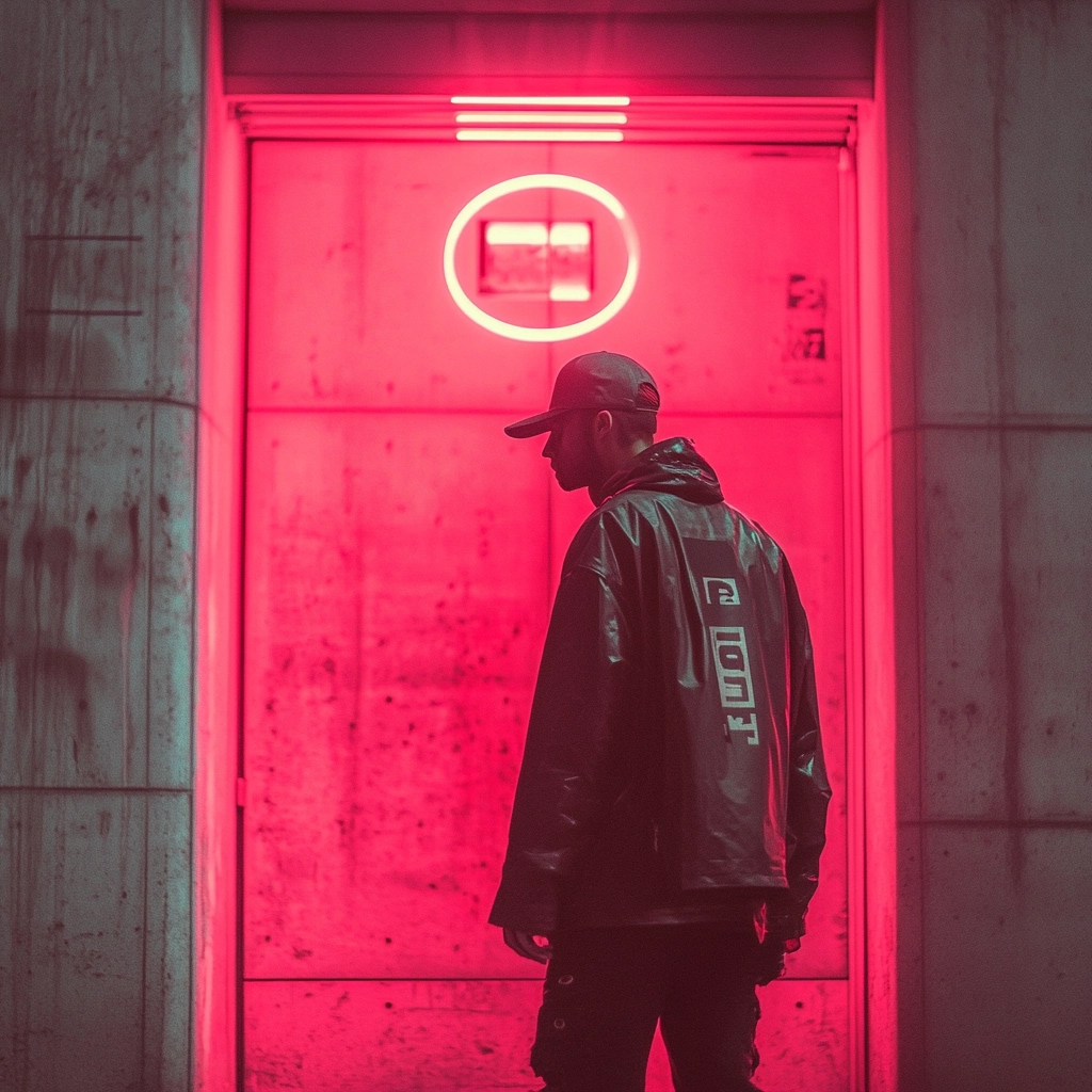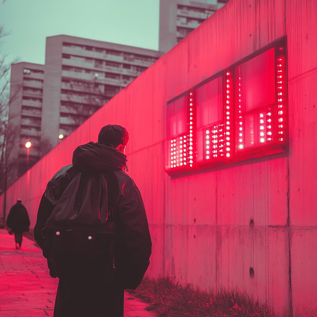The lighting casts a vivid red hue over the scene, creating strong contrasts with deep shadows. The prominent use of red imbues the urban backdrop with intensity. Surfaces reflect light differently, enhancing texture and spatial depth.