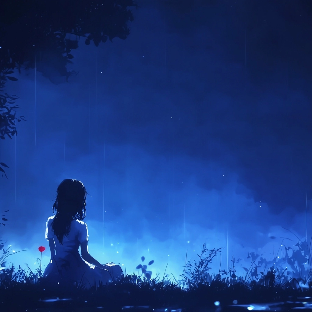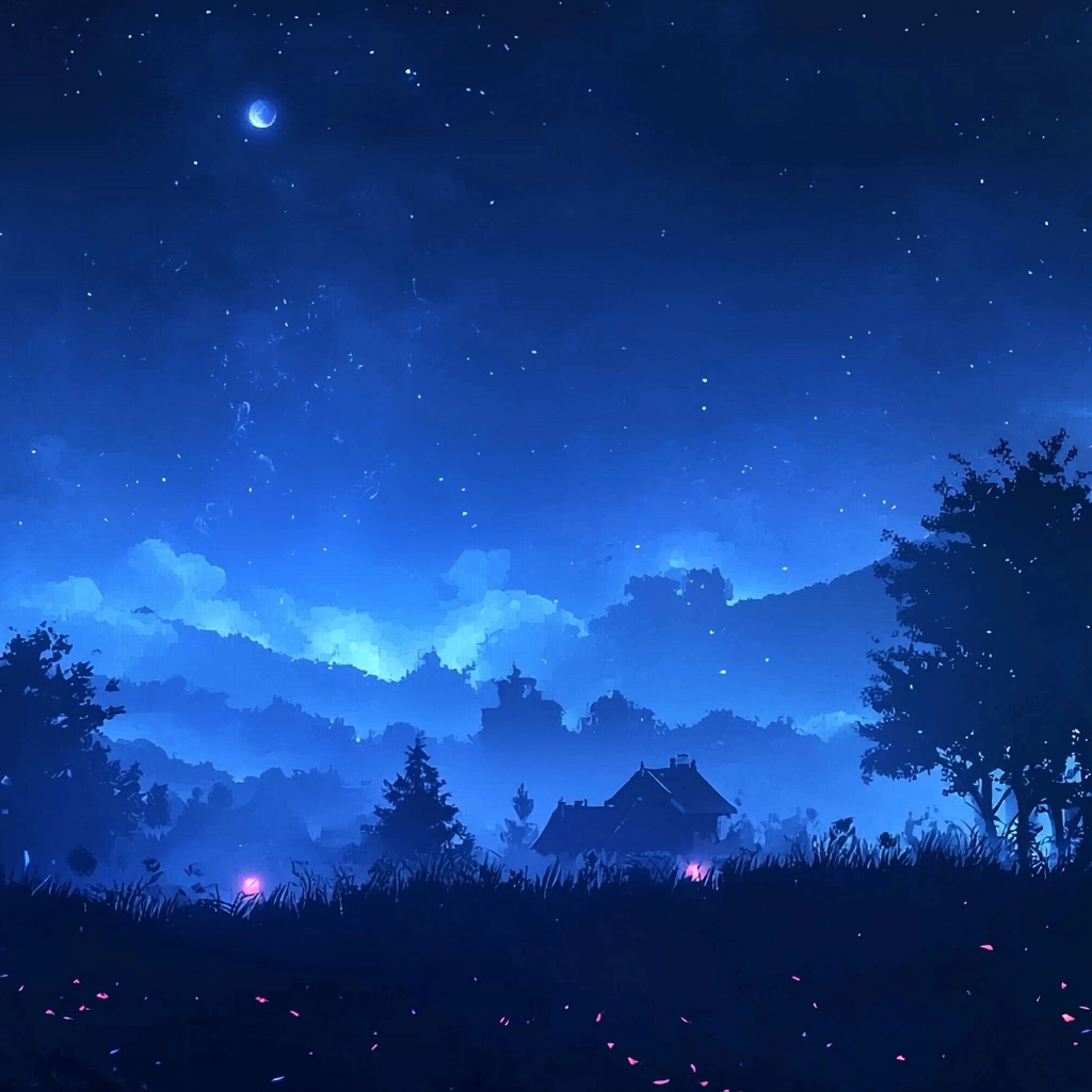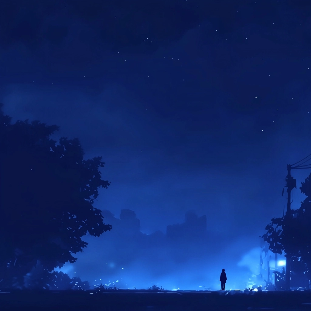 The use of dark blue shades establishes a deep, atmospheric lighting effect, while the silhouette figures serve as striking contrasts against the expansive background. The smooth gradation of color creates a rich textural experience that enhances the sense of space and distance in the composition.