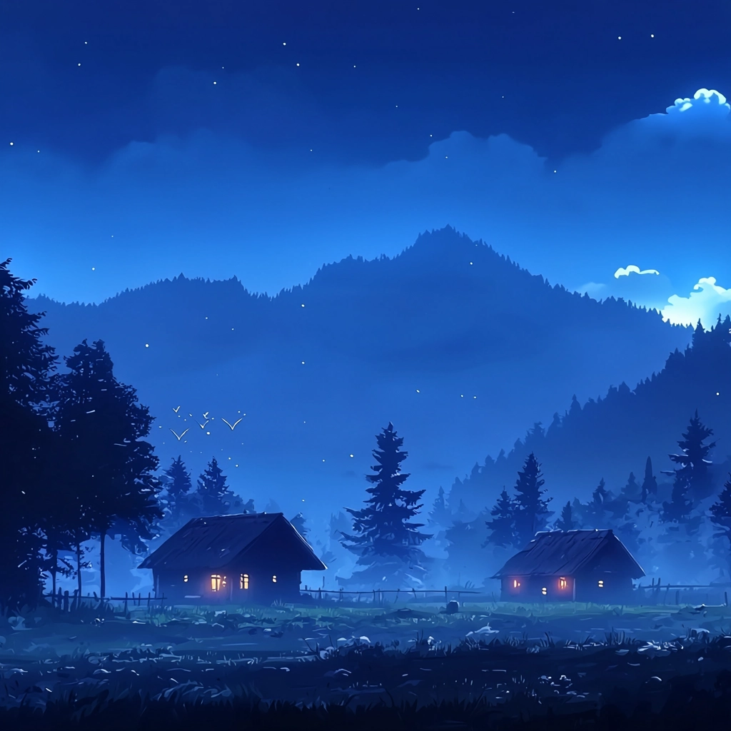 Dominant dark blue hues and clear silhouette contrasts create an expansive spatial sense.