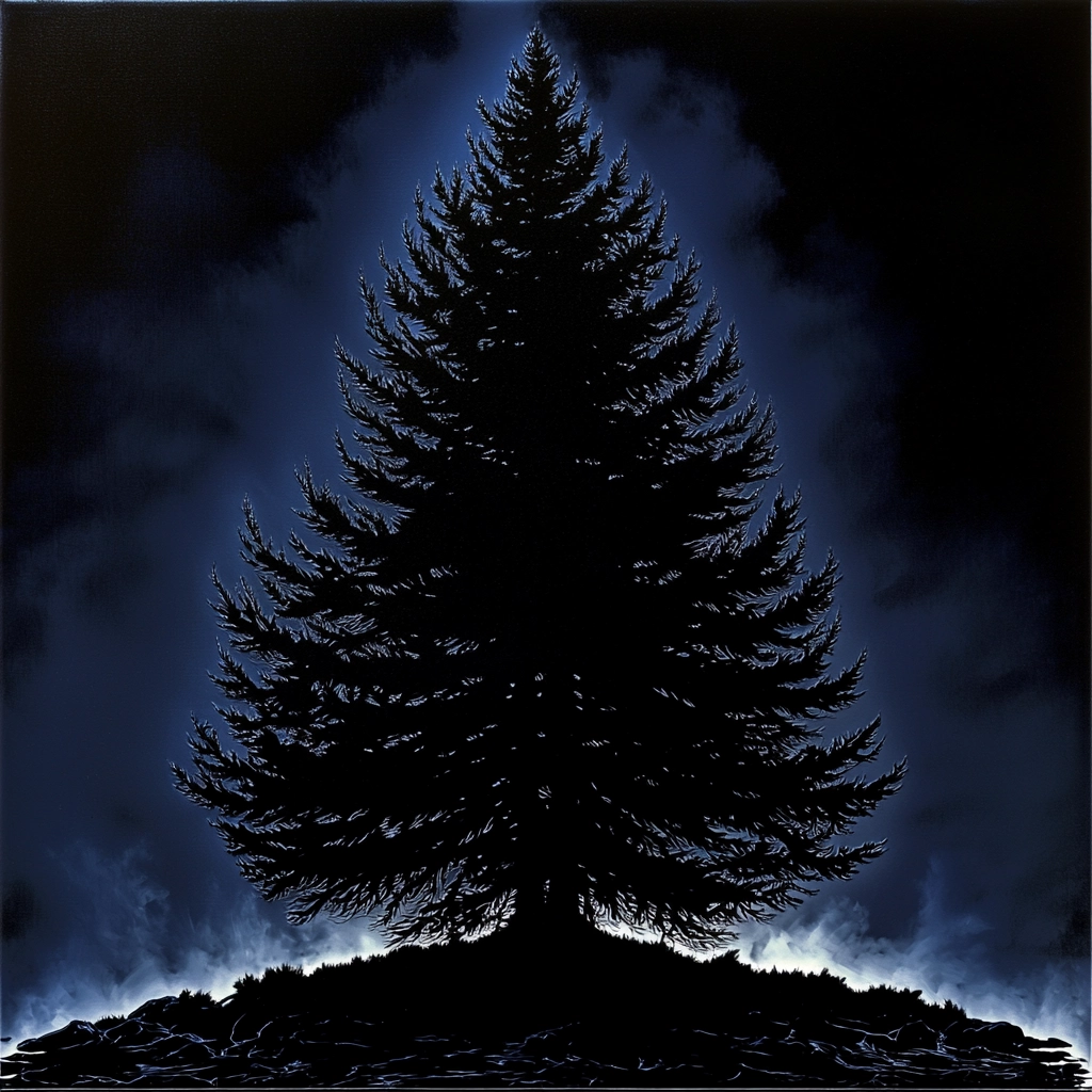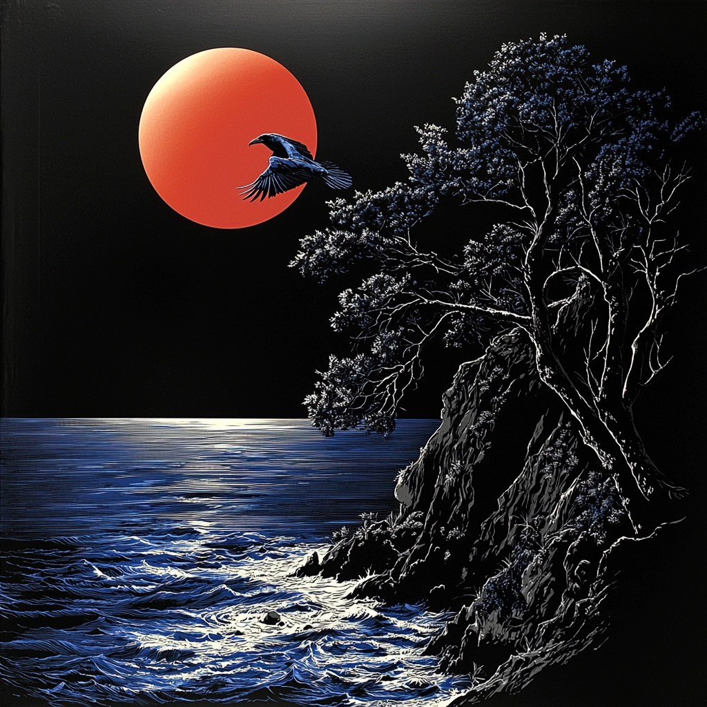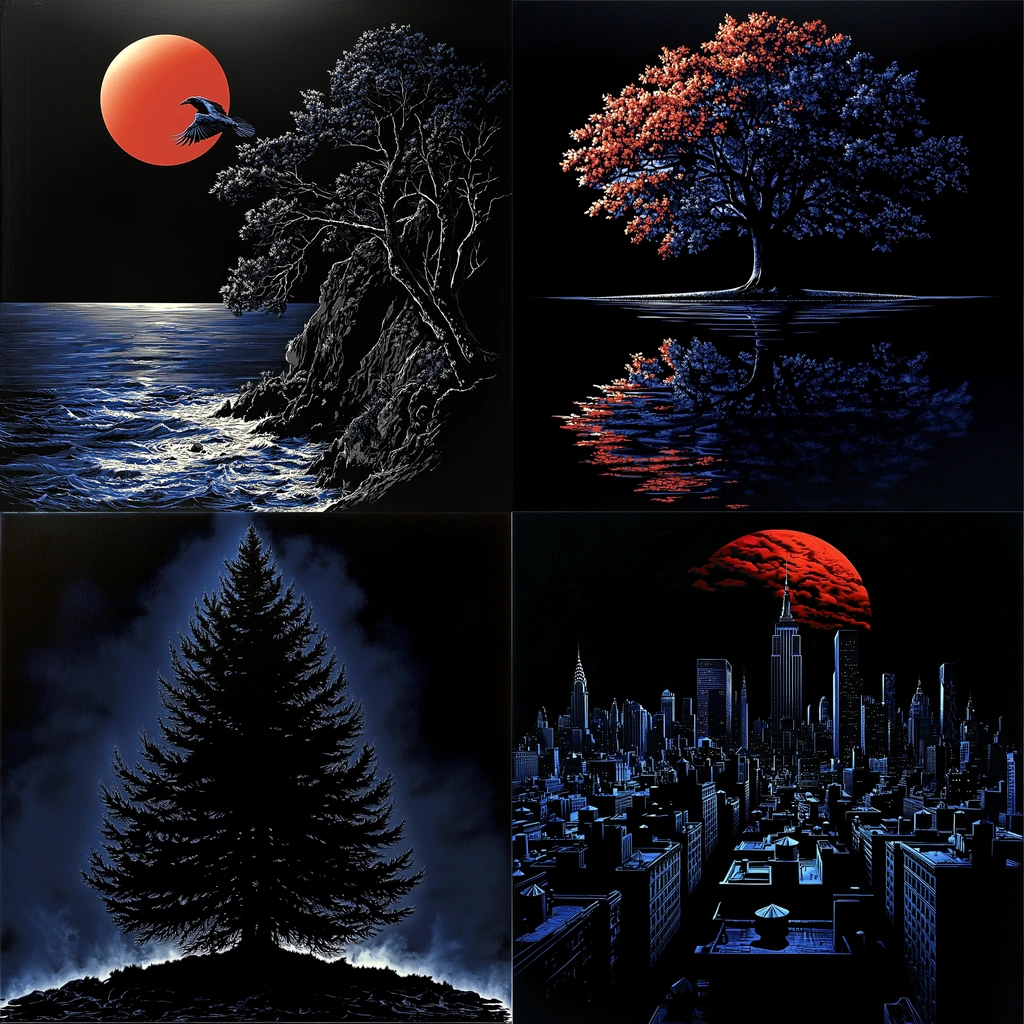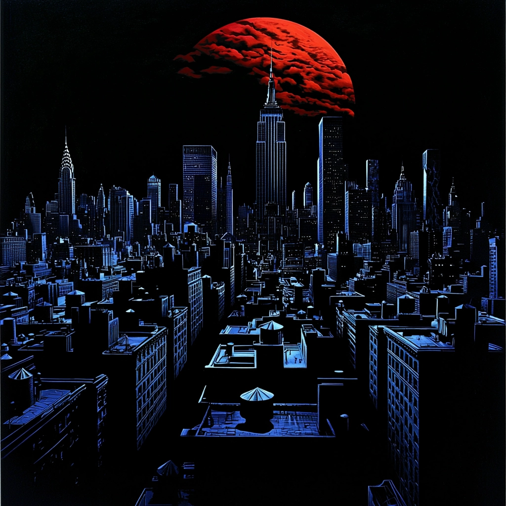 A striking interplay of deep blues and reds against black accentuates silhouettes.