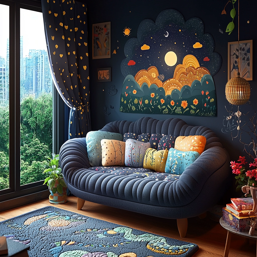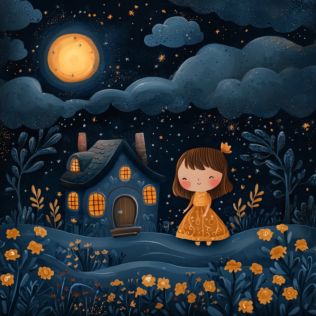 The interplay of light and dark creates a vivid spatial sense, with soft textures and decorative patterns that evoke a whimsical nighttime atmosphere. Intricate color detailing enhances focal points, producing a dynamic and engaging visual experience.
