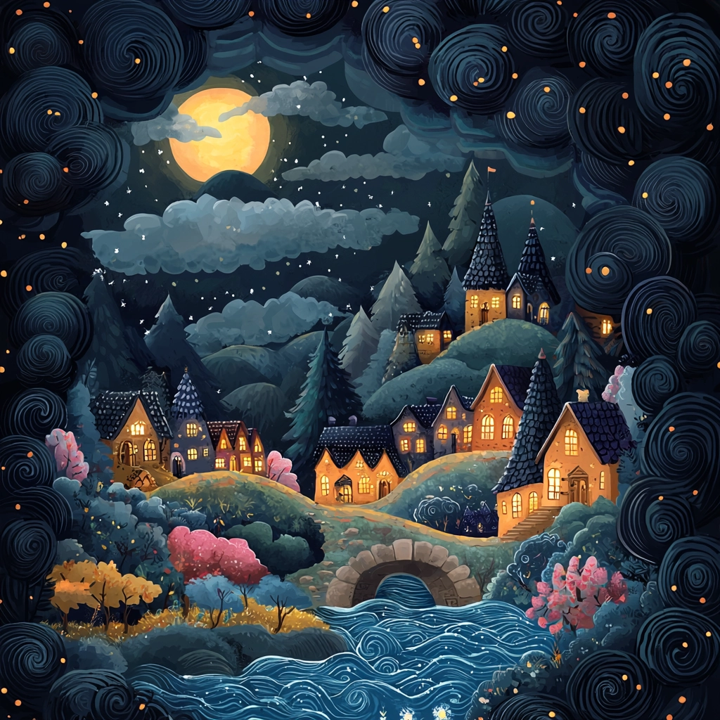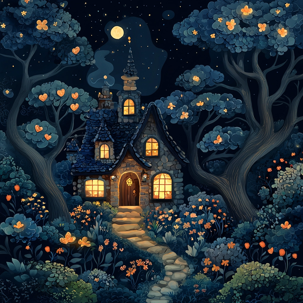 A whimsical night scene with intricate detailing and rich contrasts.