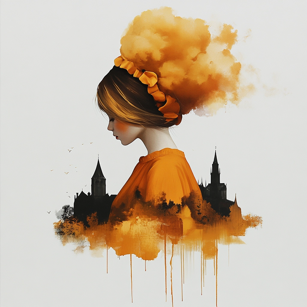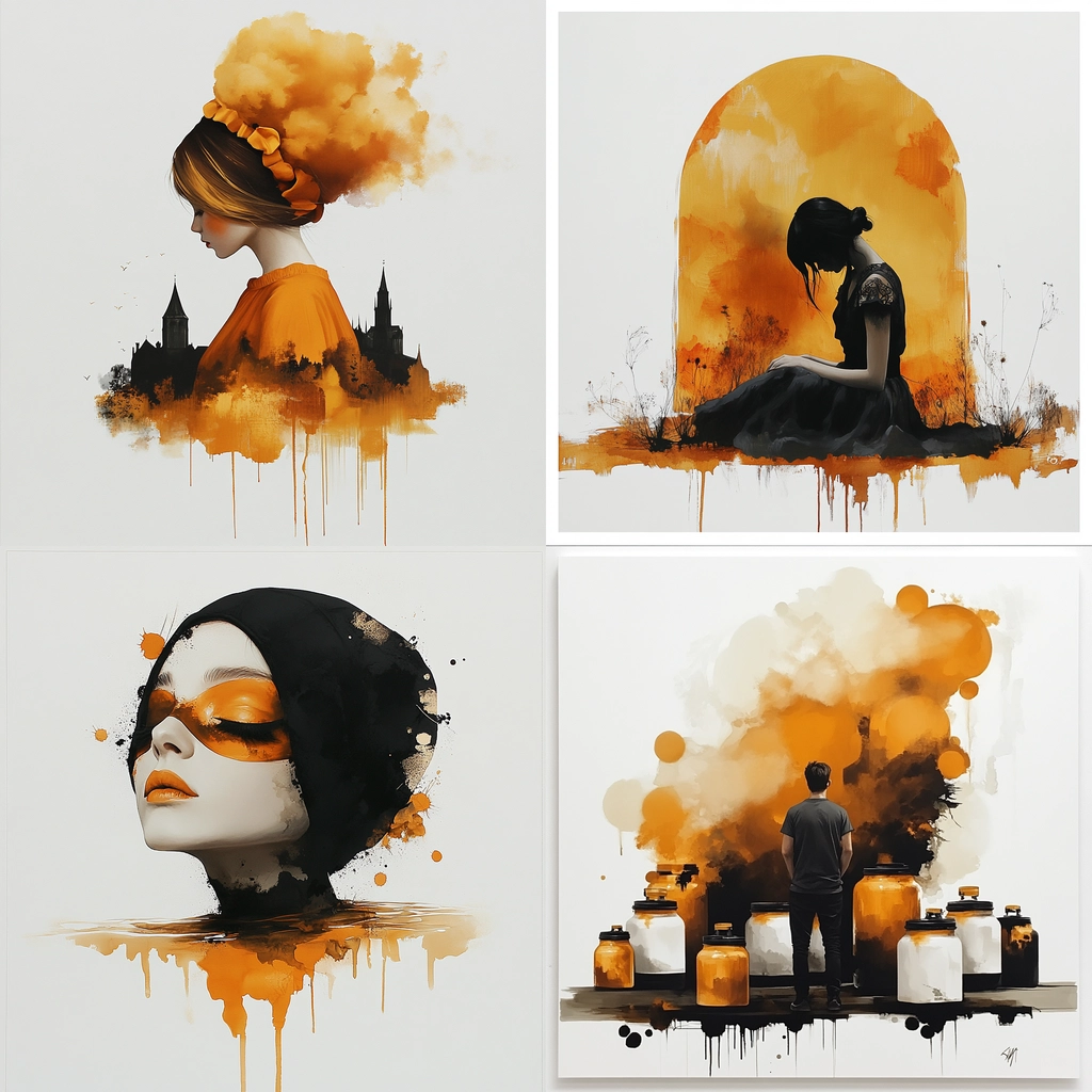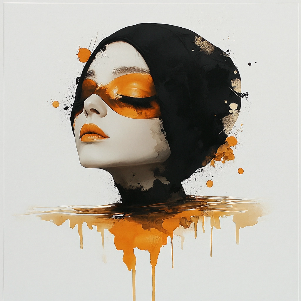 Lighting and shadows create depth, using strong orange hues against striking black. Dripping paint shapes the space, fostering a dynamic visual rhythm. The background is elegantly textured, complementing the bold color transitions.