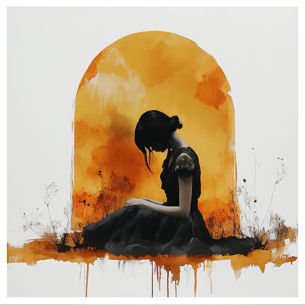 The composition merges dramatic contrasts between deep black and vibrant orange, with expressive white accents.
