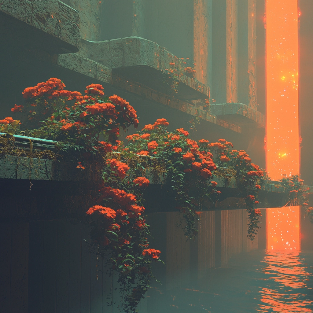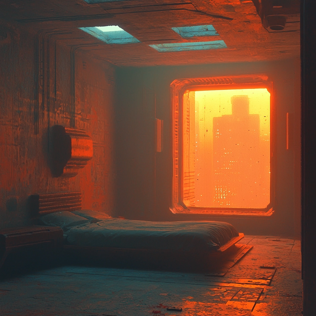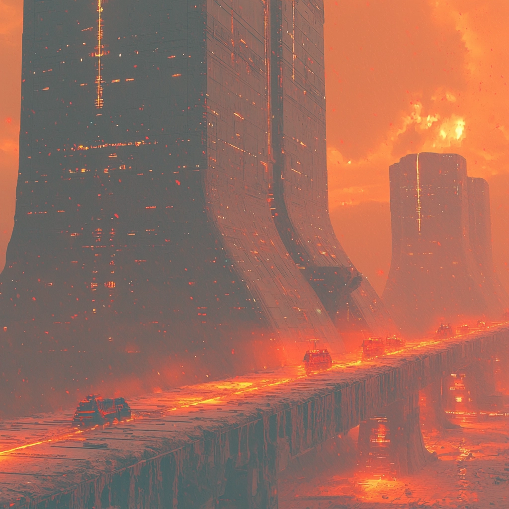 The lighting is dominated by an intense orange glow that creates stark contrasts with the dark shadows. The use of deep blues and greens adds to the futuristic feel, with sharp lines and rigid structures giving a sense of urban progression. There's a noticeable interplay between light and shadow, emphasizing texture and dimension.