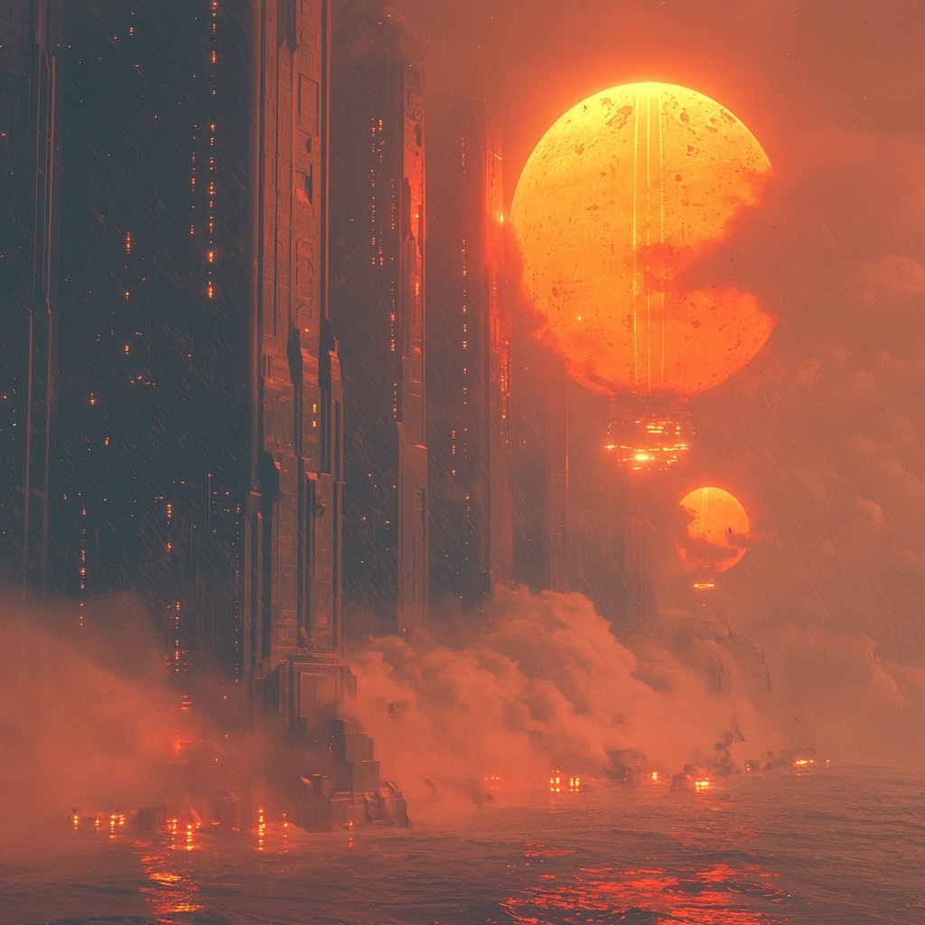 Striking contrast of orange glow with deep shadows across futuristic architecture, creating a dramatic atmosphere.