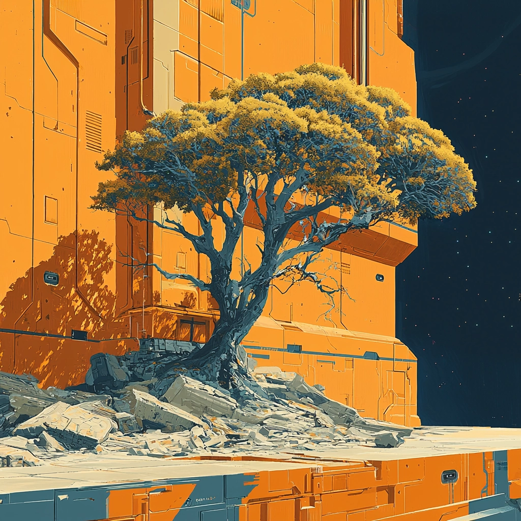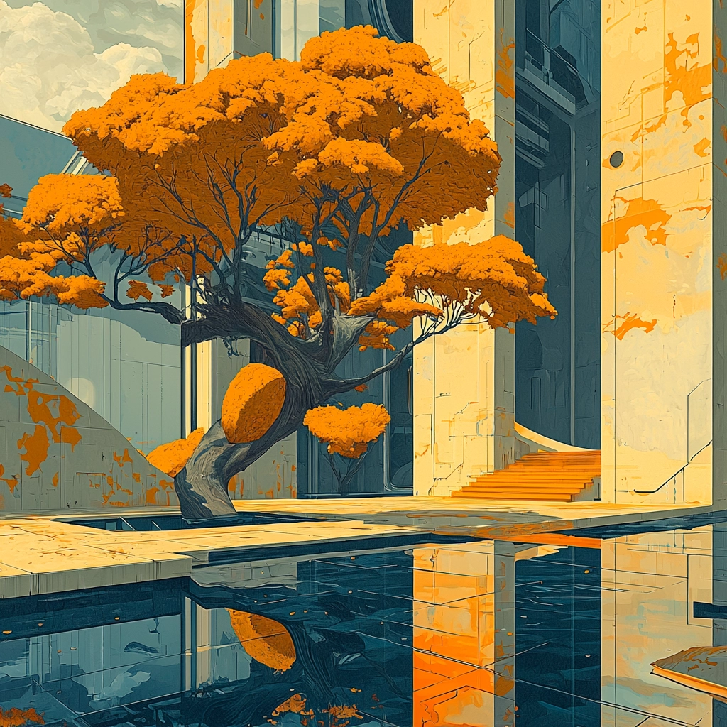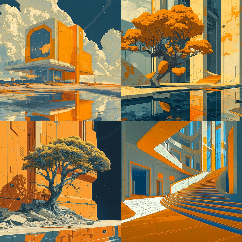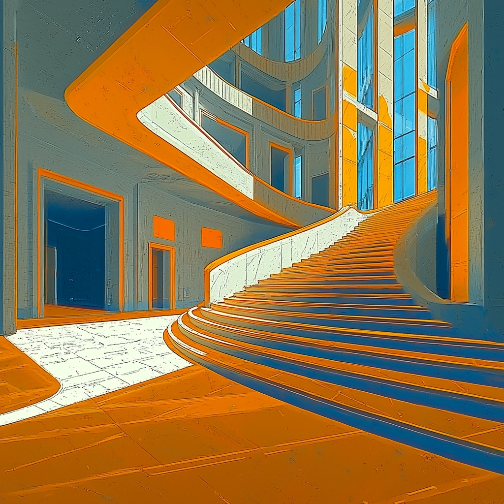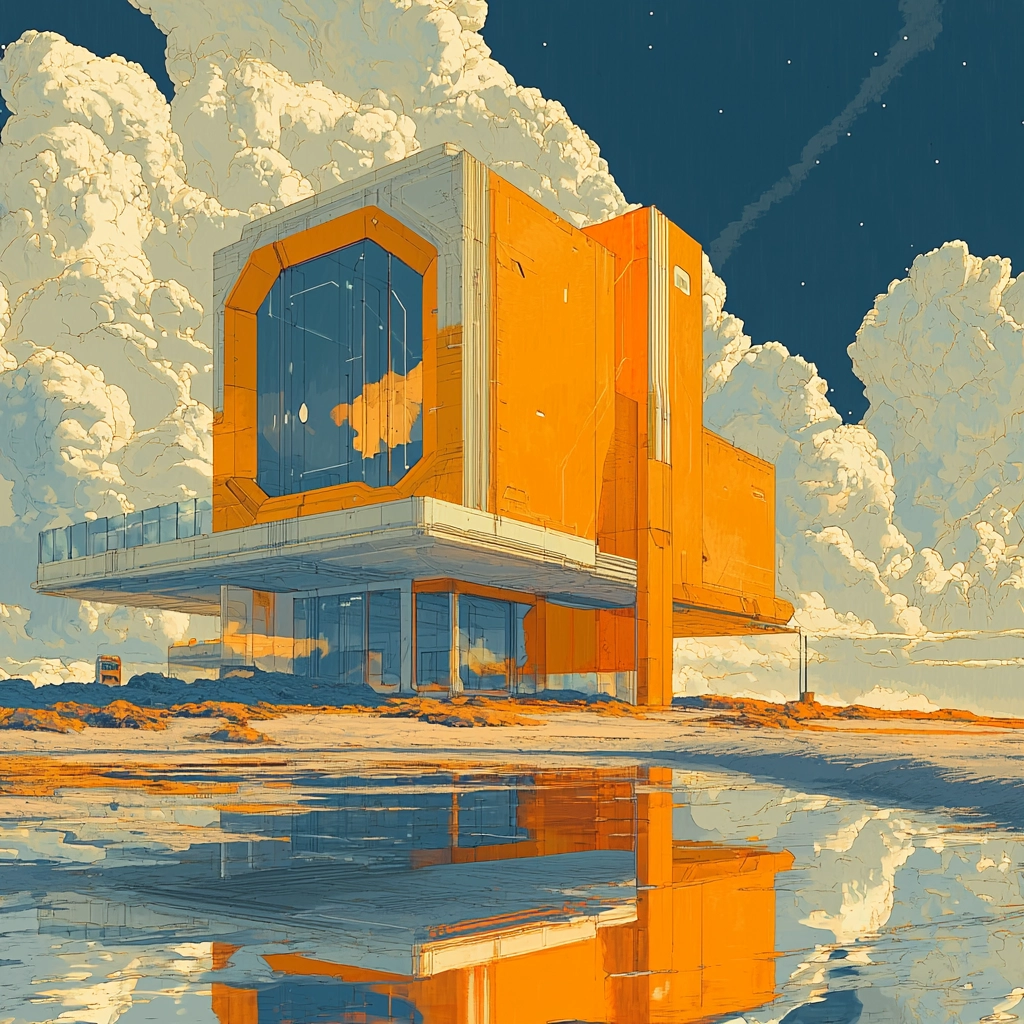 Vibrant orange structures against deep blue backgrounds emphasize a modern aesthetic.