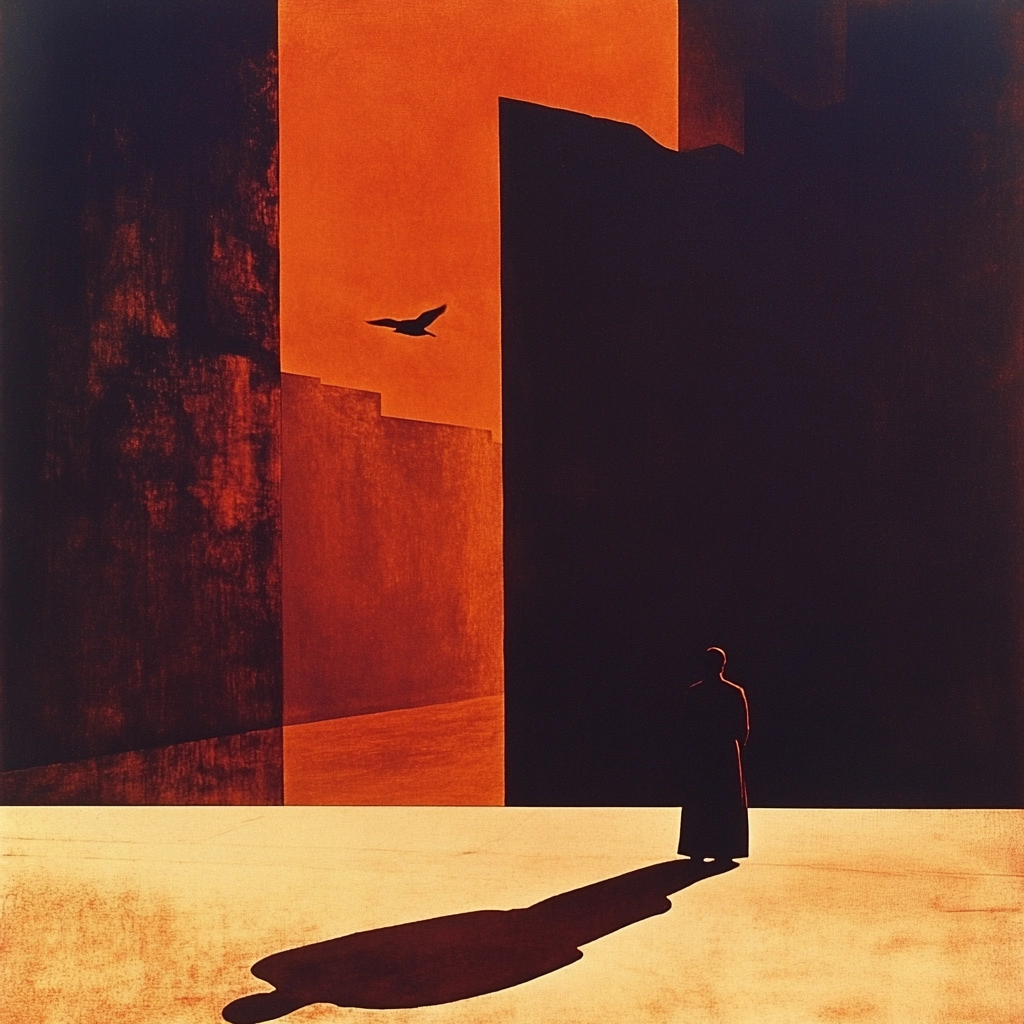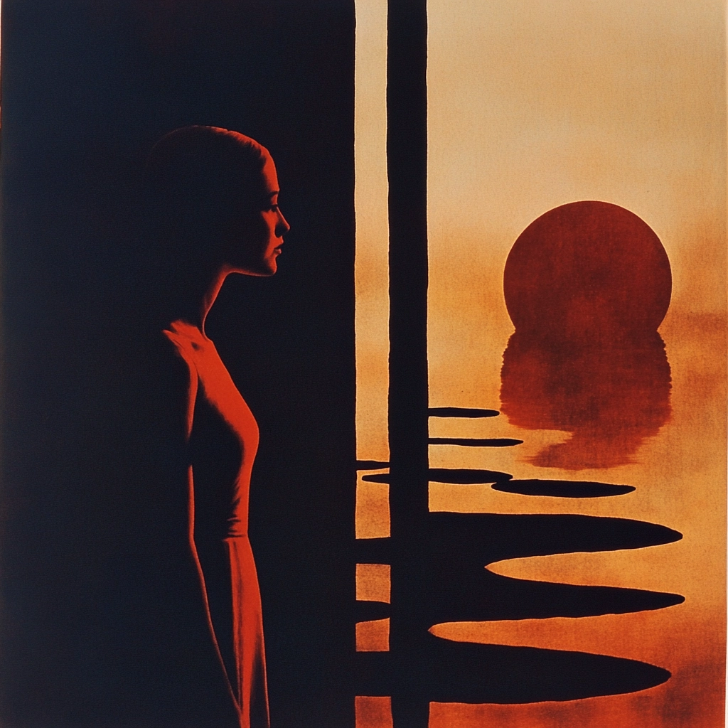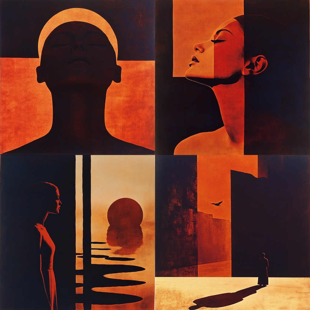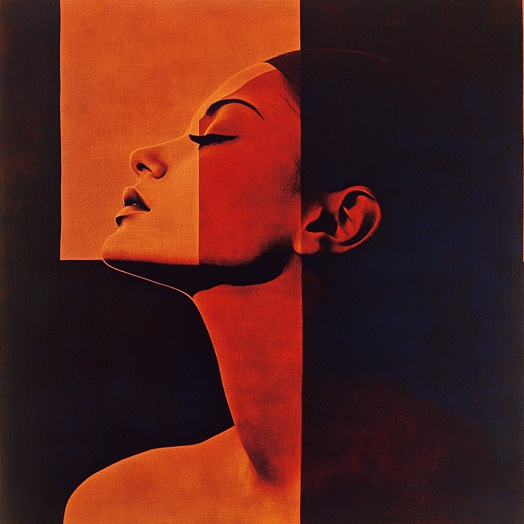 Lighting effects highlight the bold contrasts, creating a strong spatial sense and dramatic composition. The color gradients add depth, while the textures range from smooth to subtly nuanced, enhancing the visual impact.