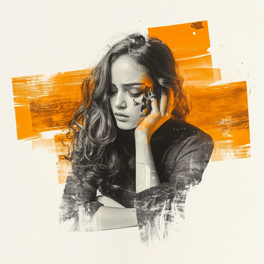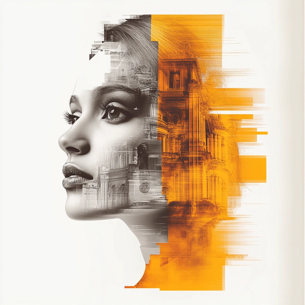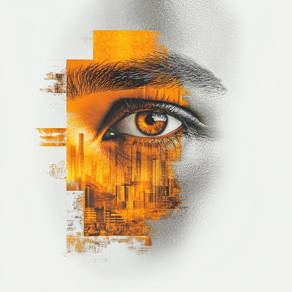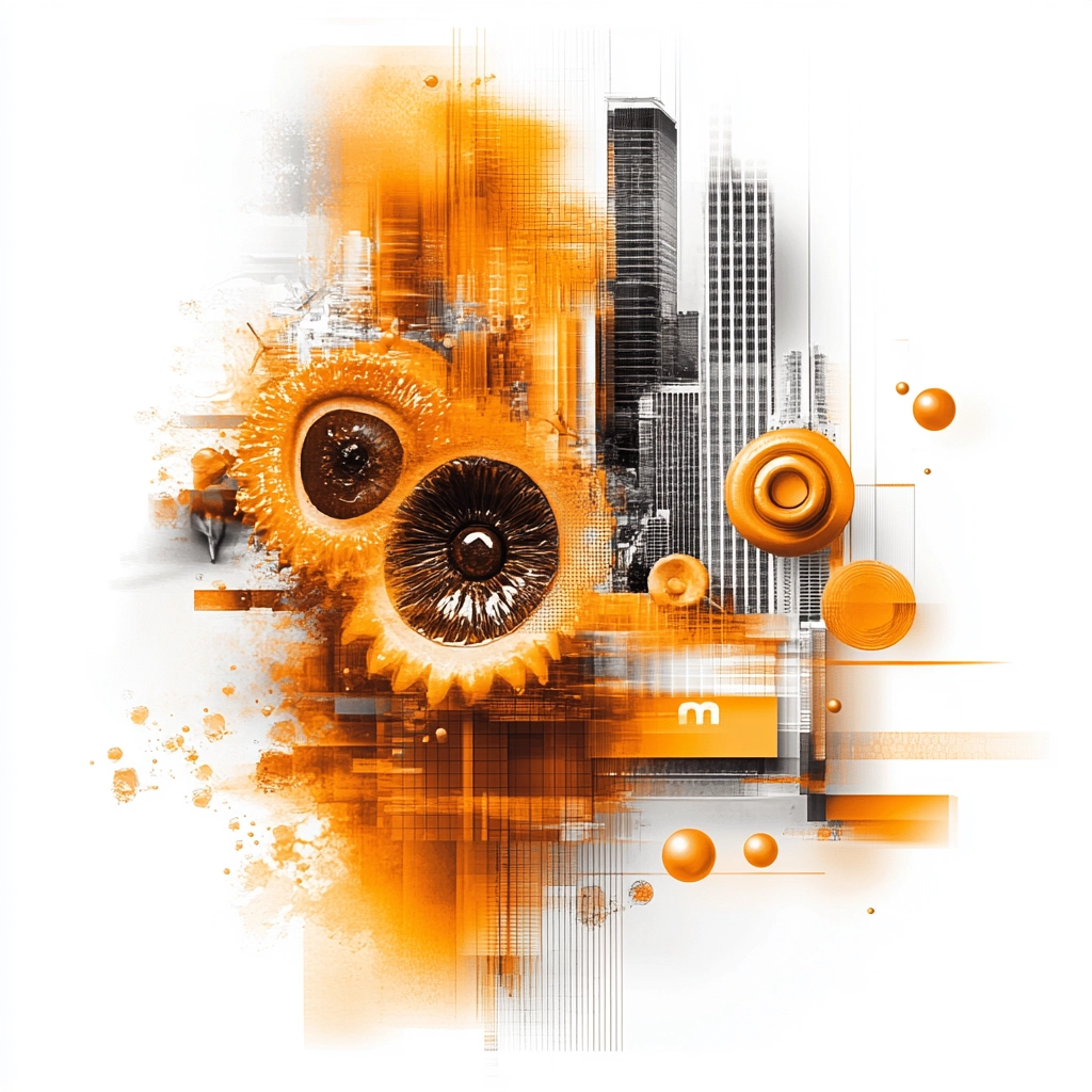 Vivid orange overlays create a striking contrast against the grayscale textures, enhancing the visual depth within defined spaces through bold color shifts and structured compositions.