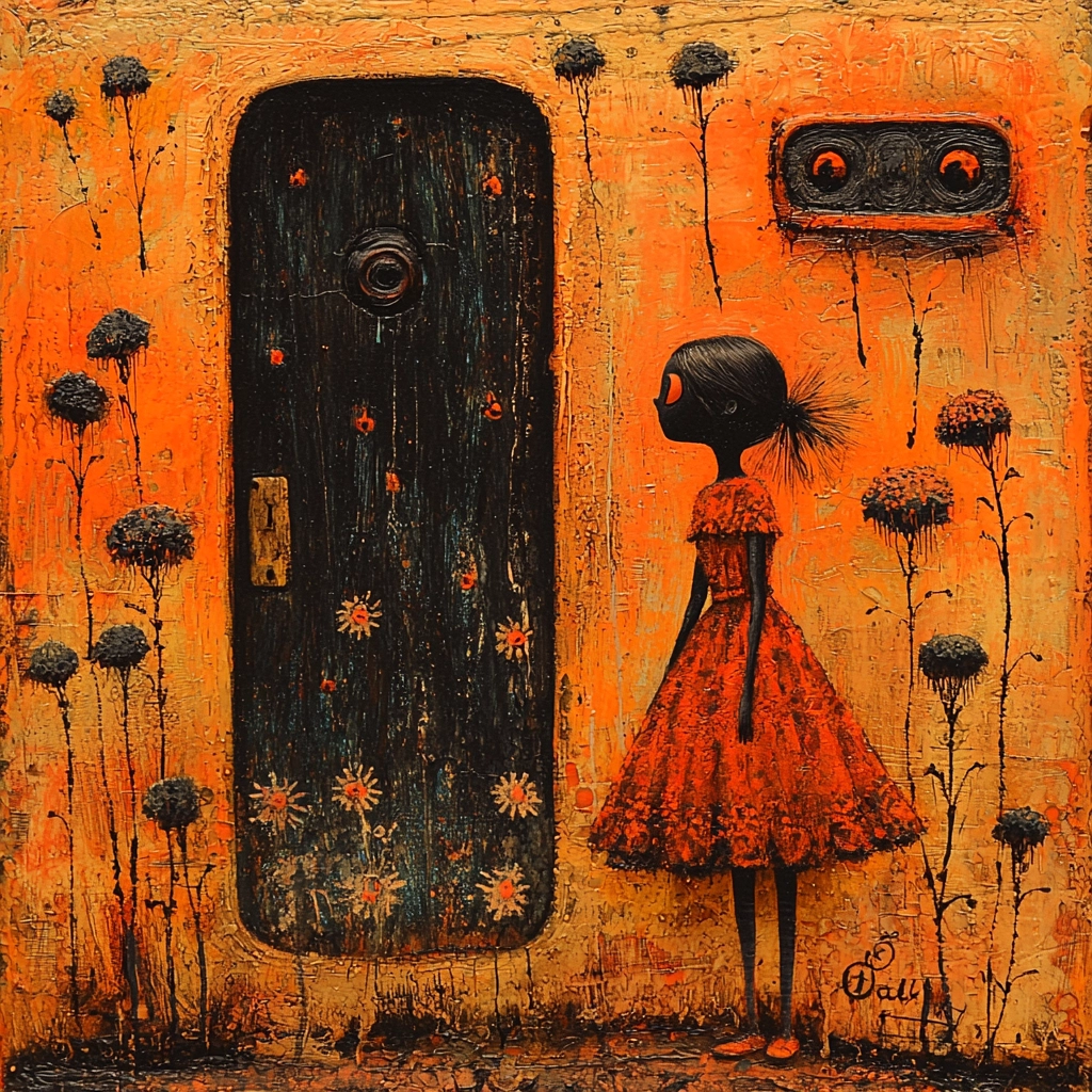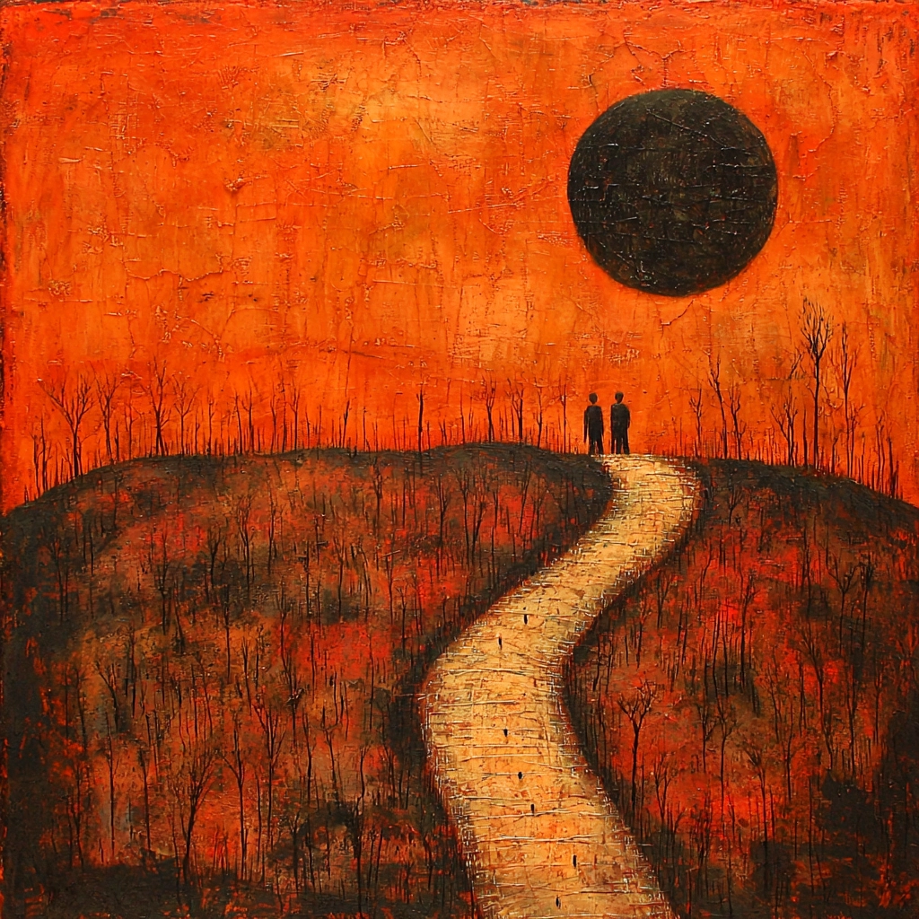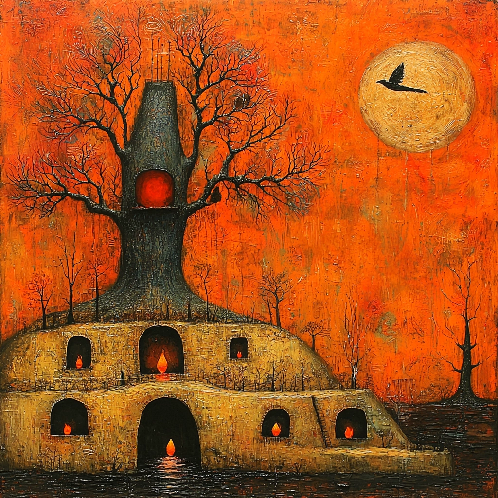 The artwork utilizes dramatic lighting to enhance the contrast between warm orange tones and deep blacks, creating a strong visual pull. Textures are pronounced with a rugged surface, offering a tactile sense while the spatial layout gives a dimensional feel, enveloping the viewer into the scene鈥檚 unfathomable expanse.