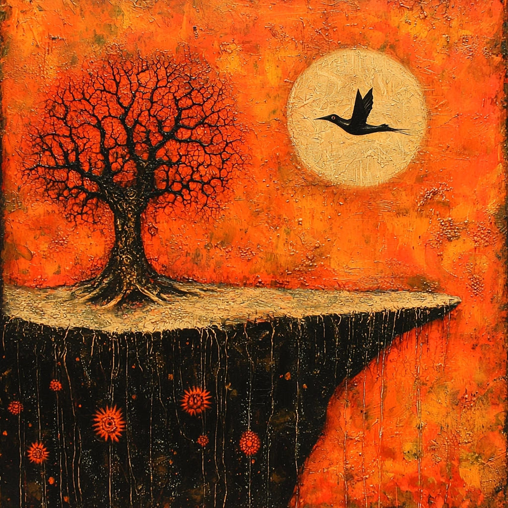 Warm orange hues dominate with stark contrasts creating depth.