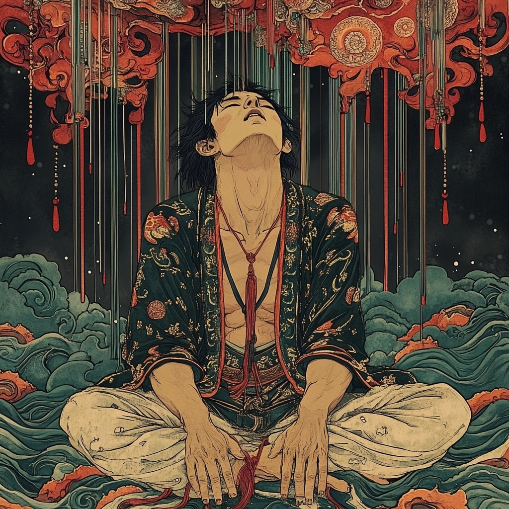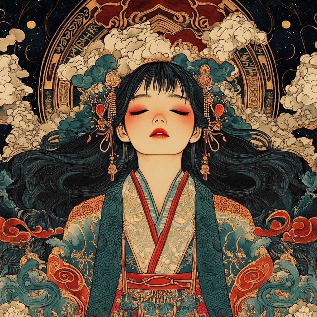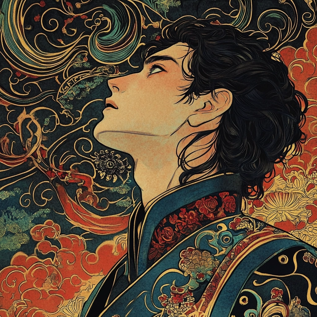 Rich lighting accentuates complex layering of colors, with intricate patterns creating a dynamic spatial depth. Textures are finely detailed, emphasizing the ornate nature of the clothing and backgrounds.