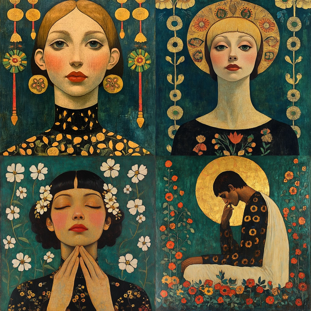 Intricate patterns with rich gold accents on deep green backgrounds.