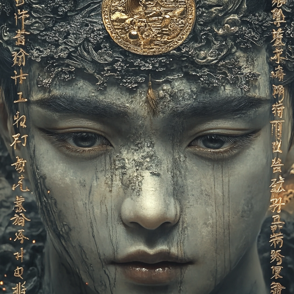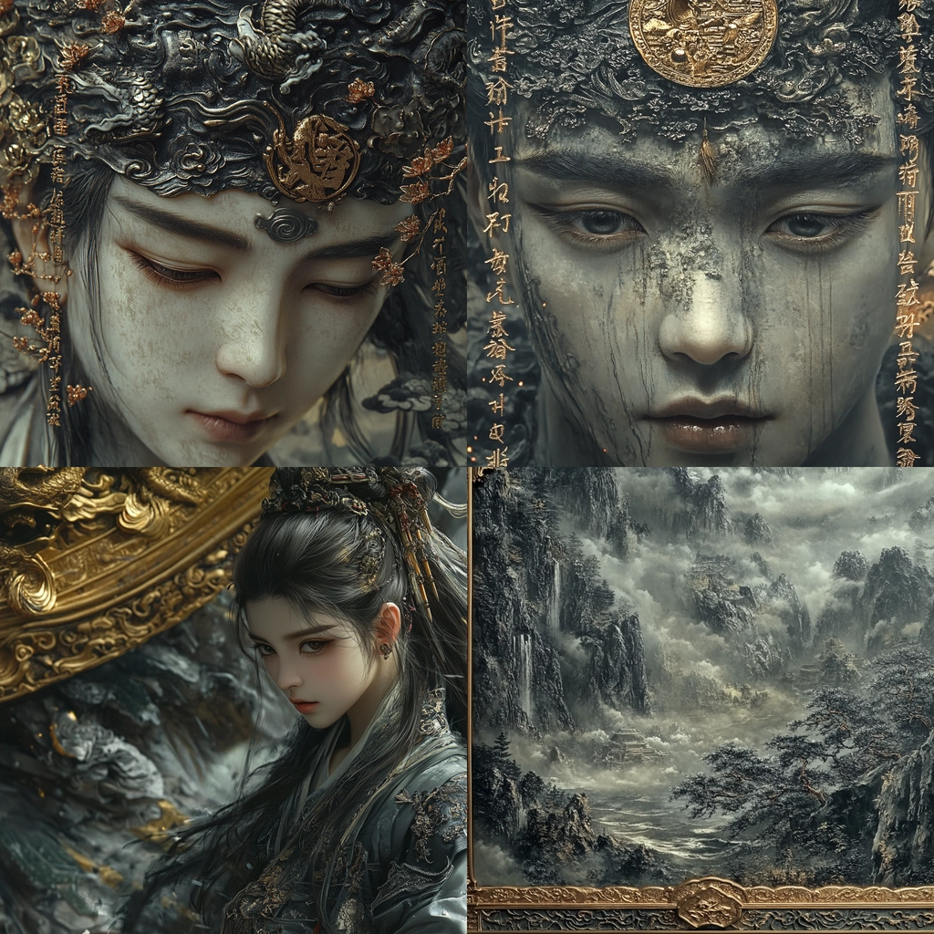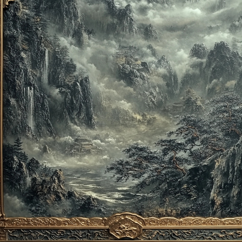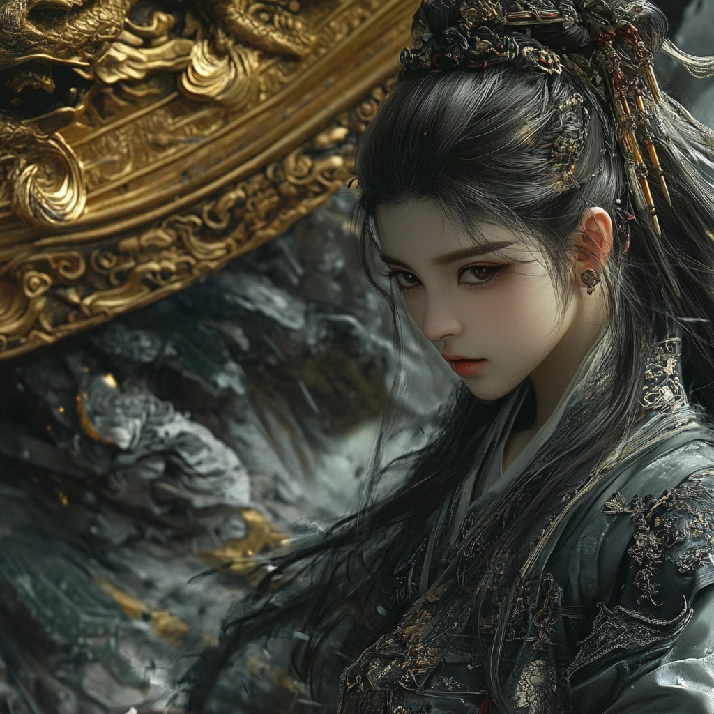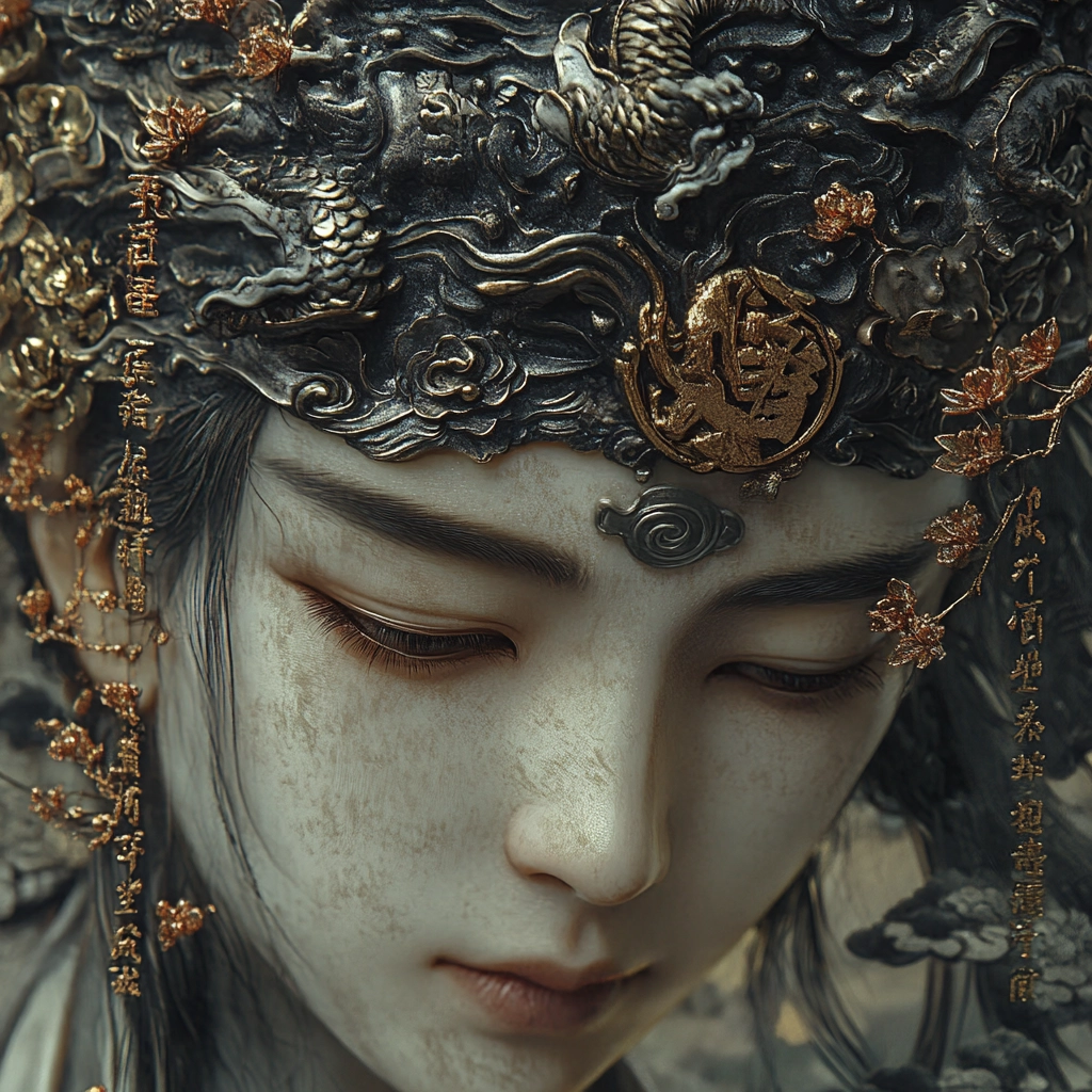 The lighting highlights the fine details of the gold elements against a subtle, dark backdrop. The color palette includes deep blues and grays, creating a sense of depth and complexity. The texture is detailed and rich, with a focus on ornamental work.