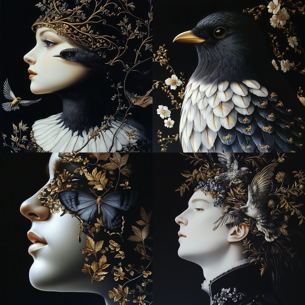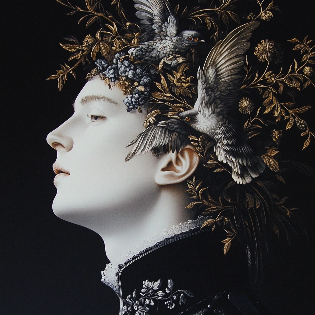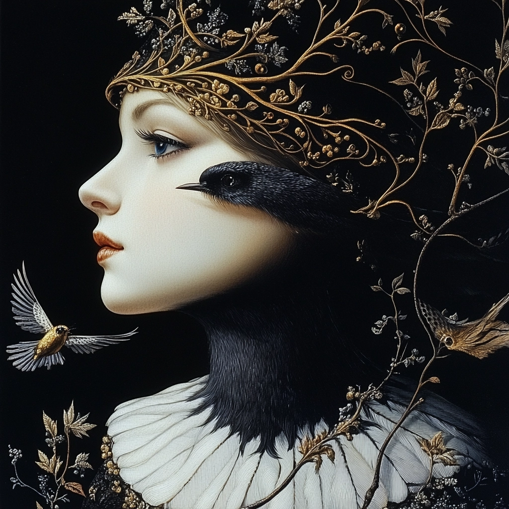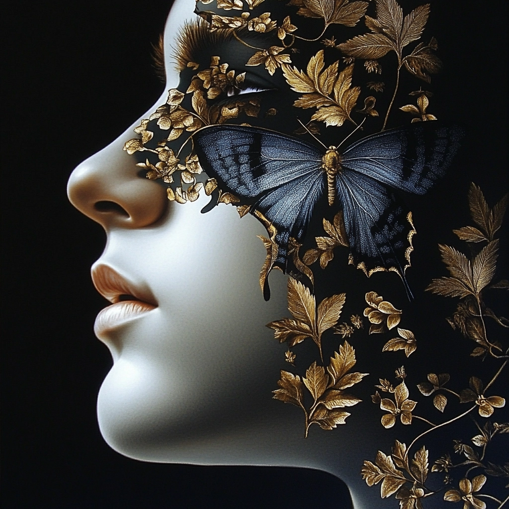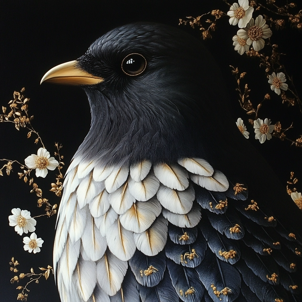 Soft lighting emphasizes delicate gold patterns against a black backdrop. The interplay of white and gold creates a rich, layered texture with a sense of depth and fine detail.