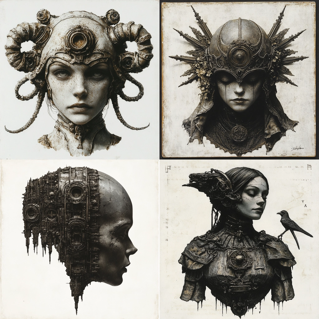 Strong contrasts highlight complex textures of sculpted forms. Delicate details are expertly rendered, providing depth despite a minimal color palette. The images play with perspective and a sense of dimensionality through careful light and shadow distribution.