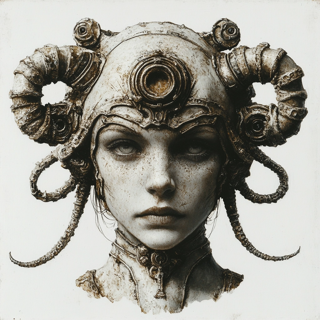 Intricately detailed sculptures in muted tones set against light backgrounds.