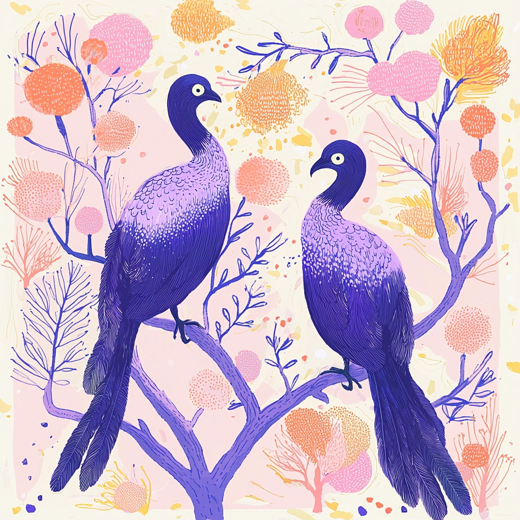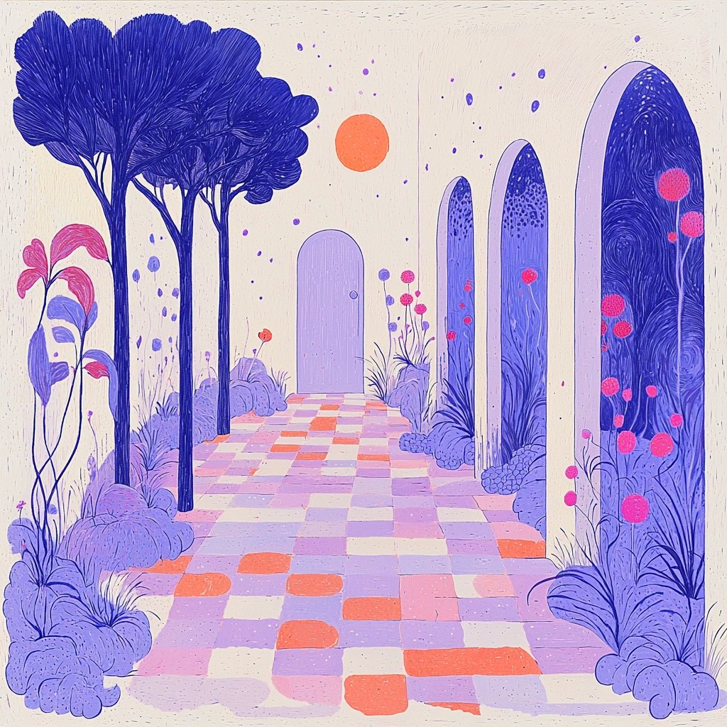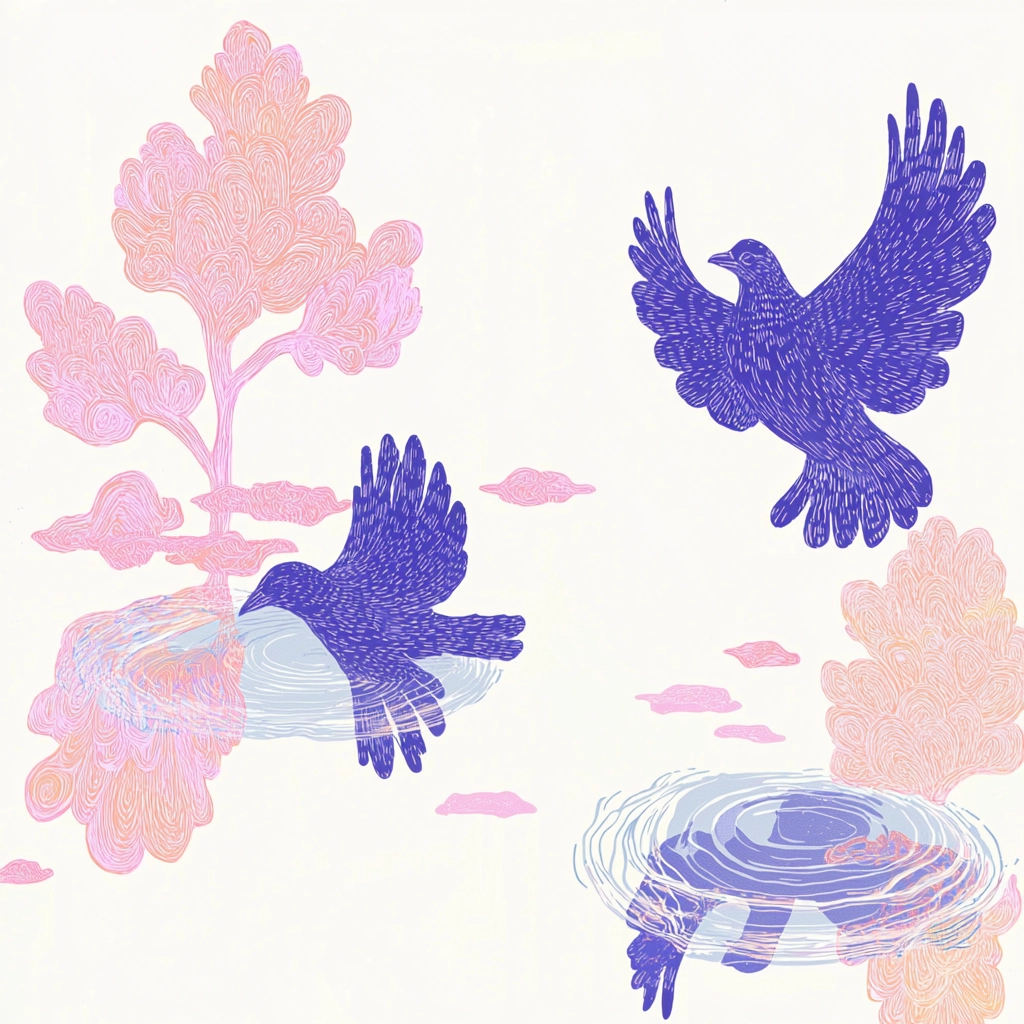 A juxtaposition of soft pastels with bold indigo shapes and fluid lines.