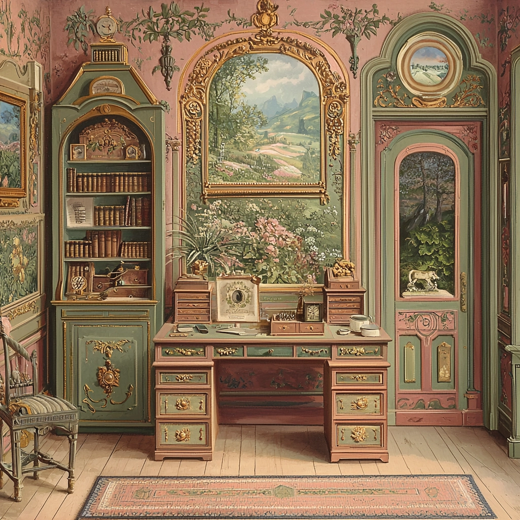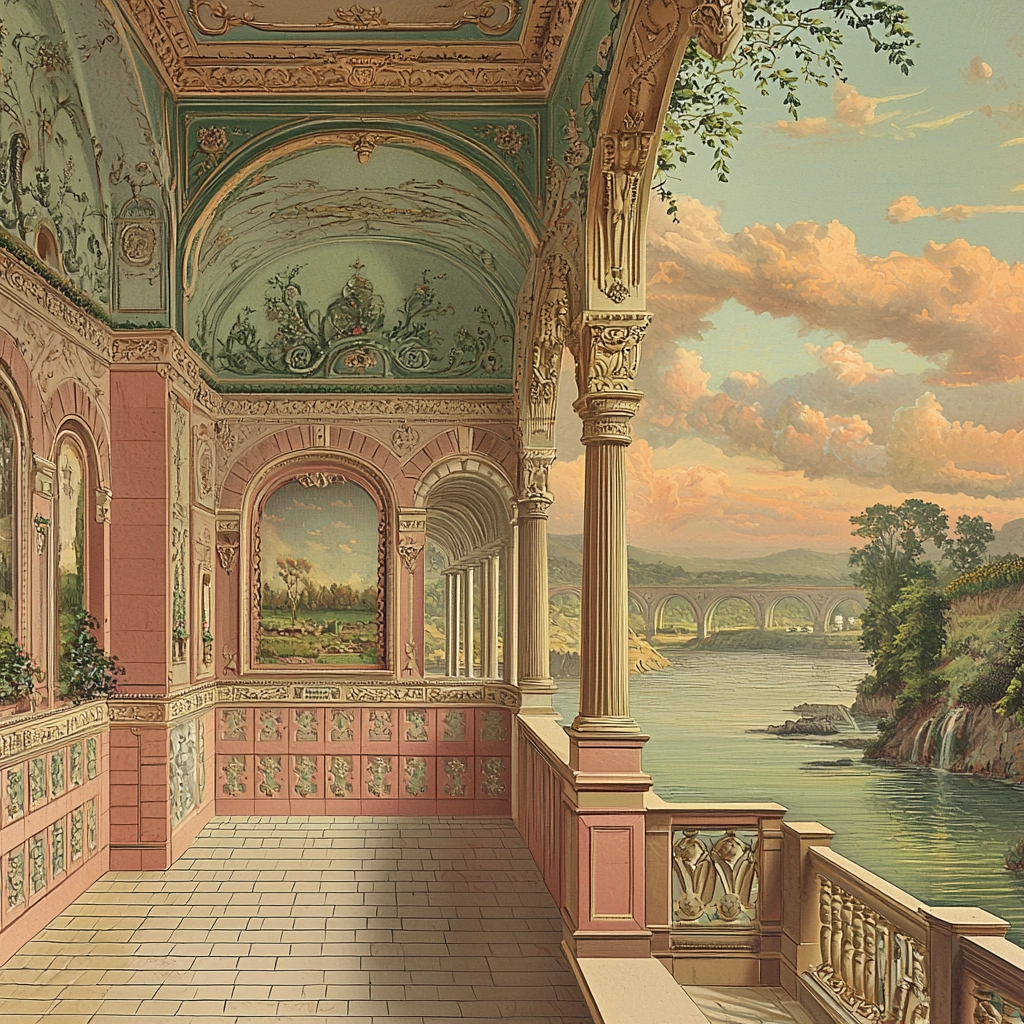 The use of soft, muted lighting and pastel colors creates a serene and detailed atmosphere, with intricate architectural detailing and natural motifs. The textures are smooth and finely rendered, giving a sense of historical elegance and tranquility.